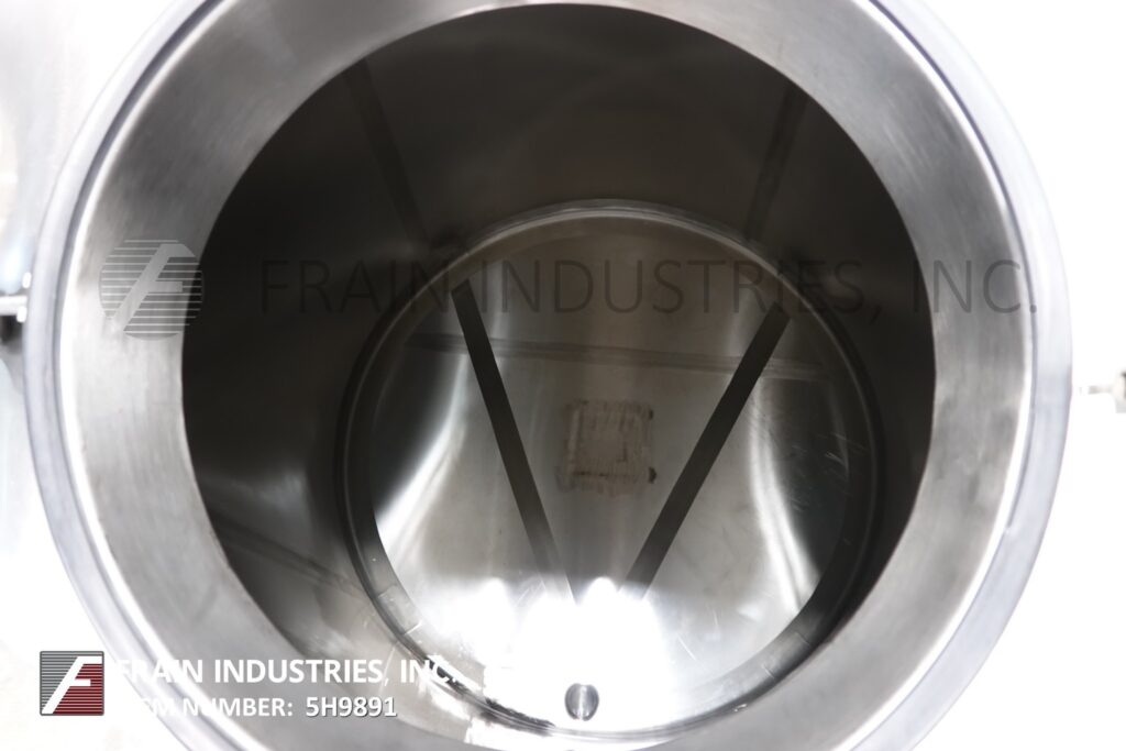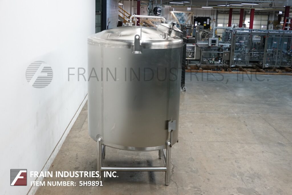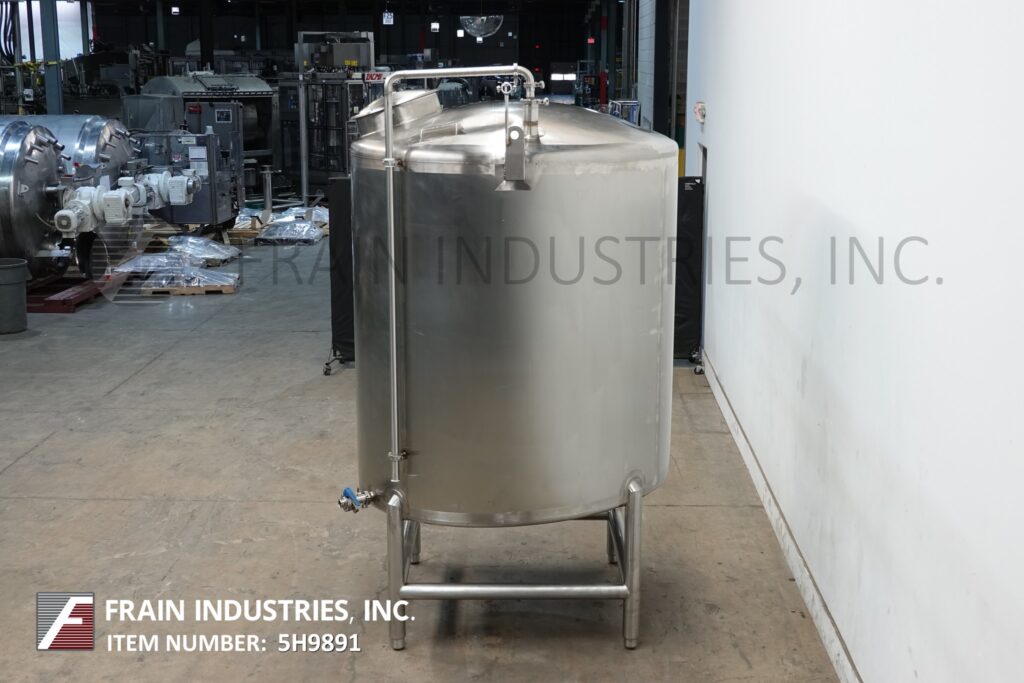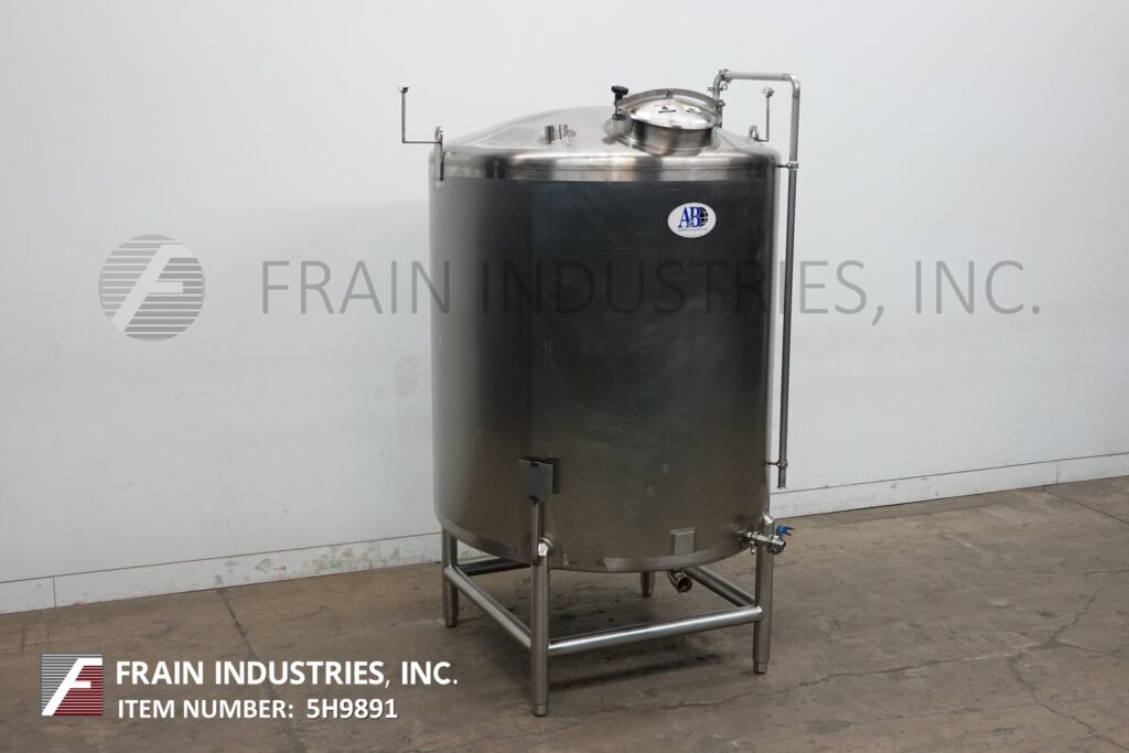 Back to All EquipmentA & B Process Systems, 1000 gallon capacity, 304 stainless steel single wall tank. Vessel dimensions: 70" diameter x 72" straight wall. Equipped with dome top and 18" man way with flip up, bolt down cover. Slant bottom has a 3½" OD / 3" ID Tri-Clamp style bottom discharge with 22½" ground clearance.