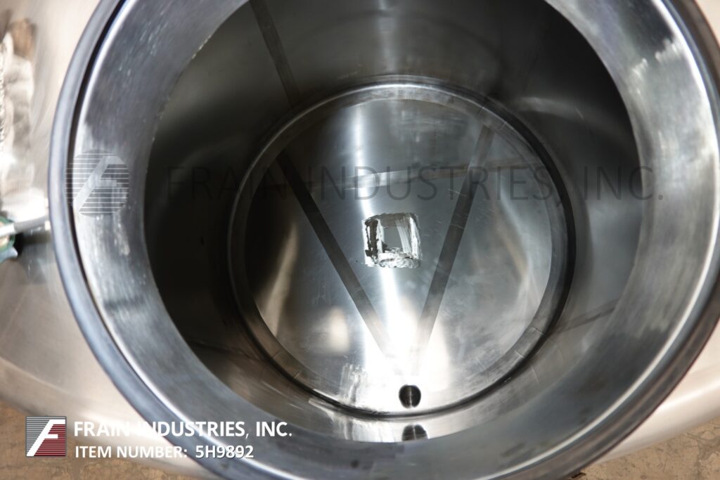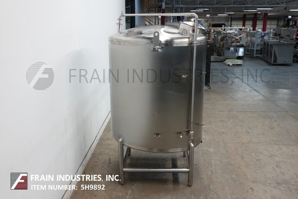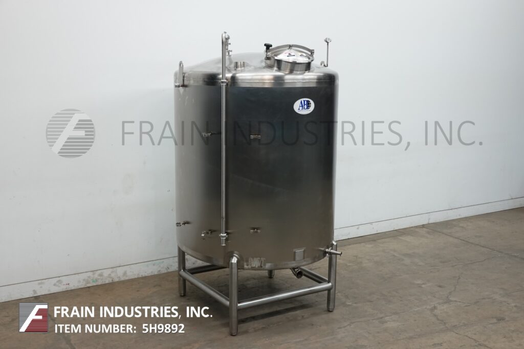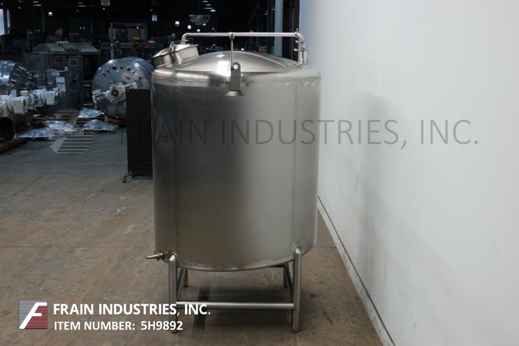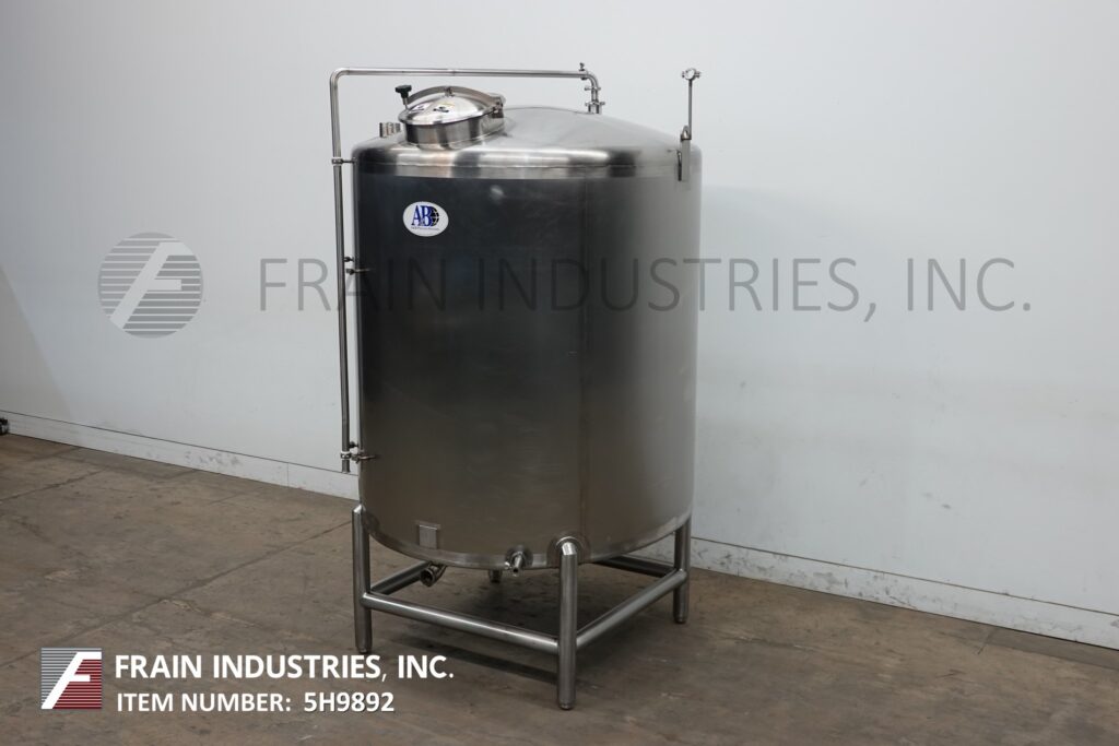 Back to All EquipmentA & B Process Systems, 1000 gallon capacity, 304 stainless steel single wall tank. Vessel dimensions: 70" diameter x 72" straight wall. Equipped with dome top and 18" man way with flip up, bolt down cover. Slant bottom has a 3½" OD / 3" ID Tri-Clamp style bottom discharge with 22½" ground clearance.