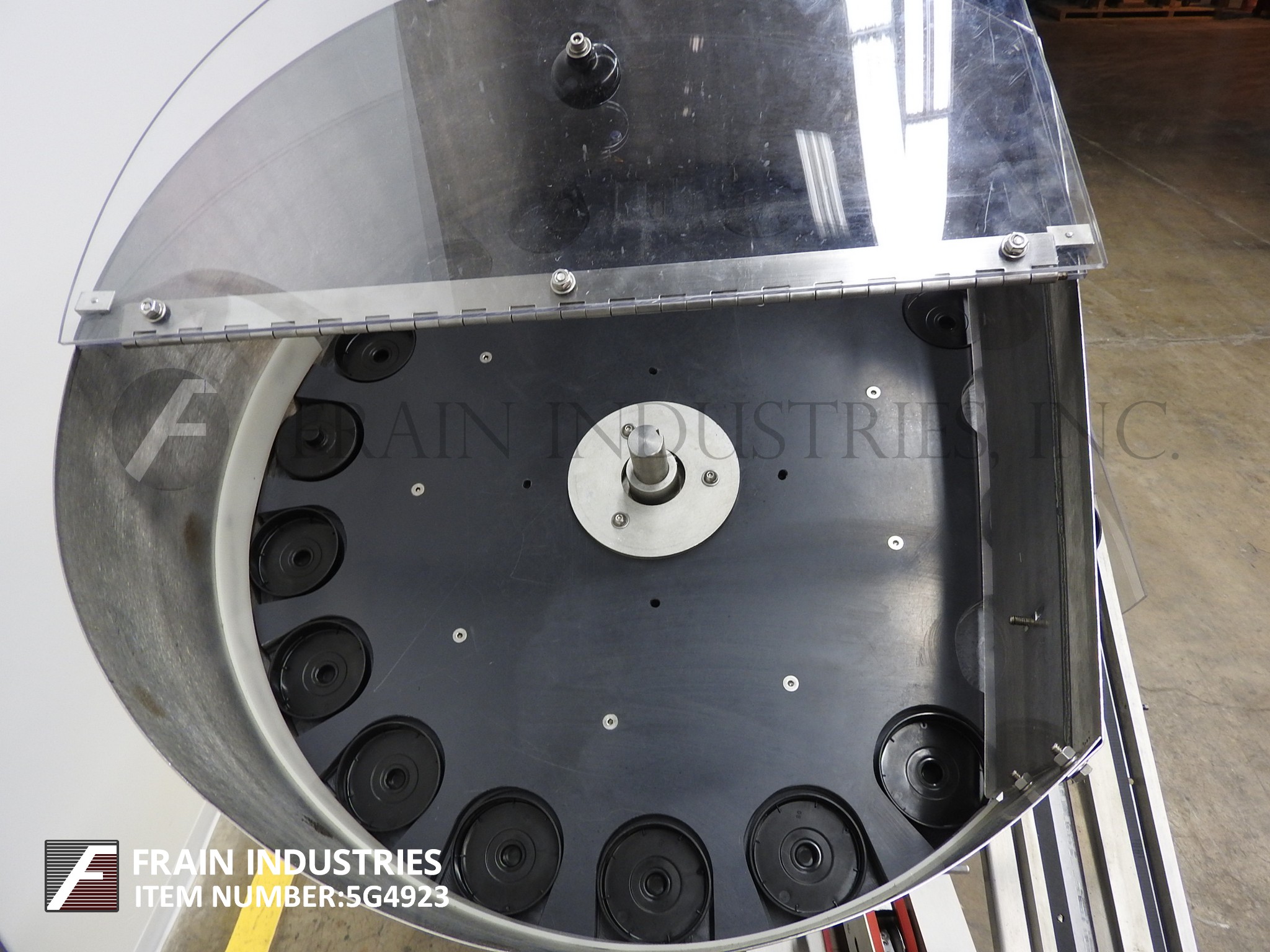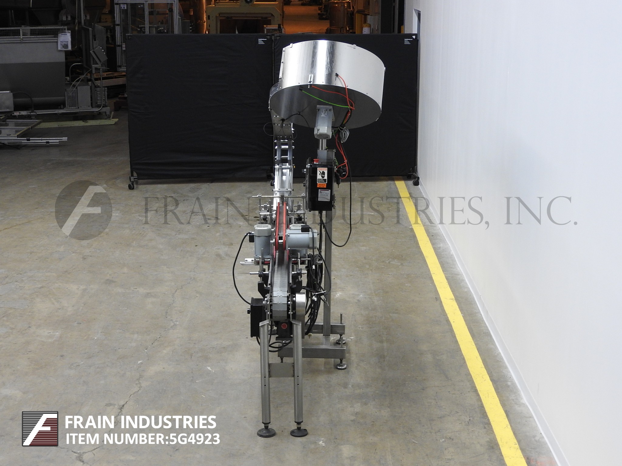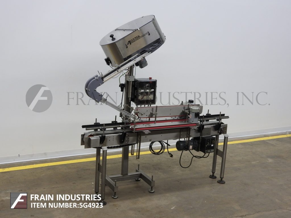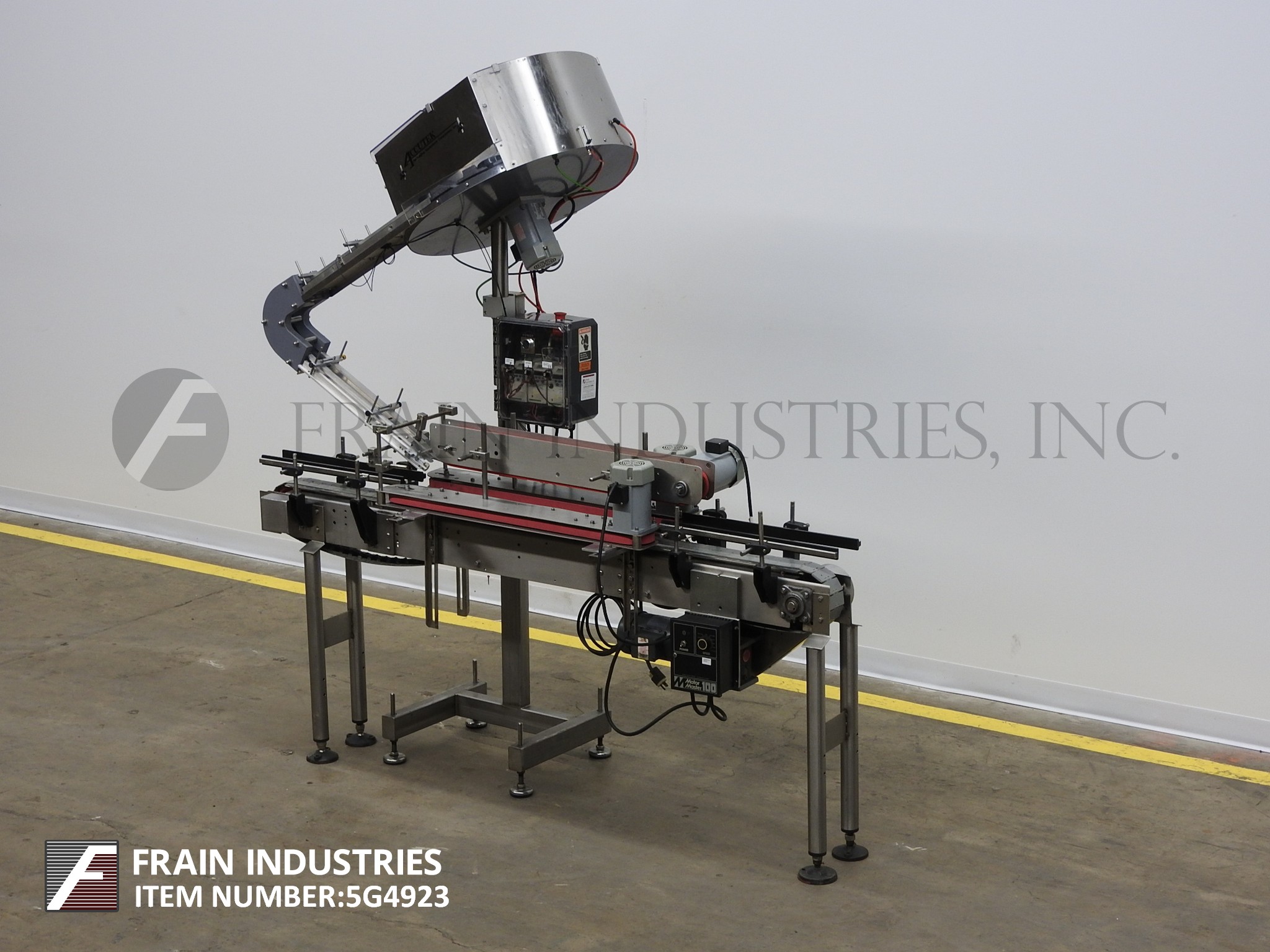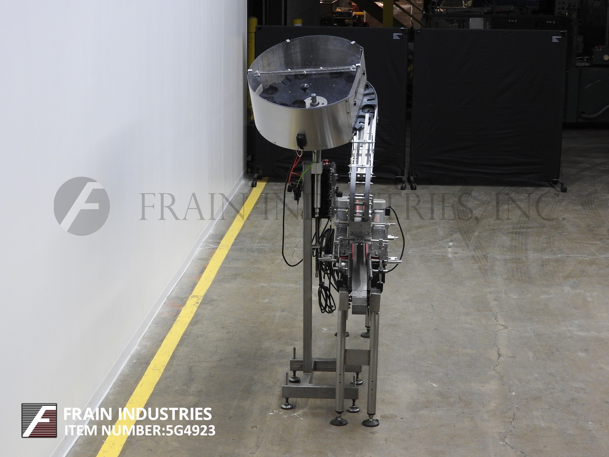 返回所有设备Accutek,型号50-551-000,AccuSnap自动不锈钢卡扣。每分钟20到120个容器 - 取决于材料,应用,环境和机器配置。帽尺寸范围:10毫米至60毫米,盖子纸张类型:牛奶水罐,滴管,唇膏,盖子,更换适当的变化。29“直径X 10”深离心帽进给料斗,带旋转取向器圆盘,盖槽,36“L X 1”W单个容器夹具带和35“L压缩带。控制面板带料斗,夹具输送机速度控制拨号。安装在不锈钢高度可调节底架上,带脚轮,安装在73“长×3¼”宽Delrin风格的输送机上。