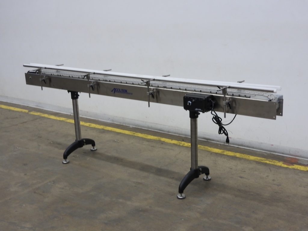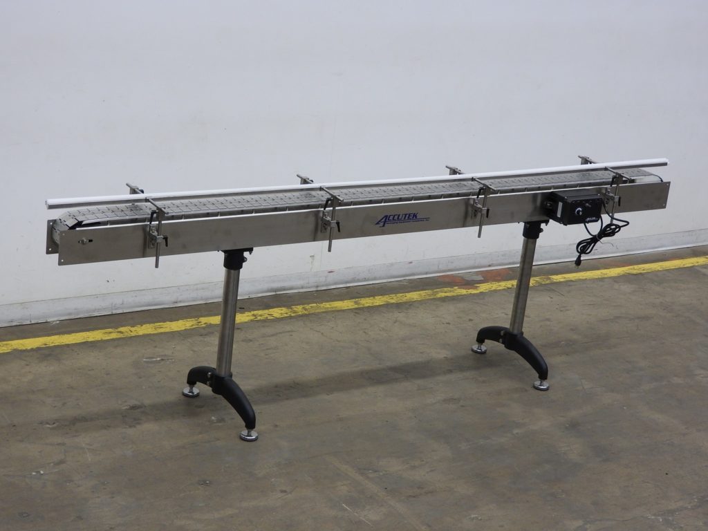 Accutek, 4½“宽x 120”长,不锈钢台面输送机。配备4½“宽x 120”长不锈钢带和进料/出料高度范围32“至36”,并安装在一个(4)腿框架变速控制。