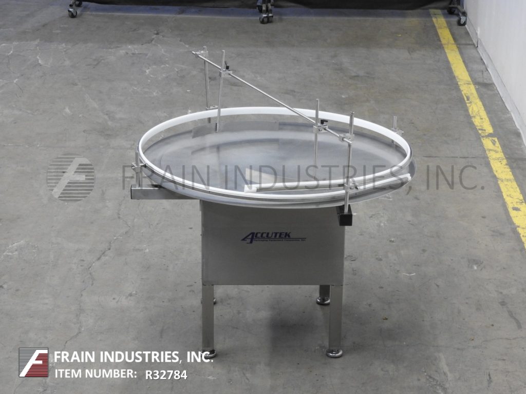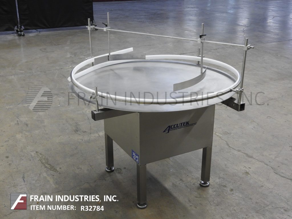 Accutek,直径48",不锈钢,旋转圆盘整理器,每分钟容器数量-取决于材料,应用和机器配置。配备不锈钢48"的圆盘变速控制,可调侧轨和工作台高度为32"至35"。