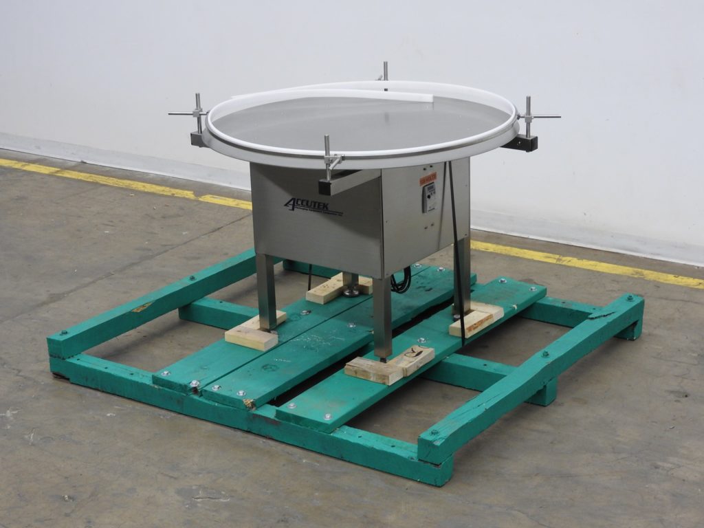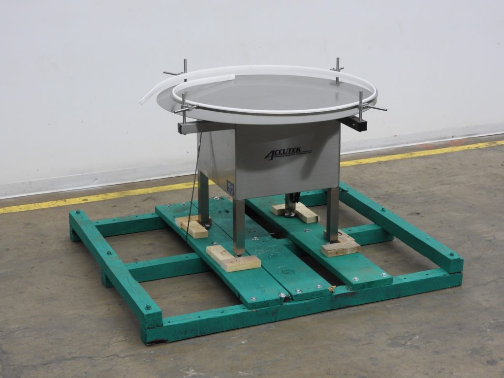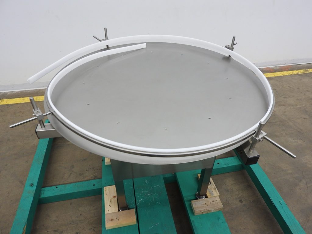 返回所有设备Accutek, 48”外径,不锈钢,旋转式光盘整理器,每分钟容器数量-取决于材料,应用和机器配置。配备不锈钢48"外径盘变速拨号,可调侧轨和工作台高度32"至35"。安装在(4)腿高度可调框架上。