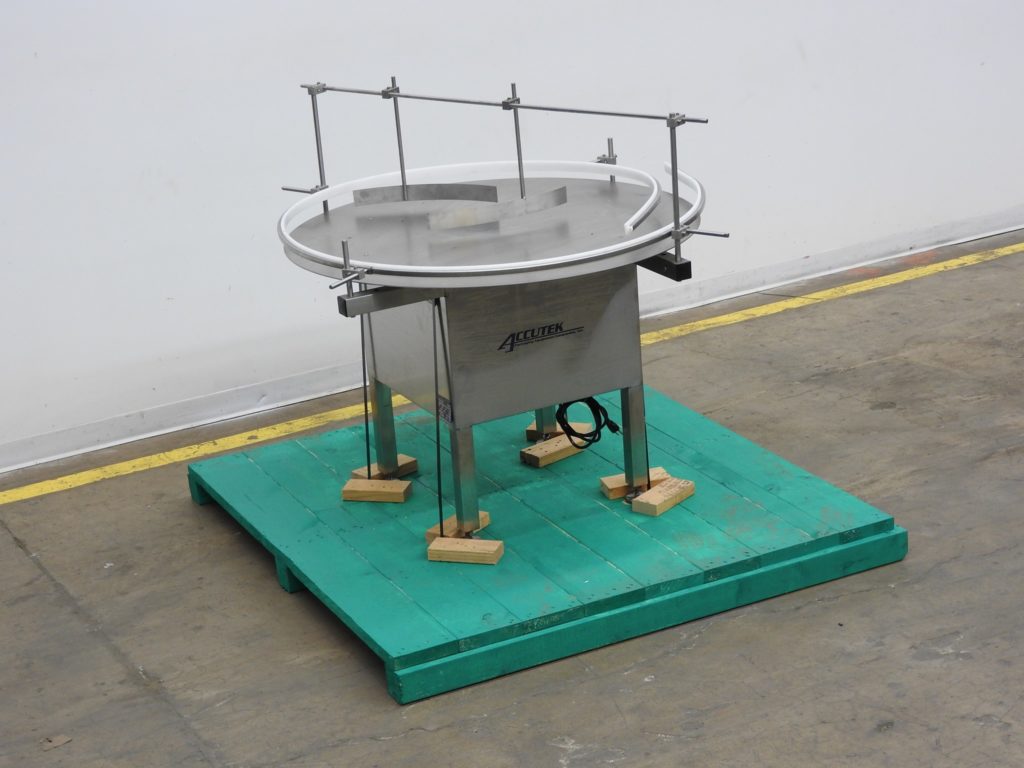 Accutek, 48”外径,不锈钢,旋转式光盘整理器,每分钟容器数量-取决于材料,应用和机器配置。配备不锈钢48"外径盘变速拨号,可调侧轨和工作台高度32"至35"。安装在(4)支腿不锈钢底座上。