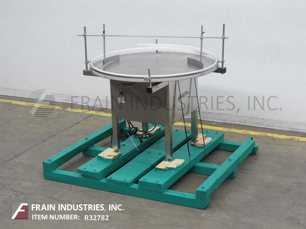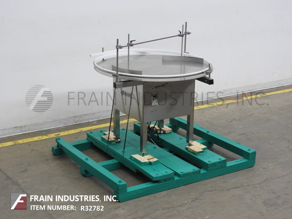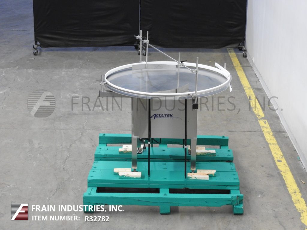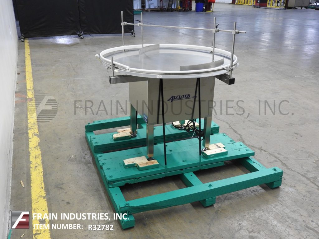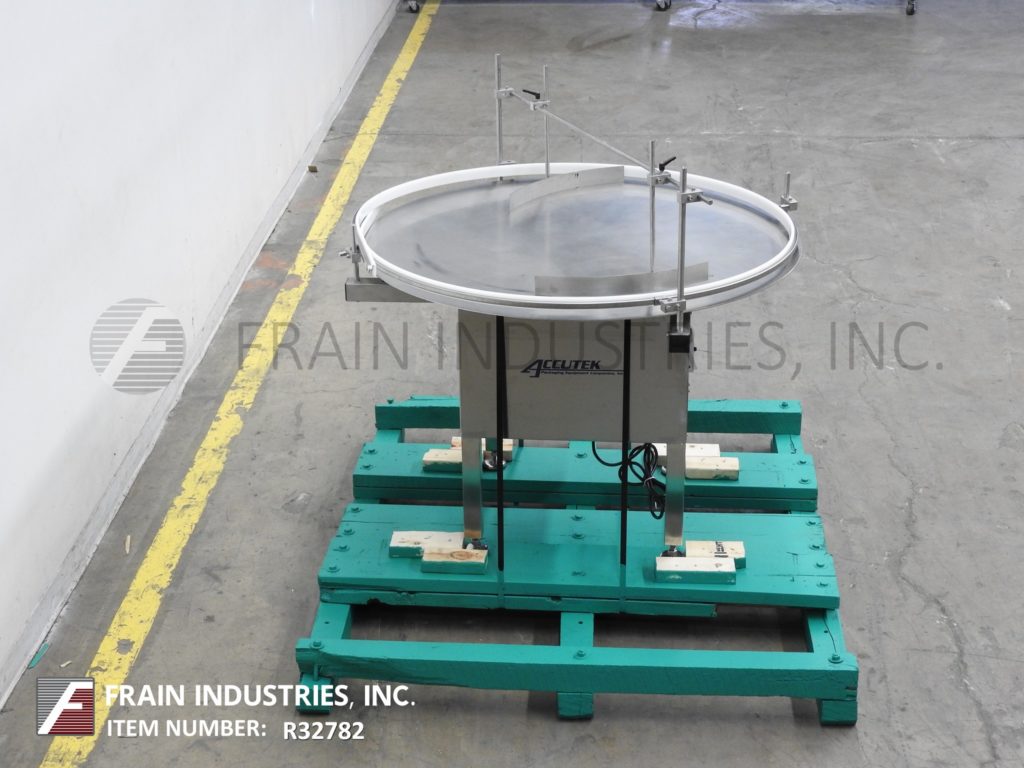 Back to All EquipmentAccutek, 48"diameter, stainless steel, rotary disc unscrambler with number of containers per minute – depending on materials, application and machine configuration. Equipped with stainless steel 48" disc with variable speed control, adjustable side rails and a table height of 32" to 35".