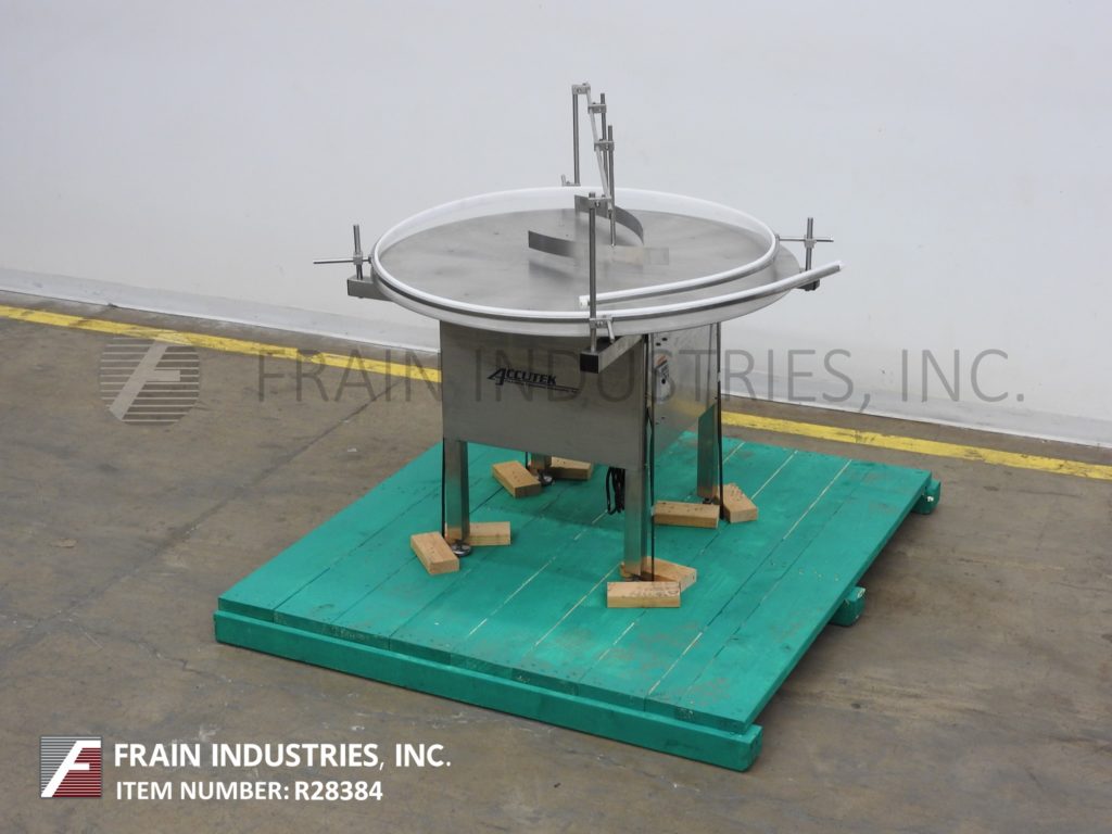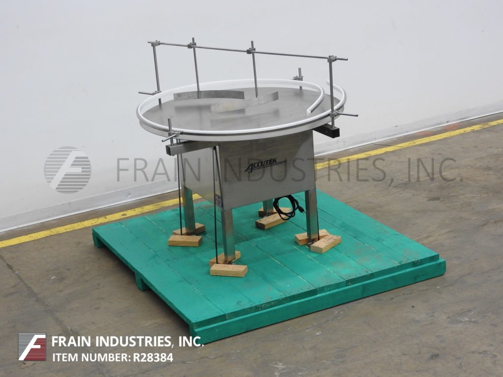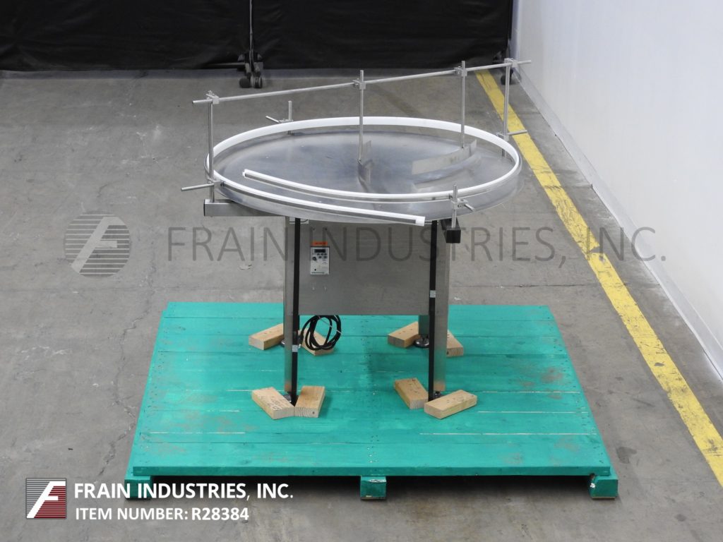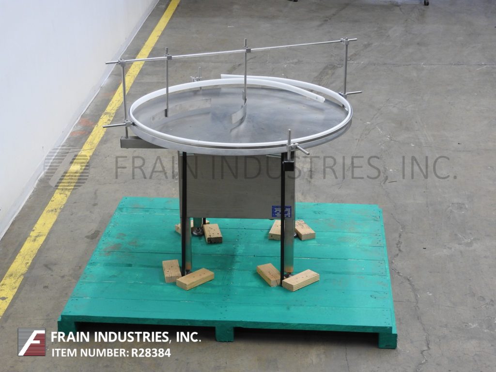 返回所有设备Quadtutek,型号28-048-aca,不锈钢,变速,48英寸“直径盘解开台。配备48”圆盘,可调节产品导轨和带(2)取向器的架空棒。32“至36”进给/放电高度范围和具有变速控制的1/10 HP电机驱动。安装在不锈钢基架上,具有(4)高度可调腿。