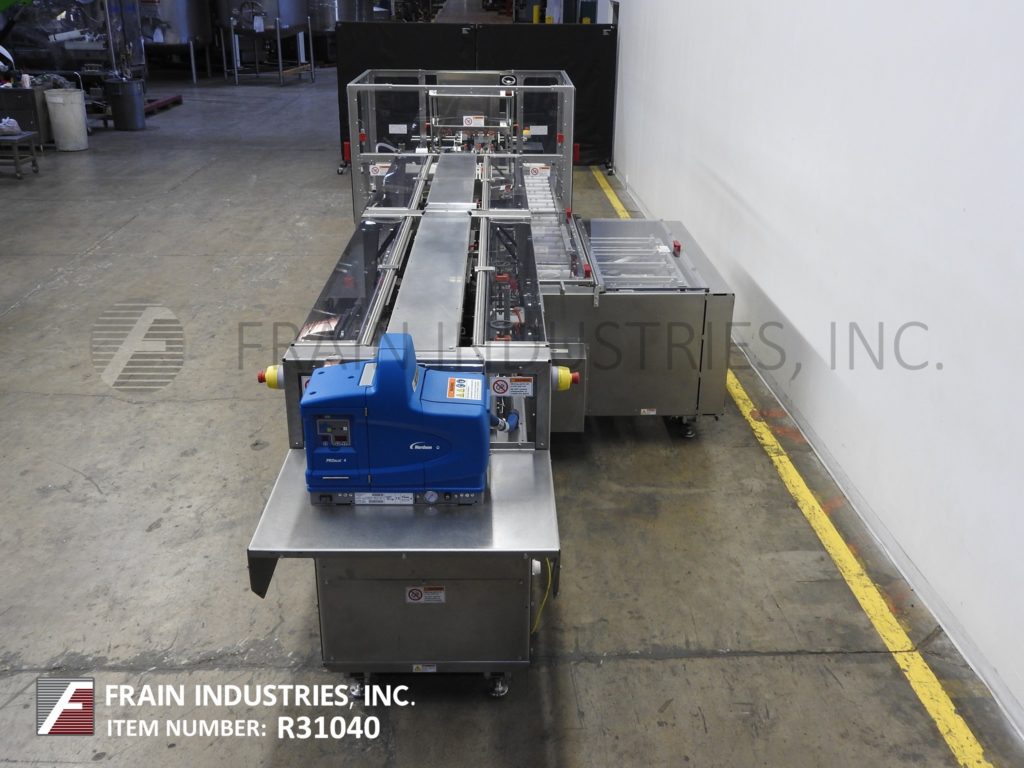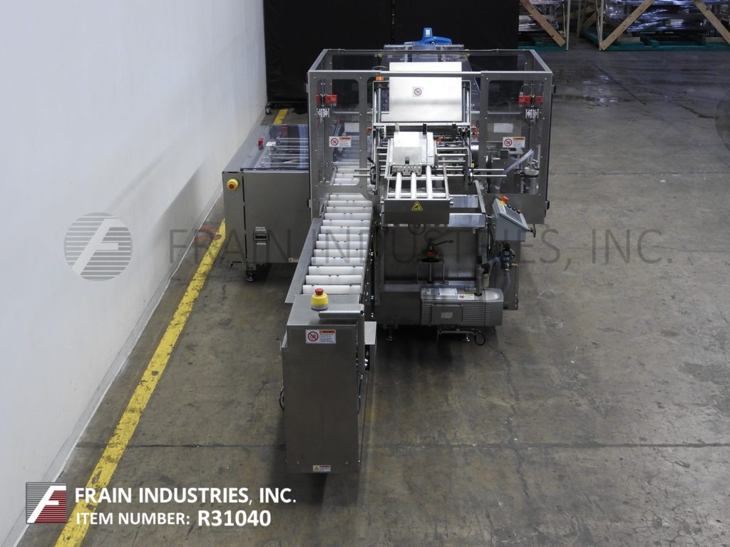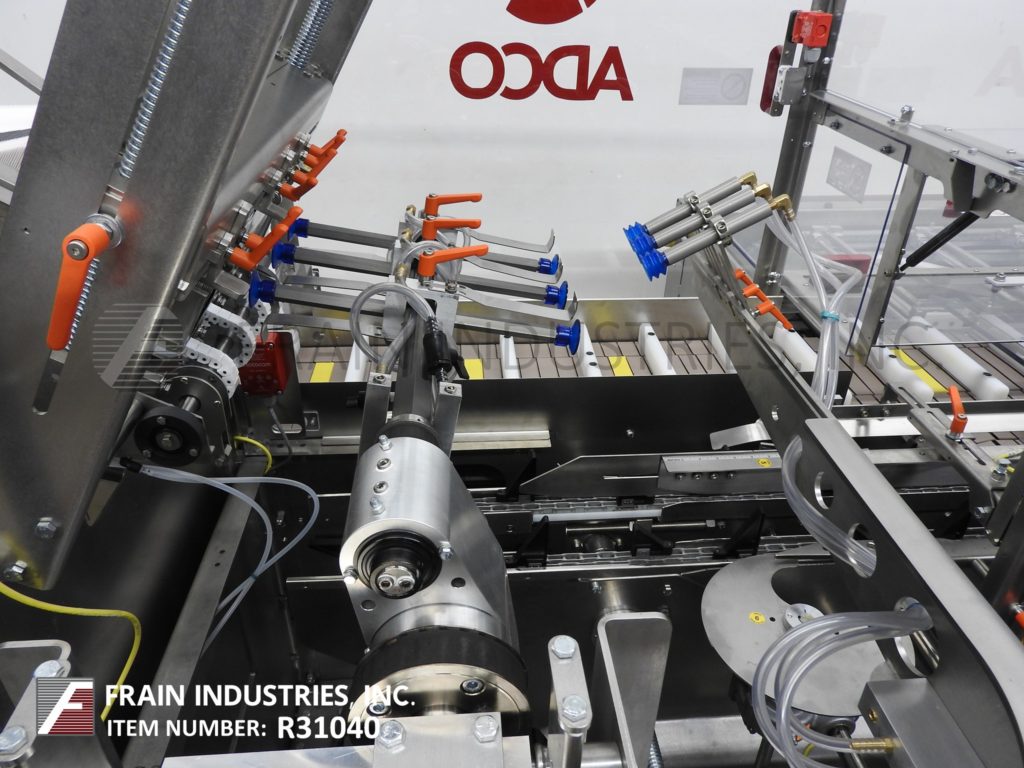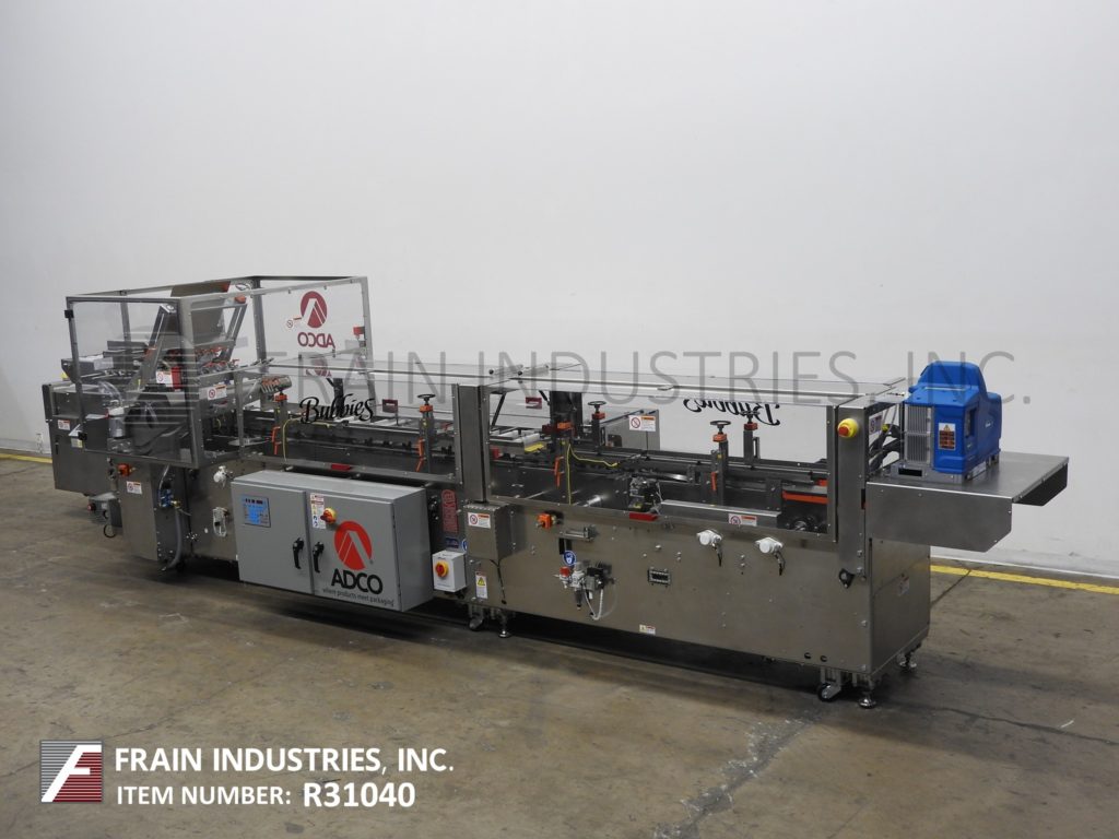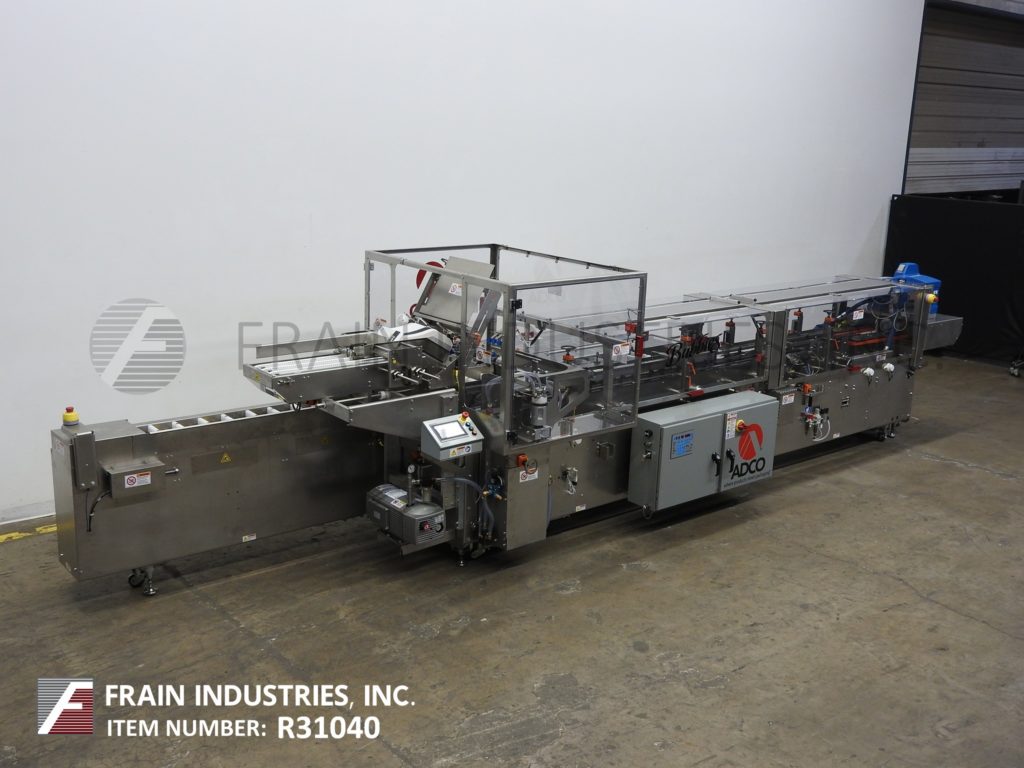 返回所有设备Adco, 15DBC105-SS型,全自动,水平,连续运动,全不锈钢结构热熔胶盒。每分钟可装25到120箱-取决于材料和应用。纸箱尺寸范围:1"至9½"长度;3¾“至4”宽度4.5“至12”深度。配备(4)可调链设置在12"中心3½"高耳。48"长(3)带自动空白纸箱杂志,(2)头轨道picn -place与预破,顶部方正装置,桶凸轮产品装载机,诺德森Problue热熔胶系统,主要和minor flap关闭,Seko调整仪表和32"长双侧带卸料输送机。控制面板有A/B PLC和A/B panel view触摸屏HMI。安装在不锈钢底座框架上,采用联锁安全防护,脚轮和调平腿。