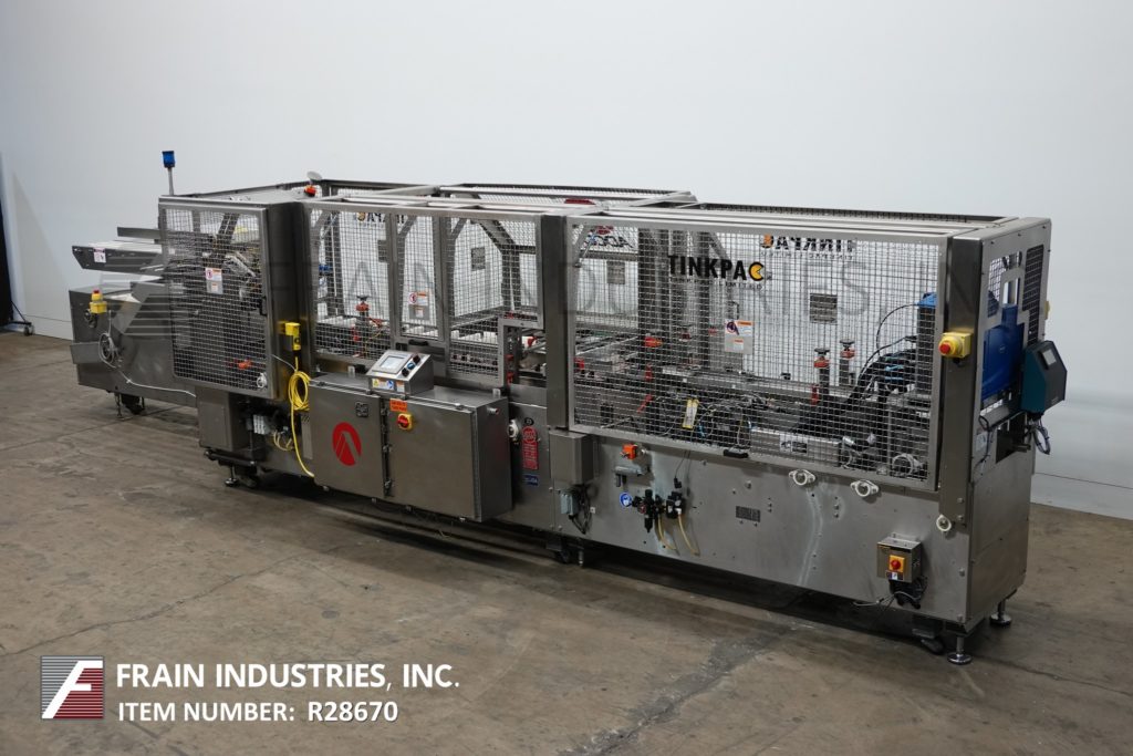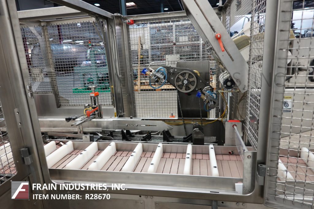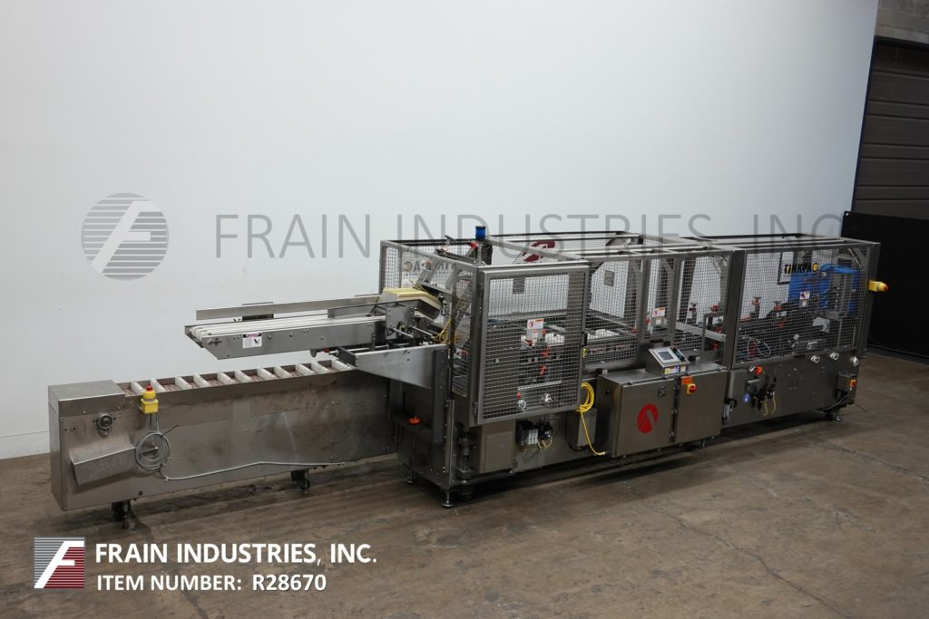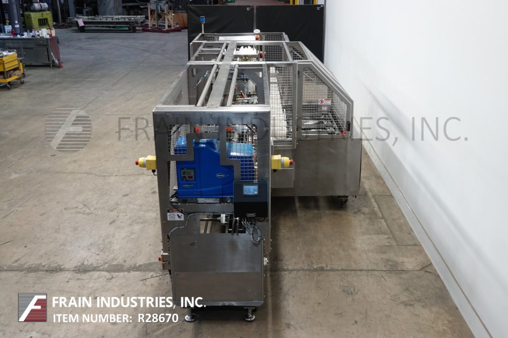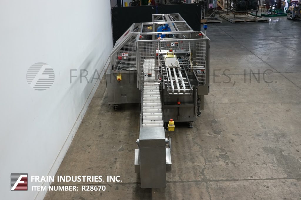 Back to All EquipmentAdco Model 15DBC105-WD, automatic, horizontal, continuous motion, stainless steel construction, wipe down, hot melt glue cartoner, rated from 25 to 120 cartons per minute – depending on materials and application. Carton size range: 1-1/2" to 9-1/2" in length x 3/4" to 3" in Width x 4" to 12" in Depth. Equipped with (4) chains adjustable set on 12" centers with 2-1/2" wide x 3-1/2" high lugs. 60" long (3) belt automatic blank carton magazine, (2) head rotary pic-n-place, top squaring device, barrel cam product loader, Nordson Problue hot melt glue system, major and minor flap closers, Seko adjustment gauges and 55" long lugged top carton assist conveyor set on 12" centers. Control panel has A/B PLC with A/B Panelview. Mounted on stainless steel base frame with interlock cage style safety guarding, casters and leveling legs.