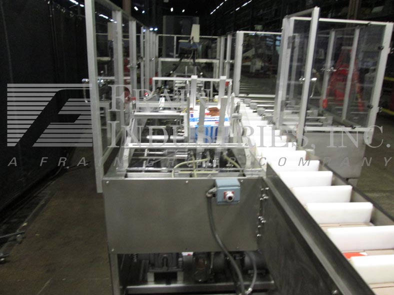 返回所有设备自动水平连续运动不锈钢纸箱速度从40至80 cpm -速度取决于材料和应用。纸箱尺寸范围:1"至10"长度;3/4"到4"宽度;深度6英寸到10英寸。两链系统设置在12"中心。配备纸箱杂志,往复挑选和放置纸箱饲料,可调13 '长的产品饲料输送机,桶凸轮装载机,无产品无纸箱检测,诺森热熔和Lexan保护。