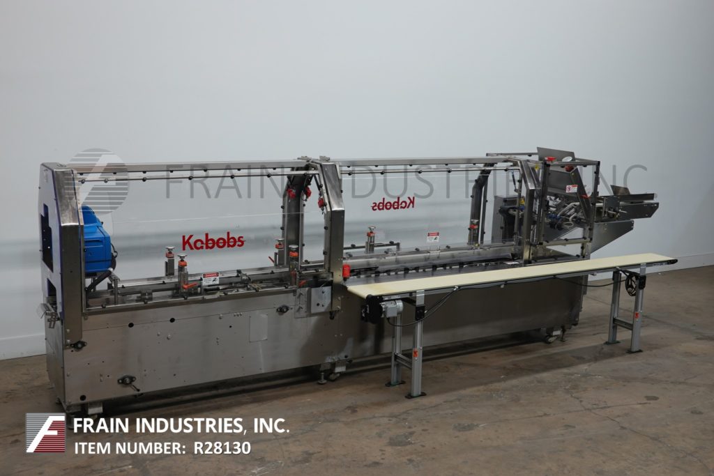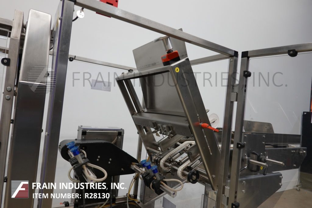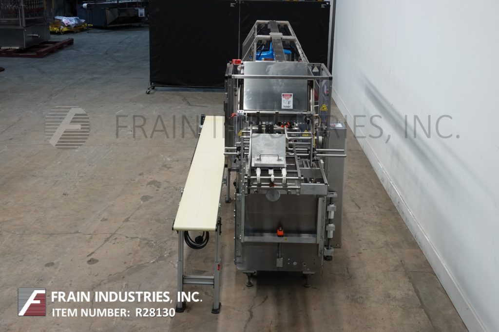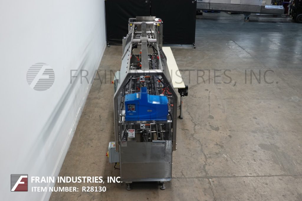 Back to All EquipmentAdco, Model 15D105-SS, semi automatic, stainless steel, horizontal, hot melt glue cartoner. Carton size range: 1" to 9½" in Length; ¾" to 4½" in Width; 4½" to 11" in Depth. Equipped with (4) chains adjustable set on 12" centers, with 2½" wide x 3½" high lugs, powered carton magazine, two head rotary vacuum pick and place, top carton hold down rail, 72" long operator load area with 12" wide x 120" long product conveyor, forming plows and flap tuckers, Nordson hot melt glue system, Seco gauges and interlock flip-up safety guarding. A/B controller, variable-speed,E-Stop and foot pedal jog. Mounted on a stainless steel base frame with casters and leveling legs. Speed dependant on materials, application and machine configuration.