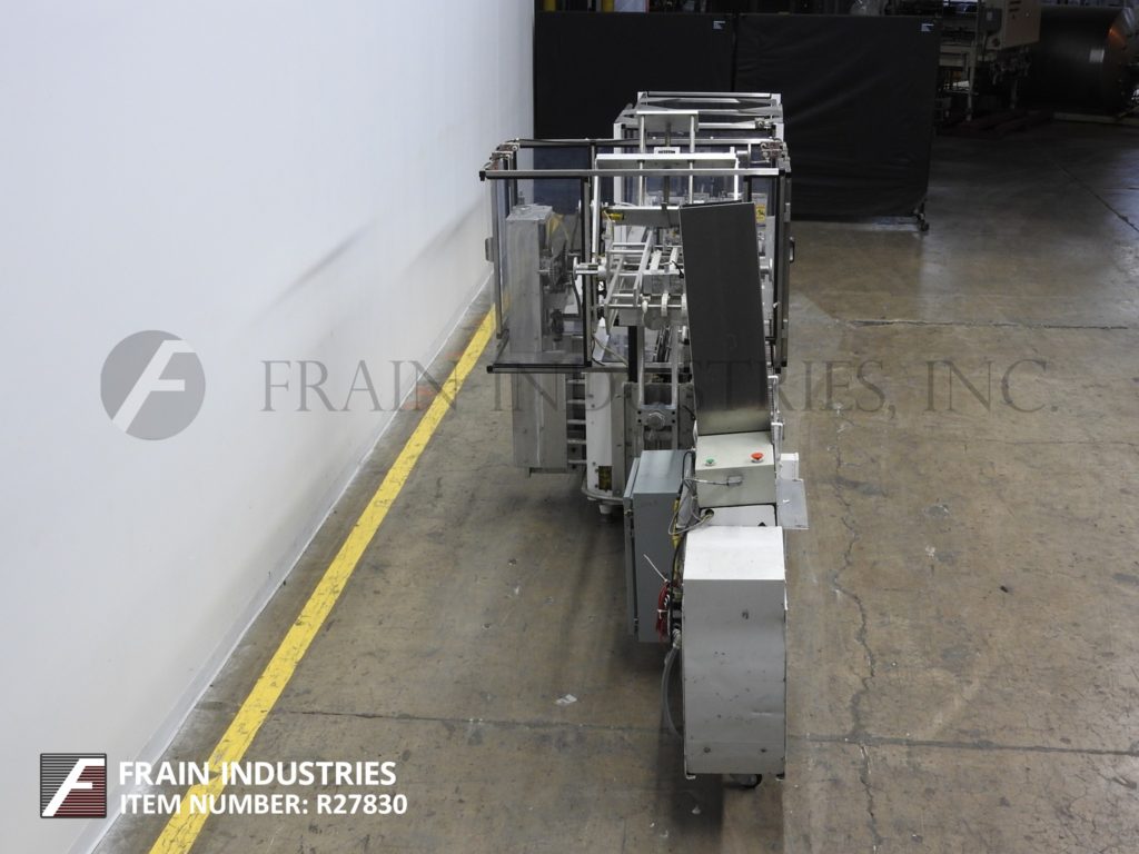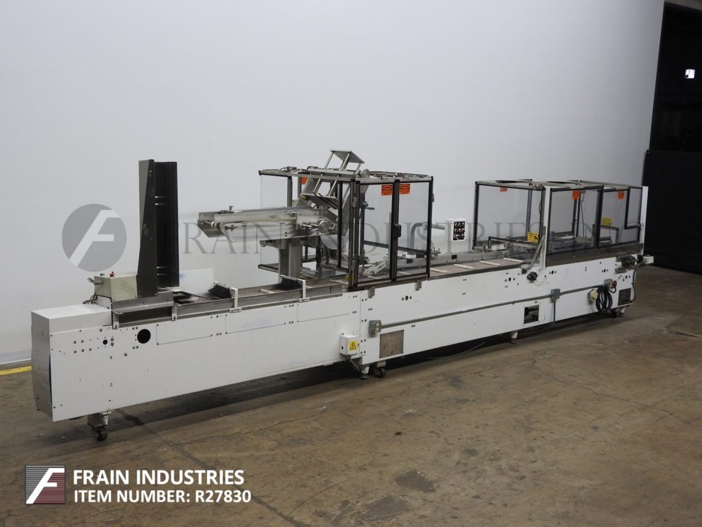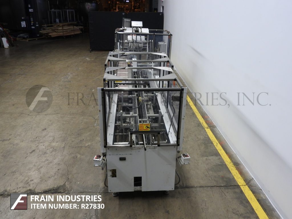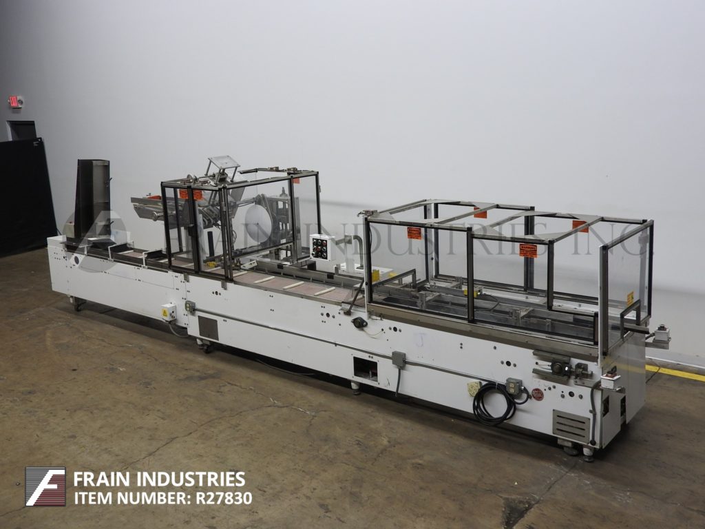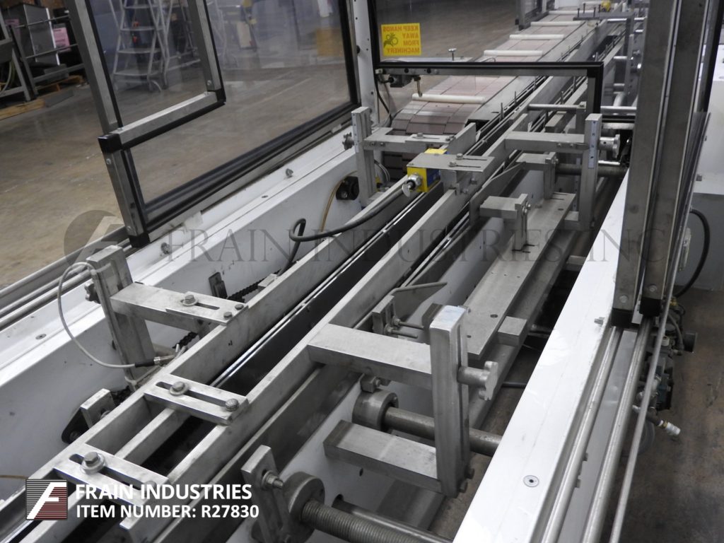返回所有设备ADCO,型号15D100-ES,半自动,持续运动,水平,热熔胶,盒装。每分钟25到120纸盒 - 取决于材料,应用,机器配置和操作员灵活性。4个链可调在15英寸中心设置,1½“宽x 2”高凸耳。纸箱尺寸范围:1“至13-1 / 2”的长度;¾“到4”宽度;4½“到12”深度。Equipped with 183" long x 10" wide cleated product feed conveyor with 10" long x 1" wide x 3/4" high cleats and product magazine, 44" long automatic blank carton magazine, 2 head rotary vacuum pick and place, top carton hold down rail, 54" long hand loading area, with Nordson hot melt glue system, flap closers, vacuum pump with interlock safety guarding and hand held jog controller. Control panel AB CPU, with on / off controls, run, jog, vacuum, hopper, and glue switches with start, stop, e-stop push button controls, and conveyor speed control dial. Mounted on a heavy duty base frame with casters and height adjustable legs.