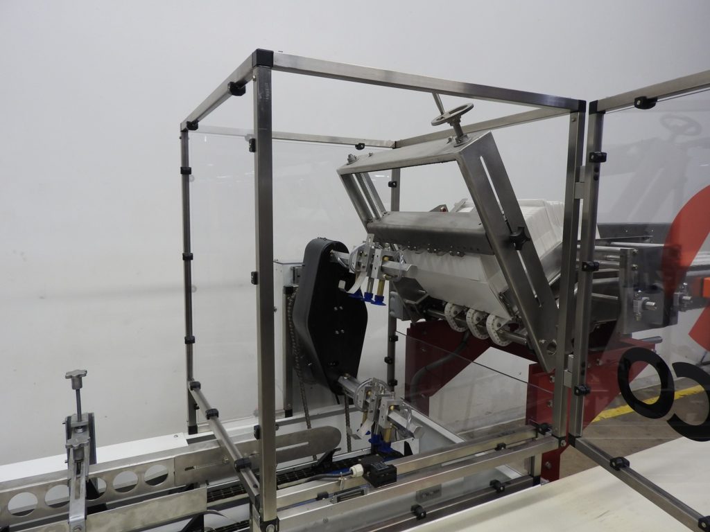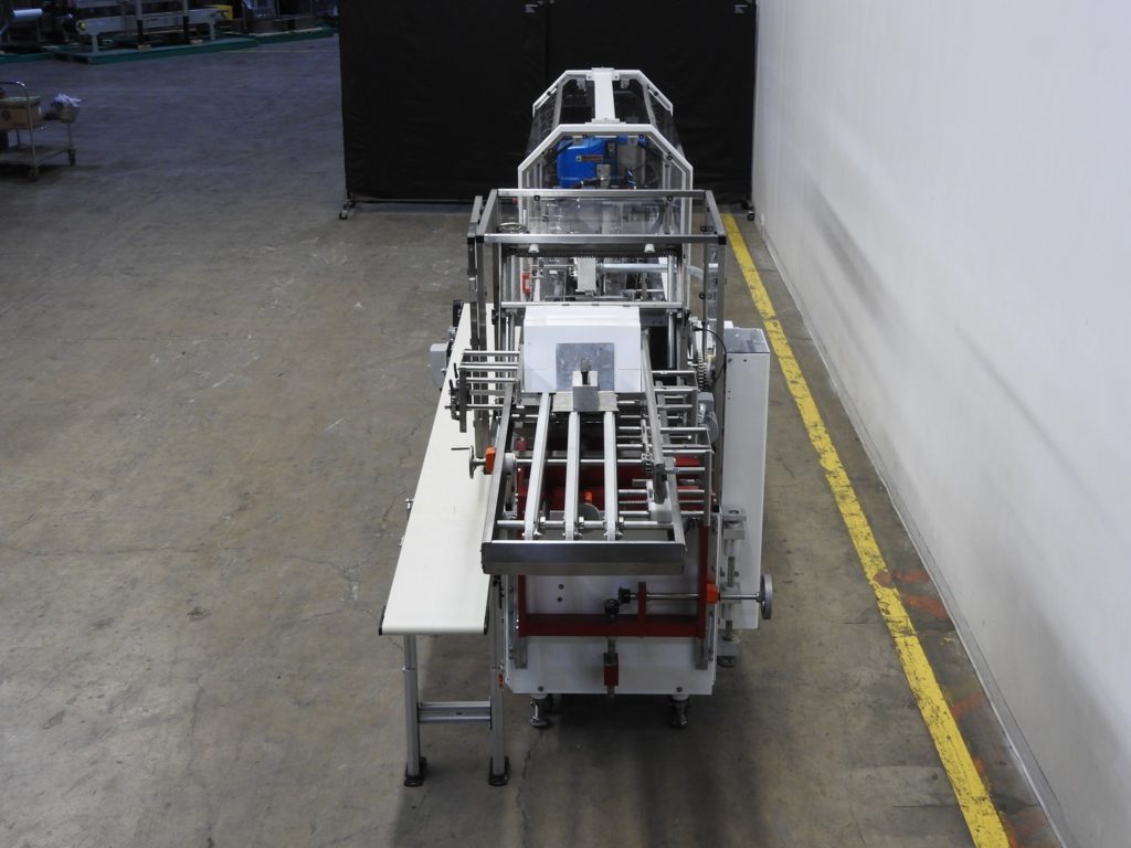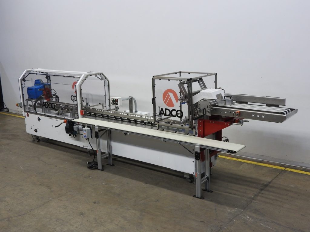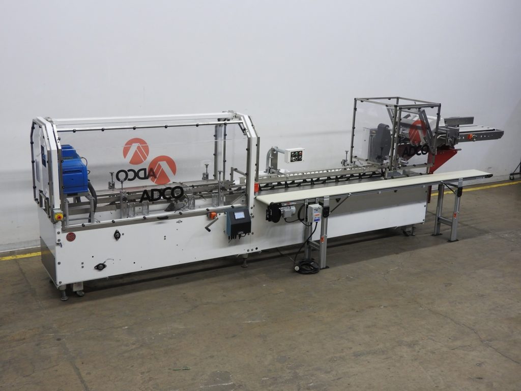返回所有设备ADCO Model 15d105EC,半自动,水平,热熔胶胶卷纸盒每分钟25至125箱 - 取决于材料,应用和操作员灵活性。纸箱尺寸范围:1“至9”的长度;3/4“至4”的宽度;4“到12”深度。配备(4)链可调节12“中心,2英寸宽x 3-1 / 2”高凸耳。36“长时间的自动空白纸箱盒装(2)头旋转真空镐和放置,顶纸盒载有轨道那80" long operator load area, Nordson hot melt glue system, flap tuckers and seko gauges. Control panel has relay logic controller and operator control panel with main, hot melt and vacuum system on / off switches, start, stop, e-stop push buttons and foot pedal jog. Mounted on heavy duty frame with interlock safety guarding and leveling legs with casters.
