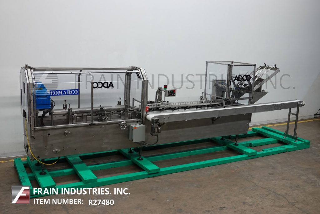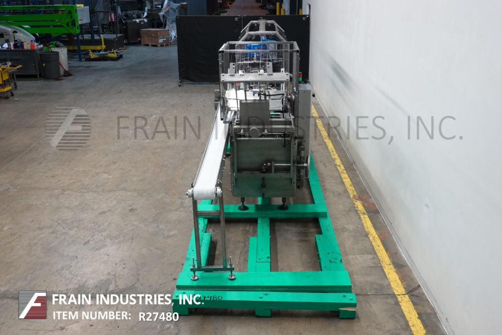 返回所有设备Adco, 15D105-SS型,不锈钢,半自动,卧式,热熔胶,制盒机。根据材料、应用、机器配置和操作熟练程度,每分钟可装25至120箱。纸箱尺寸范围:1"至9½"长度;3 / 4”到4”宽度;深度4½“至12”。配备neopreme产品进料输送机,(4)链可调设置“½中心,”12日宽x 3½”高凸耳,36“长空白纸箱杂志,2头旋转真空选择和地点,纸箱按住铁路、76“长手产品装载区,形成犁和皮瓣照别人,诺信热胶系统,联锁安全防护。控制面板上有按钮启动,停止,e-stop控制,开/关开关的胶水,真空和脚踏板。安装在不锈钢底座框架与脚轮。