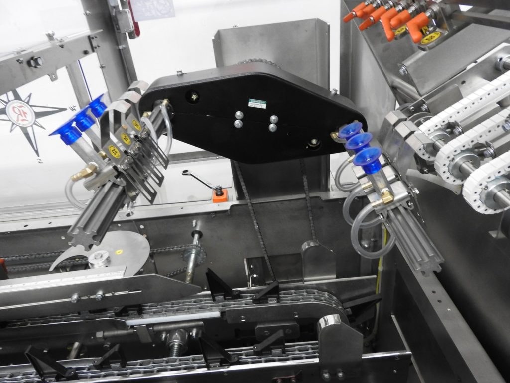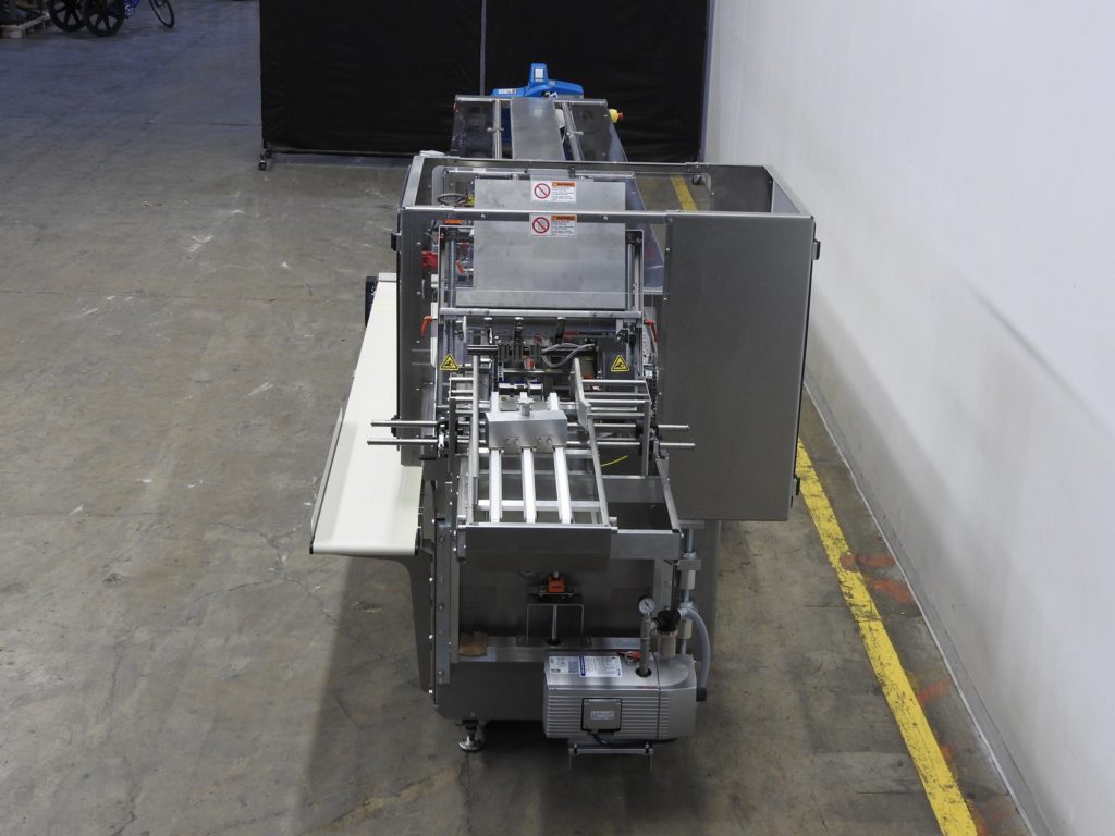 Back to All EquipmentAdco, Model 15D105SS, Semi automatic, stainless steel, horizontal, continuous motion, hot melt glue cartoner rated from 25 to 120 cartons per minute – depending on materials, application, machine configuration and operator dexterity. Carton size range: 1" to 9.5" in Length; 3/4" to 4" in Width; 4" to 12" in Depth. Equipped with (4) chains adjustable set on 12" centers with 2-1/2" wide x 3-1/2" high lugs, 48" long carton magazine, (2) head rotary vacuum pick and place, top carton hold down rail, 119" long x 12" wide product in feed conveyor with 72" long operator hand load area, Nordson ProBlue hot melt glue system, flap closers and 24" long side compression discharge belts, Seco gauges with interlock flip-up safety guarding. Control panel has A/B relay logic controller with A/B VFD controls, start, stop, e-stop push buttons, on / off switches for hot melt glue and oiless vacuum systems. Foot pedal activated carton feed controls. Mounted on stainless steel frame with casters and leveling legs.