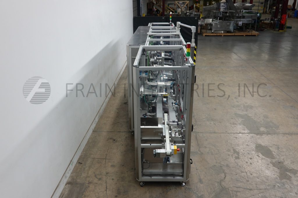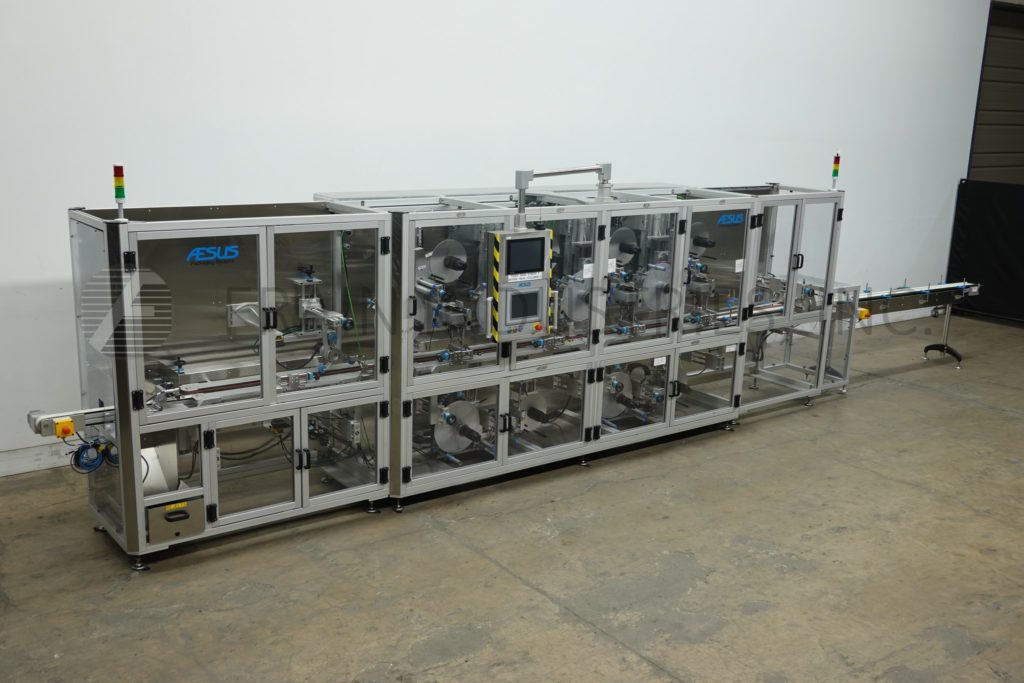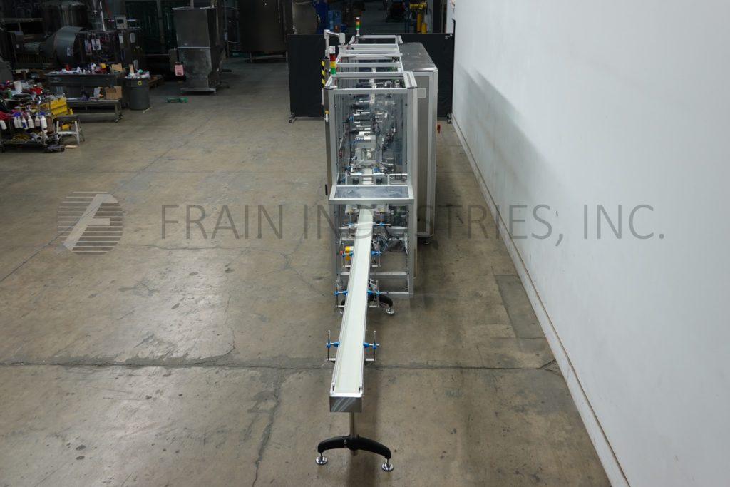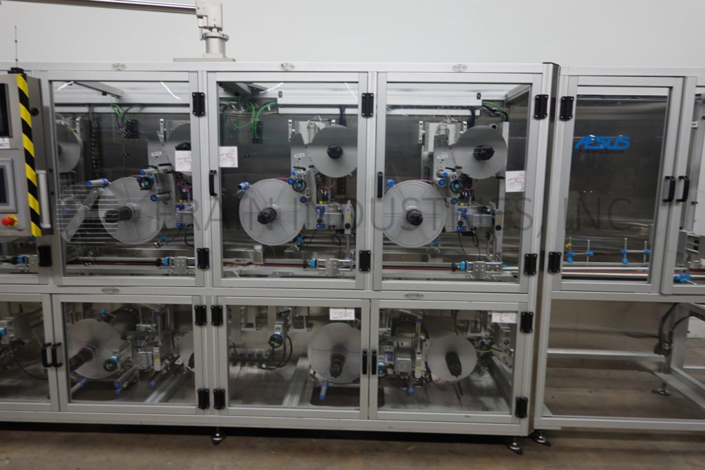 Back to All EquipmentAesus, Model Premier, Top and bottom, high speed, pressure sensitive carton labeler. Rated from 1.600" to 4.700" with 0.08" to 0.12" gap width range and up to 280 cartons per minute – depending on materials and application. Equipped with 124" long infeed conveyor and 206" long thru labeler carton conveyor with a combination of (6) Herma Model 400 wipe on label heads (4) on top and (2) on bottom that apply pressures sensitive labels to the product (size of labels per application) with a redundancy system that allows you to manually switch to second label head when principal label head is low or did not apply label and has 12" OD label reel on 3" OD core and 64" long discharge conveyor with 16" long dual side belt compression section and has operating temperatures of 32 Deg F to 176 Deg F with a maximum humidity rating of 35% to 85% free of condinsation and has IP66 type protection system with vision cameras, high speed rejection and confirmation. Control panel has A/B PLC controller with A/B swivel HMI touch screen controls. and start, stop, reset, e-stops buttons and statis light bars. Mounted on heavy duty frame with interlock safety door guarding.