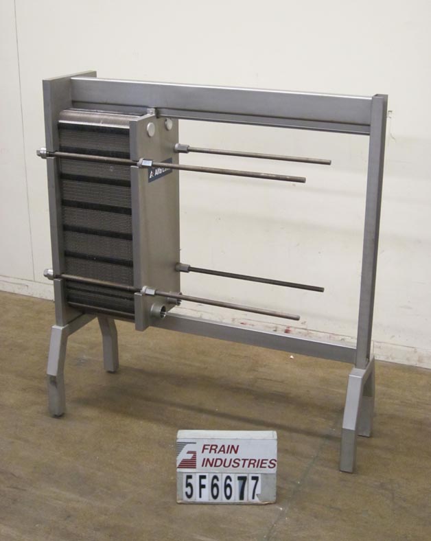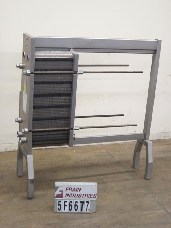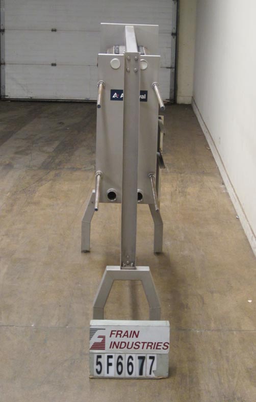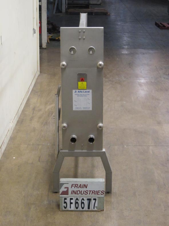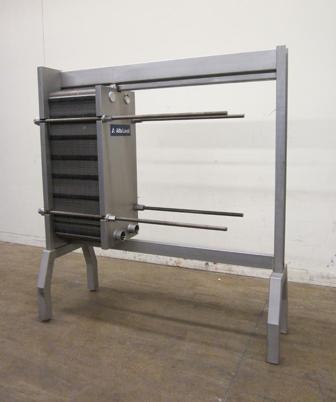 返回所有设备阿法拉伐316不锈钢,板框式换热器,传热面积423.75英尺²。板尺寸:49-3/16" x 14-3/4";0.7毫米厚。表面面积每板:3.75英尺²。目前设有113个板块,最多可达312个板块。额定压力:高达145 psi。温度等级:高达230°F。连接方式:3”卫浴风格。符合3A级卫生标准。安装在不锈钢框架上。
