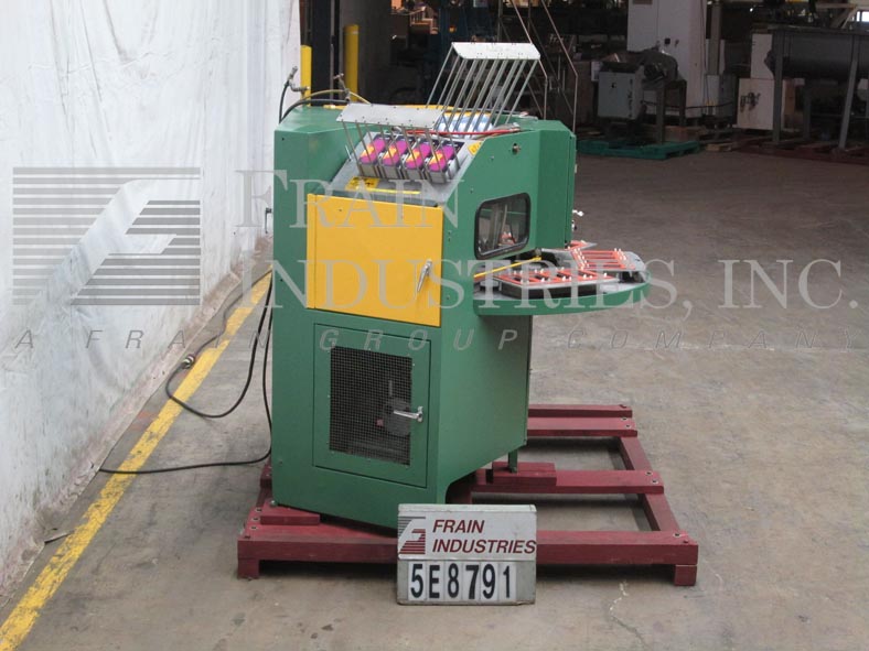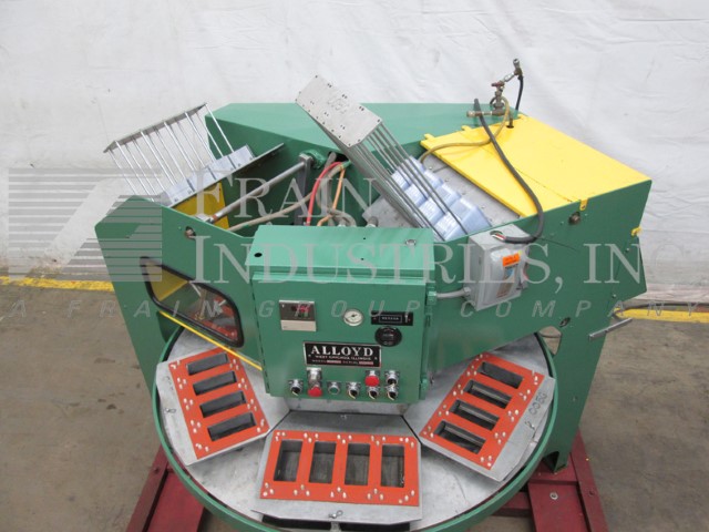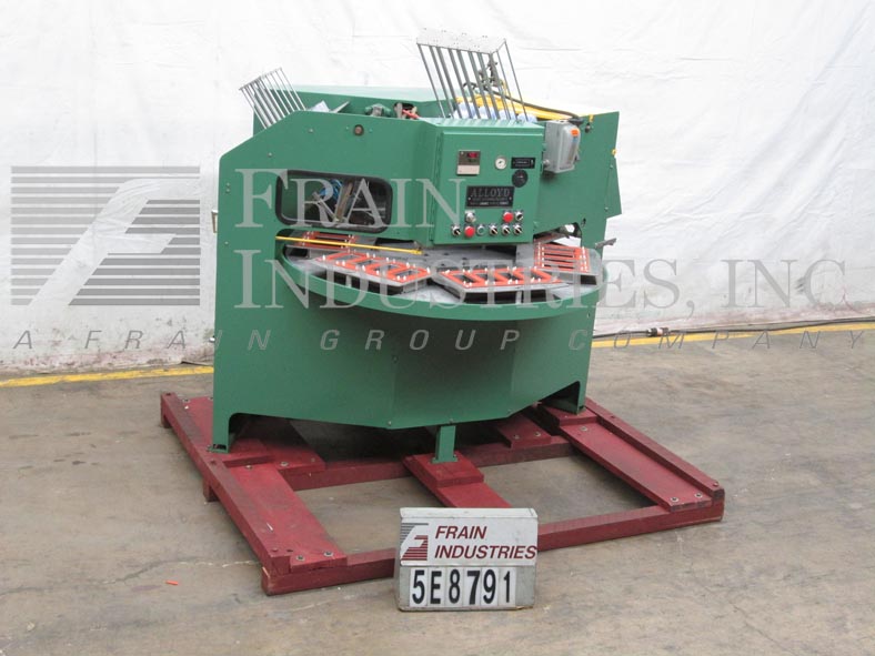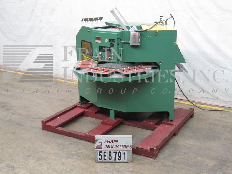 合金型号6SCBE,自动,6个工位,旋转吸塑封口机额定每分钟20次,产品数量取决于材料和应用。配备56"直径转盘与6个产品站,14" x 10"密封压板面积,吸塑,和卡片送真空摘取部分。控制面板有启动/停止,吸塑和卡片馈电,真空和热控制与静电消除开关和e-stop。