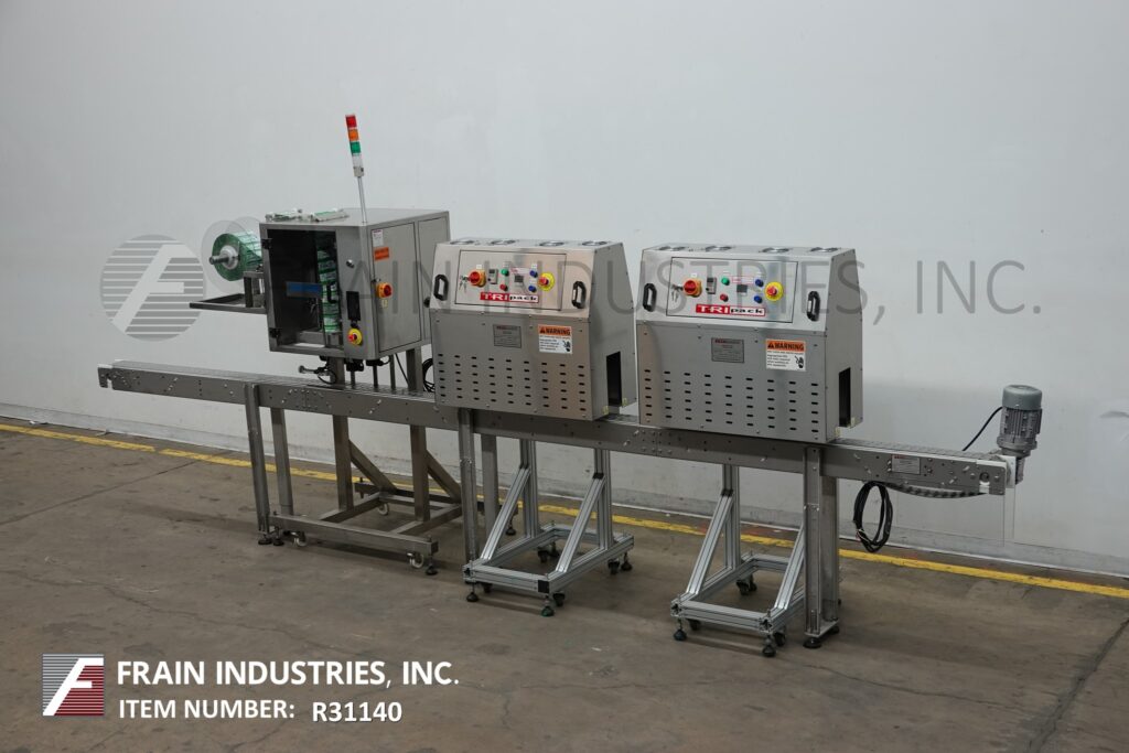 TRIpack Model HT-1, Dual over conveyor hot air shrink tunnels with 125mm (5") wide x 262.5mm (10.5") high aperature x 900mm (36") long shrink chamber. Independent and adjustable baffles for air flow direction. Control panel has heater on / off, temperature controller with digital read out and powered up / down controls with e-stop and is hand crank height adjustable to 44" high.