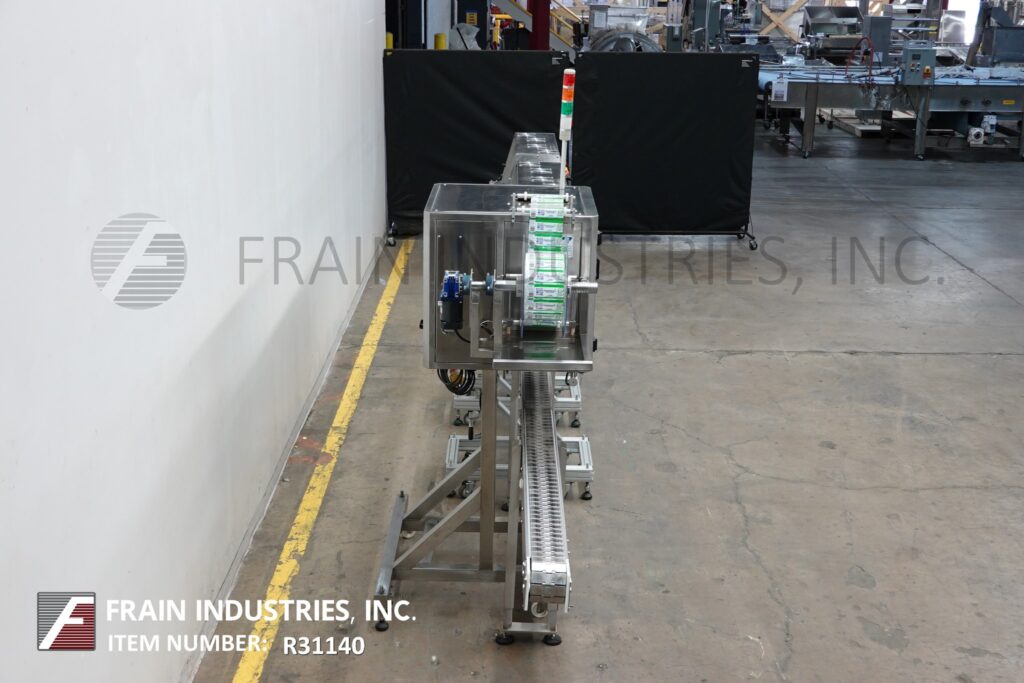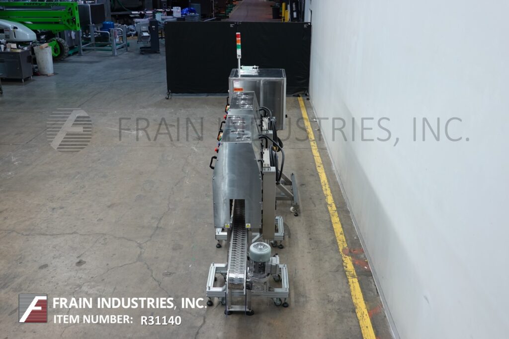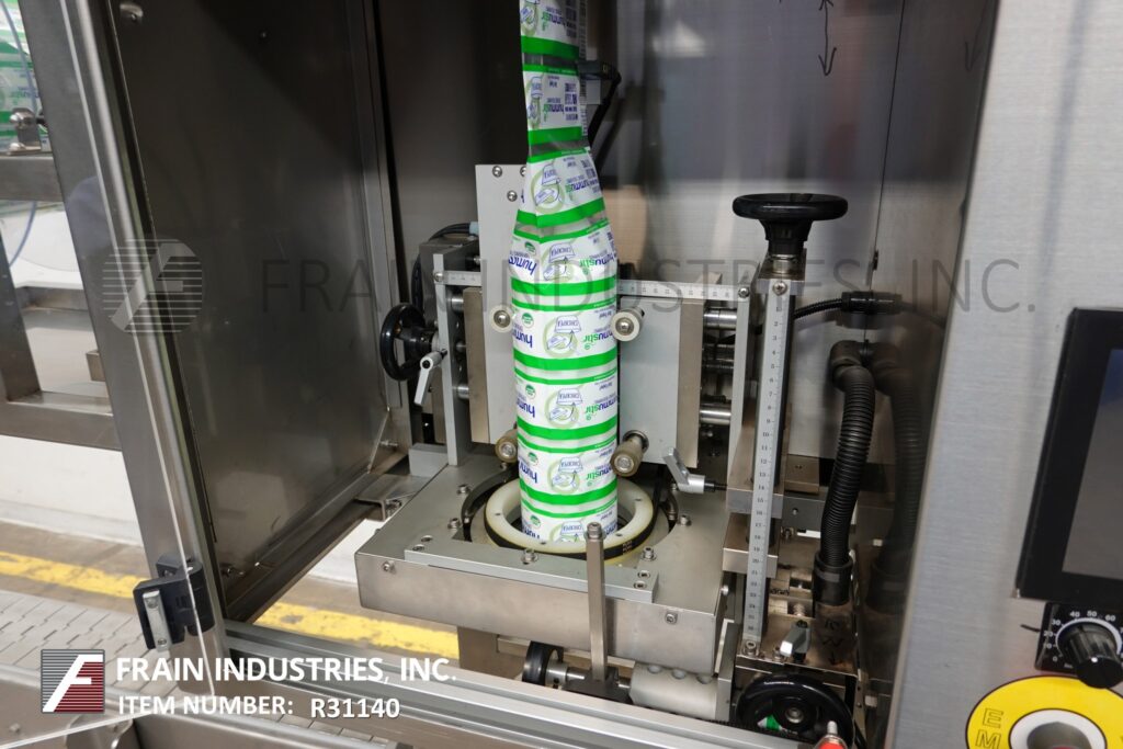 Back to All EquipmentAFM Model LX-100 VD high speed, shrink sleever / neck bander with heat shrink tunnel rated from 40 to 100 containers per minute – depending on materials and application. Sleever has layflat sleeve size range of: 40mm (1.6") to 170mm (6.8") wide; Film Thickness .034mm to 0.07mm with cut length of 40mm (1.6") to 200mm (8") and is capable of running most types of film and can handle both oval and round containers made of plastic, glass and metal. Equipped with single head bullet style mandrel, single blade centrifical cutting mechanism, perf wheel, film registration, label brush down device single roll unwind and tention controller, powered film unwind with single film reel and low film indicator light. Control panel has Panasonic / Delta controls, with SQ-53i TTO coder and mounting bracket operator interface, statis lite bar and interlocking safety guarding.