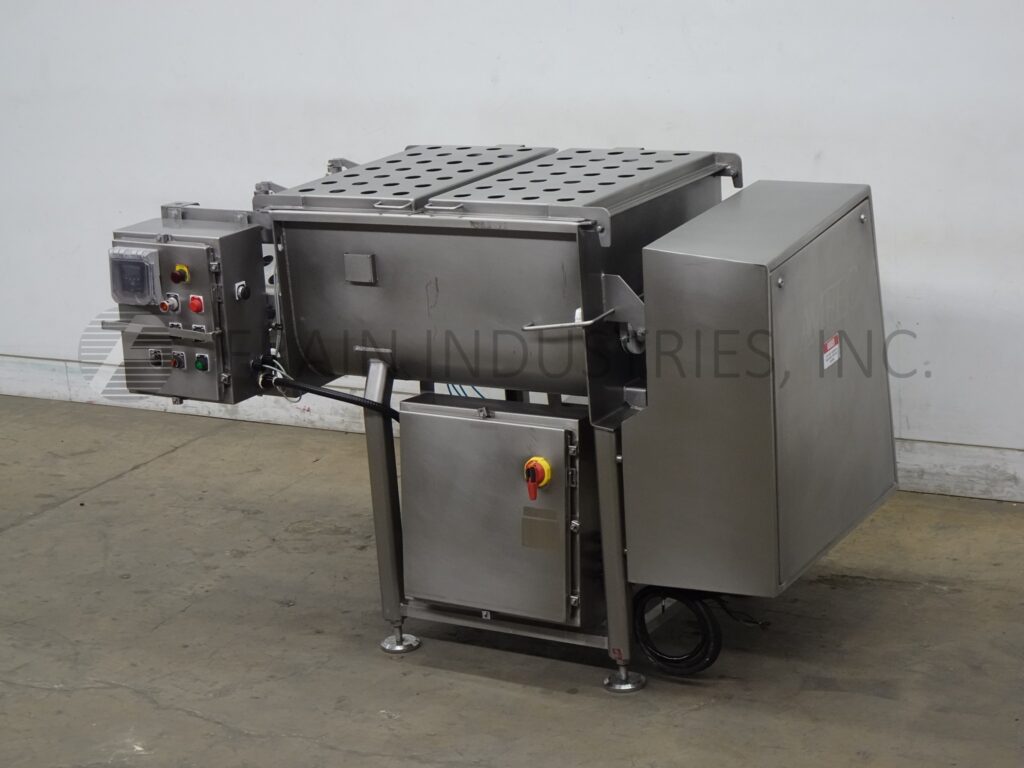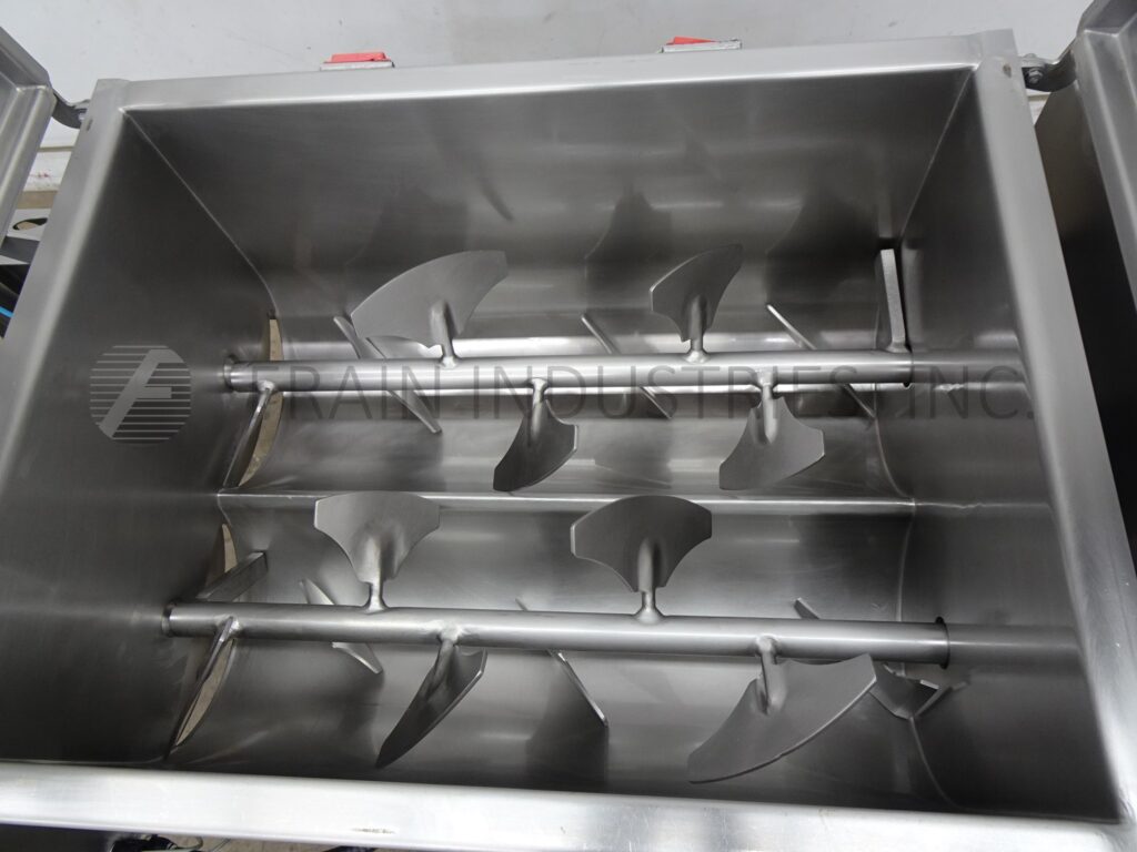 回所有设备AMFec模型51014ft3(10ft3工作容量)、304不锈钢双槽混合器和磅乘时产品-视材料应用而定双混合槽内维度41维德斯街31号深度25配上安全格特和双翻顶盖111⁄2宽x5高x1⁄4厚不锈钢板2OD井2HP驱动器和双卸门安全卫士和31GT控件面板按键启动/停止,数字定时器开关/反转转动,定时器开关/关闭,门开/关闭并运行/慢跑挂在不锈钢架上平整腿