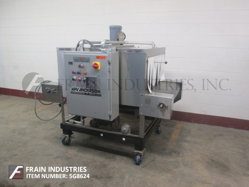 返回所有设备安德森APV, 486-5型,不锈钢单区收缩隧道。每分钟包装的数量-取决于材料,应用和机器配置。配备了一个33“宽x 12”高孔径x 48“长热室,29½“宽x 67”长产品输送带36“进料和出料高度和顶部安装的1 Hp鼓风机。控制面板上有按钮启动/停止/ E-stop,加热器开/关开关和热调节表盘。安装在带有脚轮的(4)腿上。