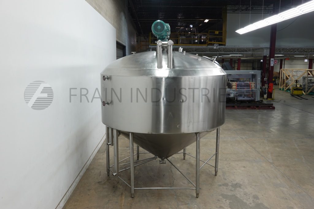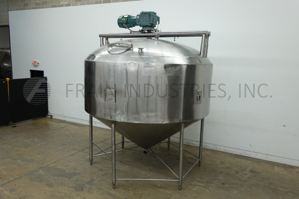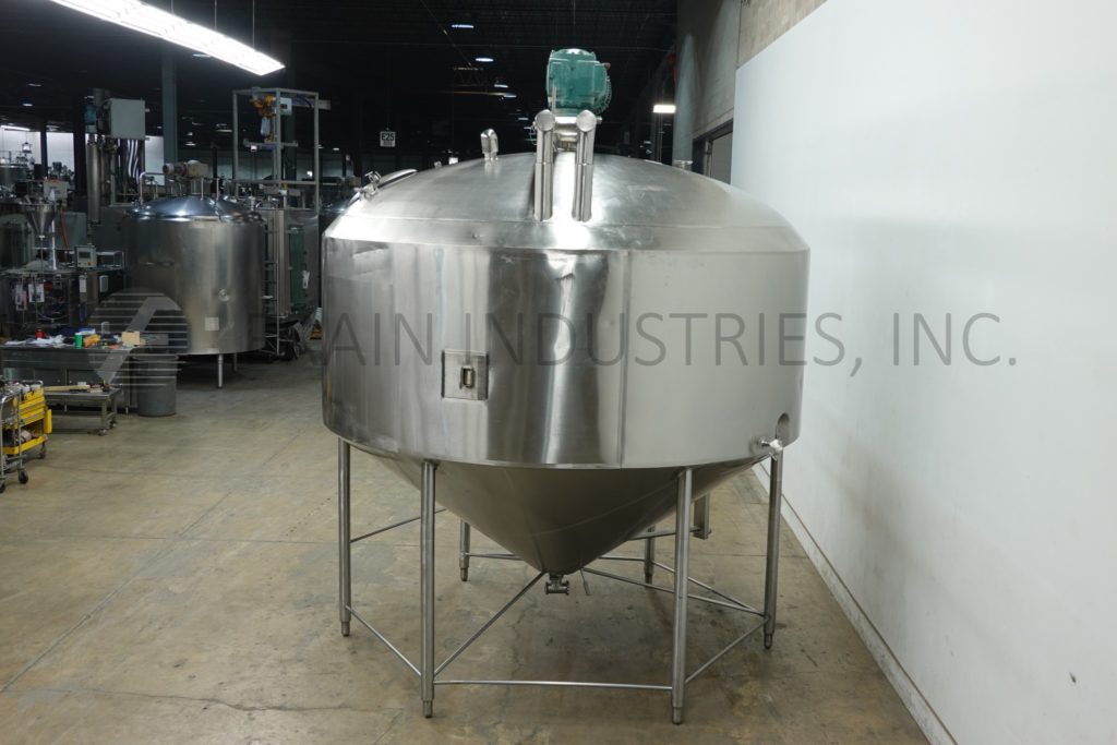 Back to All EquipmentAPV, 3,000 gallon capacity, 304 stainless steel jacketed process tank. Vessel dimensions: 120" diameter x 96" deep with a 53" straight wall and cone bottom. Equipped with a 18" diameter man way with flip bolt down cover, (2) CIP spray balls supplied by a 3½"OD / 3" ID Tri-clamp fitting, 5 / 10 Hp top mounted sweep agitator and 3½" OD / 3" ID Tri-clamp style bottom discharge with 12" ground clearance. Mounted on (5) tube legs.