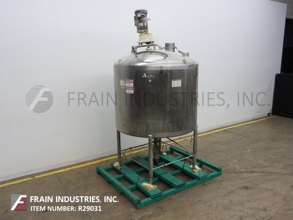 回到所有设备APV,型号CCA,1000加仑,304不锈钢,单壁罐。船舶尺寸:72“直径,直墙56英寸。配备圆顶顶部,18英寸直径顶部螺栓向下手工方式,顶部安装的支柱/ Dixie搅拌由10 HP驱动器提供动力,(2)CIP喷射球由2“OD /1½”ID Tri-Clamp配件和气动插头提供风格阀门,带有3½“OD / 3”ID Tri-Clamp配件和28“接地间隙。