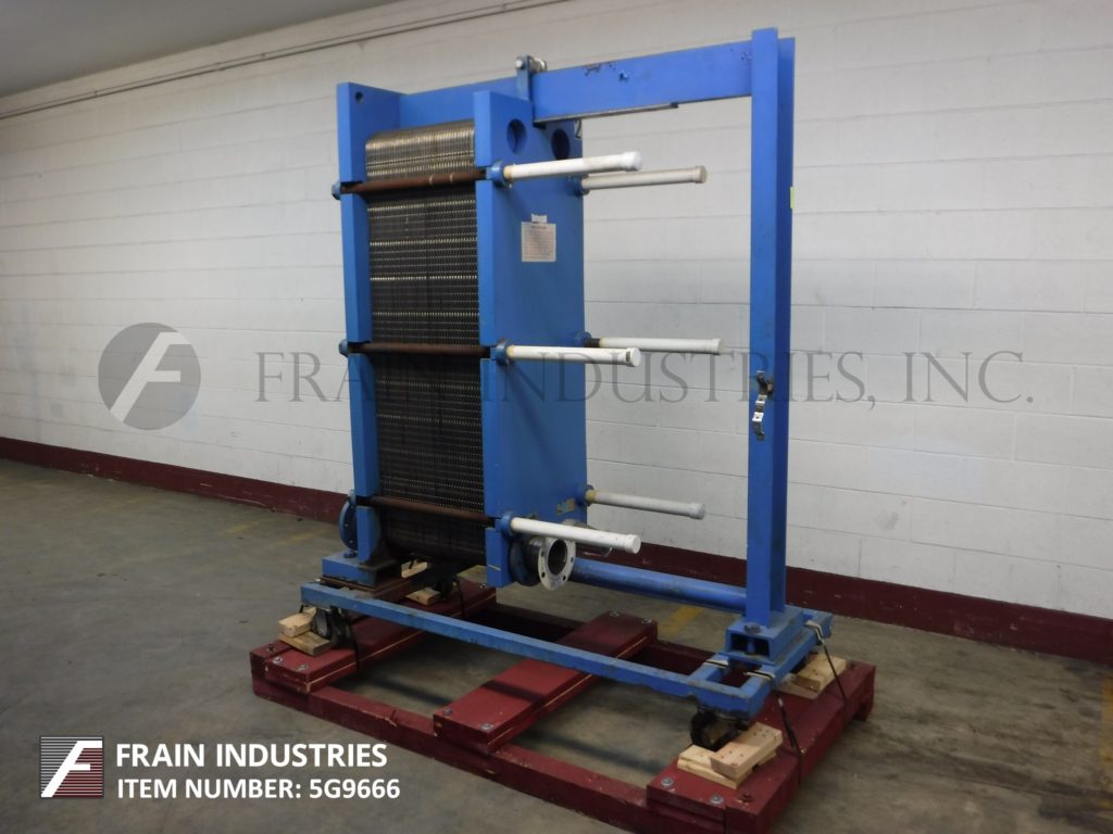 返回所有设备APV,型号R57 MOD1,不锈钢,板框式换热器。大约600总平方英尺的传热面积。配备(89)板61"长度;16½”宽;(1)区域。(2) 3”OD / 2¾”ID三卡箍和(2)9”OD / 4”ID 8螺栓法兰式转移端口。安装在涂漆的基础框架与锁定脚轮。