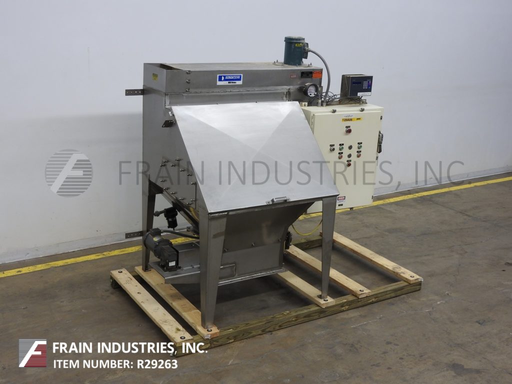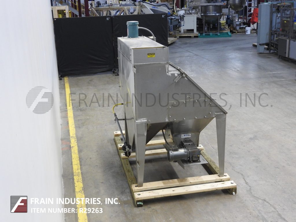 返回所有设备Young Industries MI-1009型,不锈钢,独立的袋倾倒,卸载和除尘系统每小时产品磅数-取决于材料和应用。配备45"长x 36"宽产品袋倾倒入口口翻转盖x 30"深金字塔形料斗磁安全栅和底部7"外径产品螺杆排放3/4马力电机驱动和板载8袋除尘器顶部安装1.5马力风扇电机驱动。控制面板有循环计时器,风扇和卸料机启动/停止,放电开/关闭开关,混合机启动/停止和e-stop控制与戴顿照片螺旋规。安装在(4)支腿不锈钢框架上。