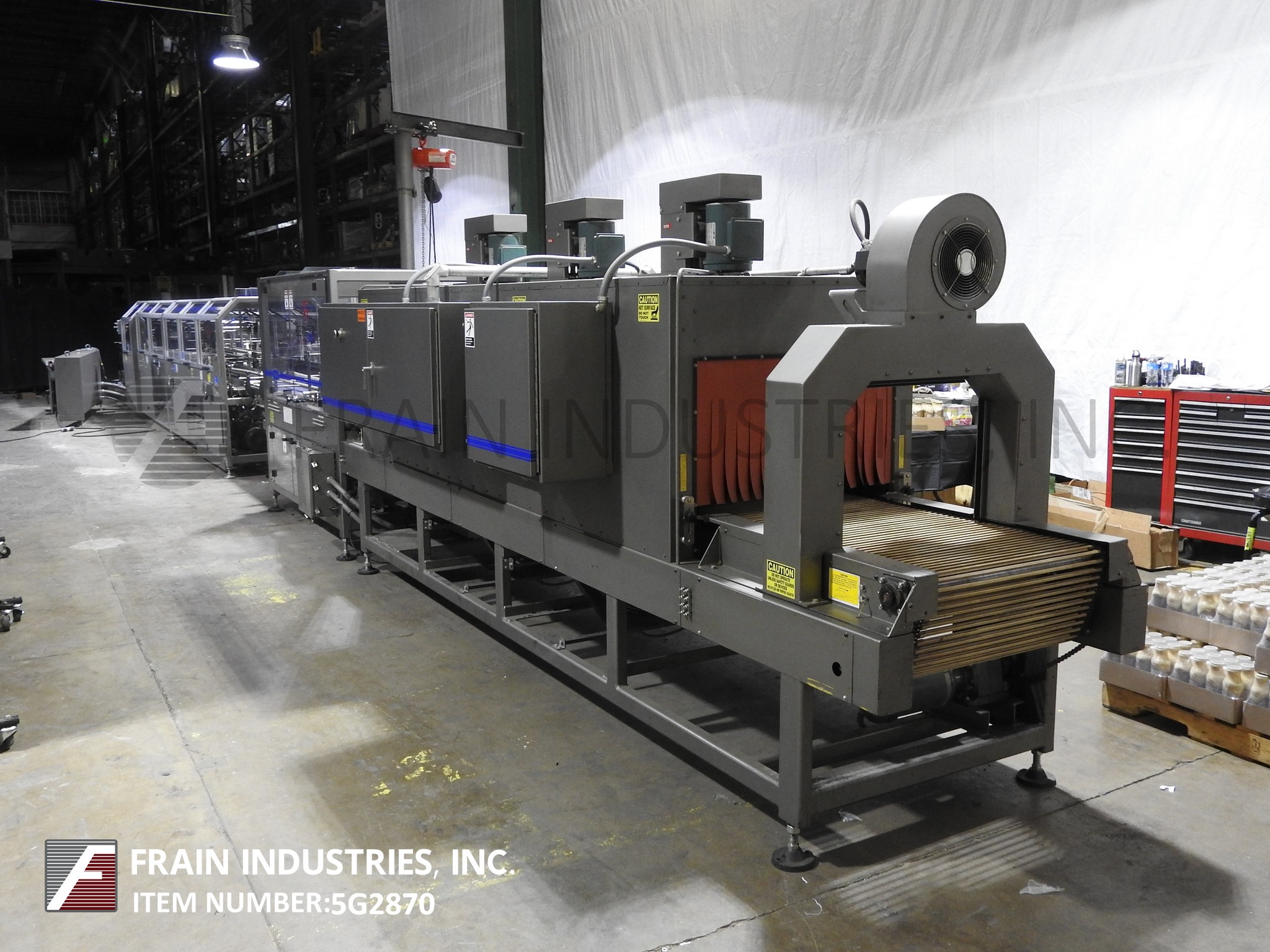 32”宽x 16-1/2”高总孔径的双区隧道;105"长收缩腔,148"长x 29"宽伸缩链接产品输送机,顶部后冷却风扇和摆动臂触摸垫控制器。中央控制面板的两台机器都有艾伦布拉德利PLC与变速控制器。都安装在共同的基础框架上。