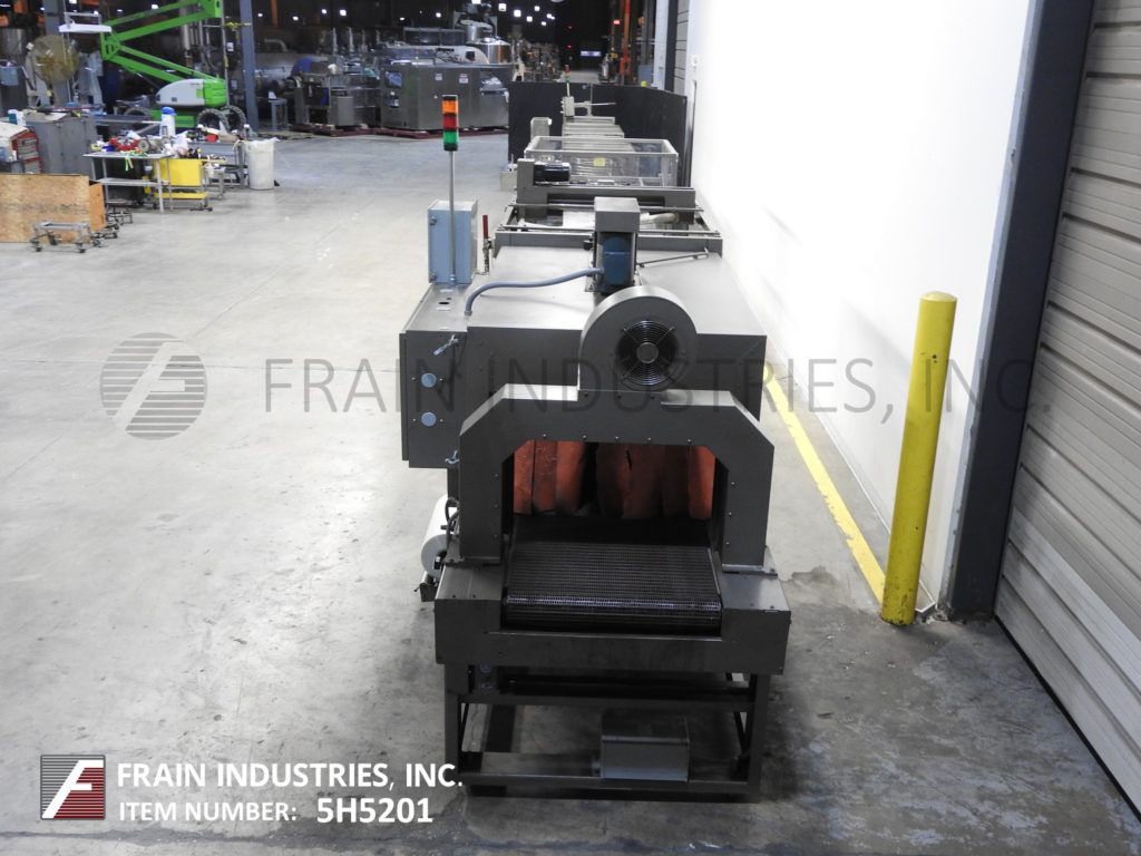72“LONG X 17-1 / 4”宽的帆布传输输送机以ARPAC型号45TW-28收缩捆绑和隧道(1)36“x 19”宽,(1)36“宽x 72”长的送入输送机通过Bundler那top and bottom film rolls with maximum film roll width of 27" and 14" OD has 29" wide seal jaws x 13" high total clearence, to single zone shrink tunnel with 36" wide x 19-1/2" high total aperture x 72" long shrink chamber with 29" wide x 108" long product conveyor thru shrink tunnel with top discharge cooling fan. Control panels have A/B controllers with touch pad controls. and readout. All mounted on heavy duty base frames with safety guarding and statis light bars.