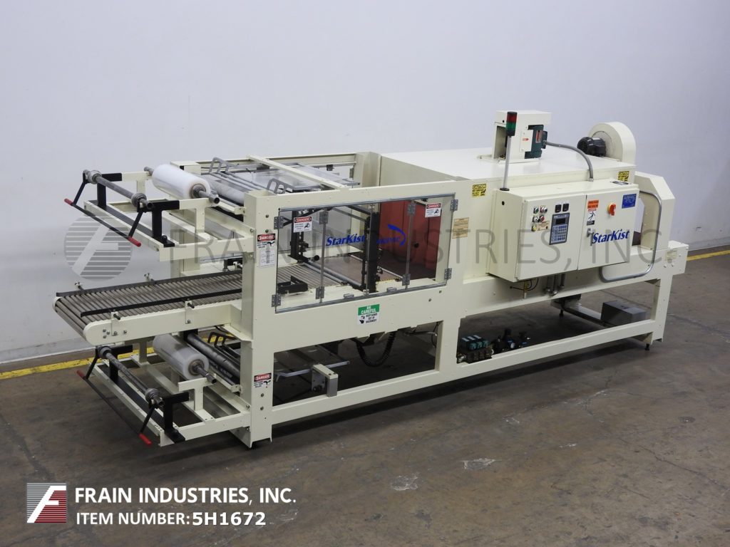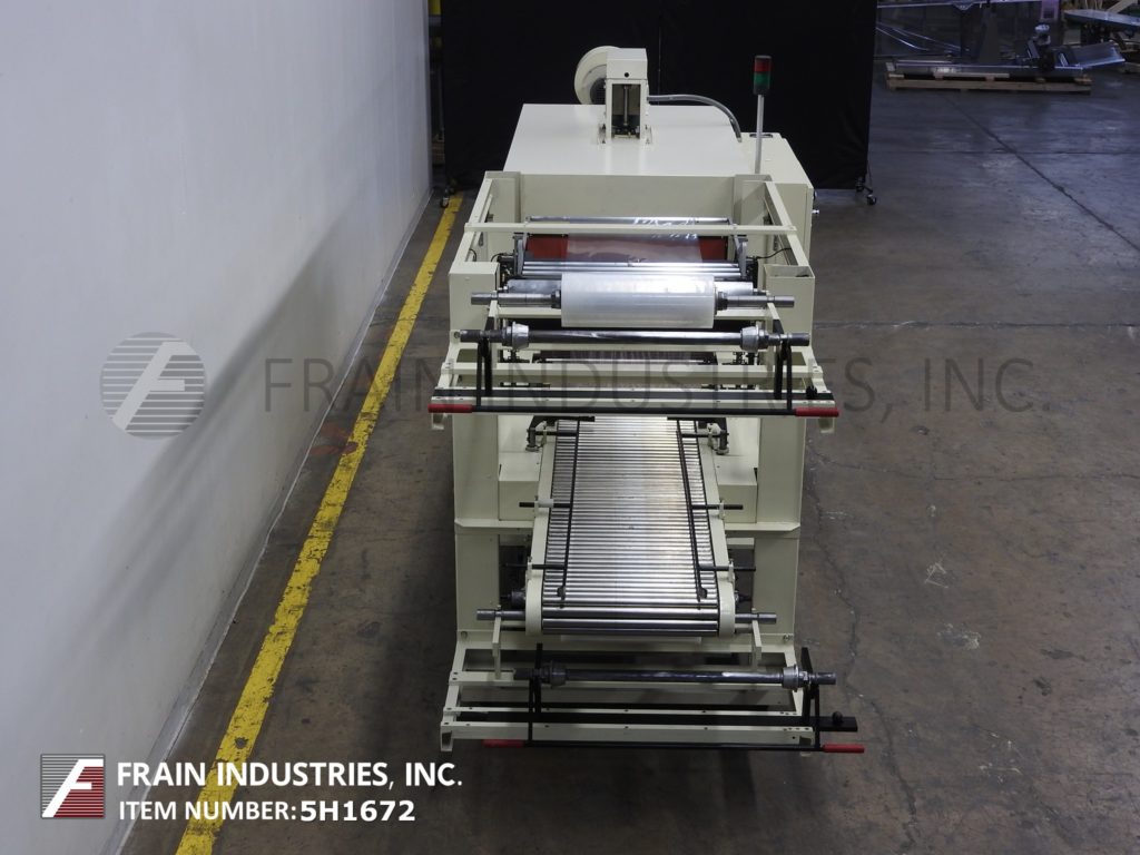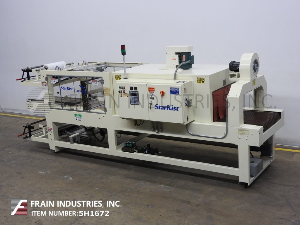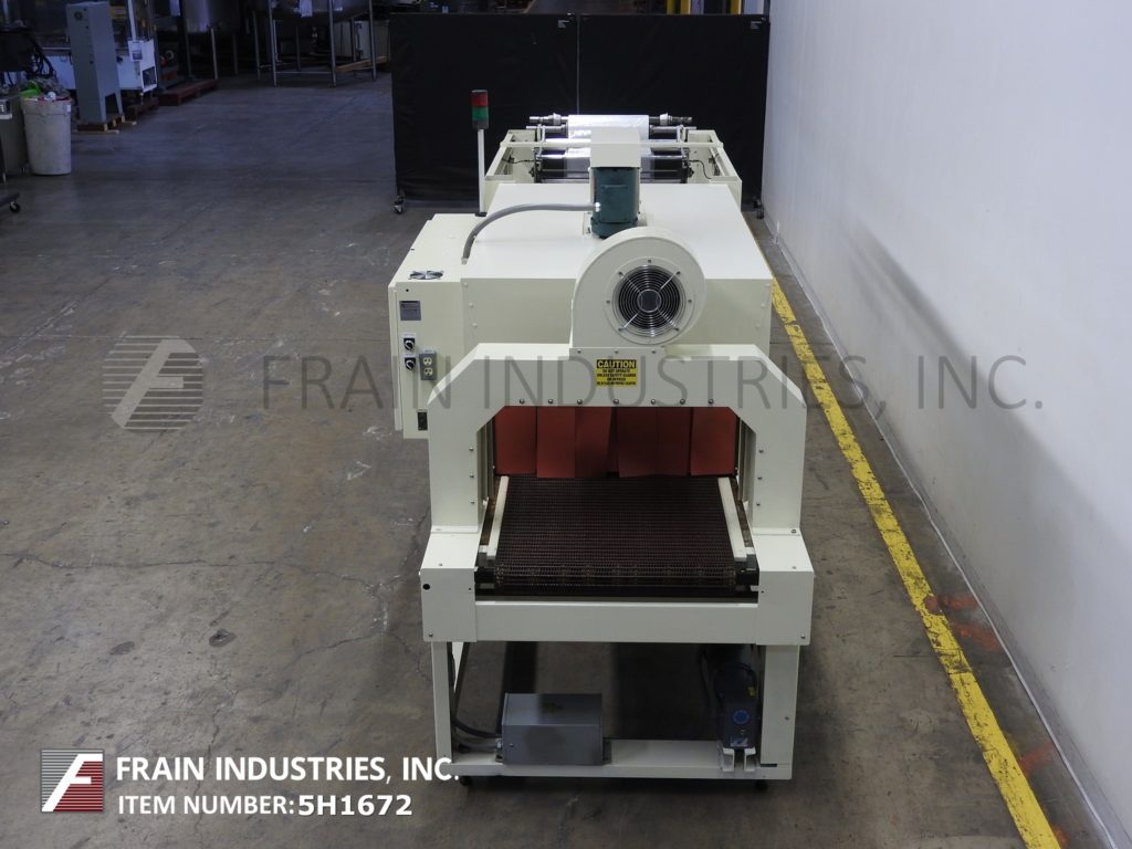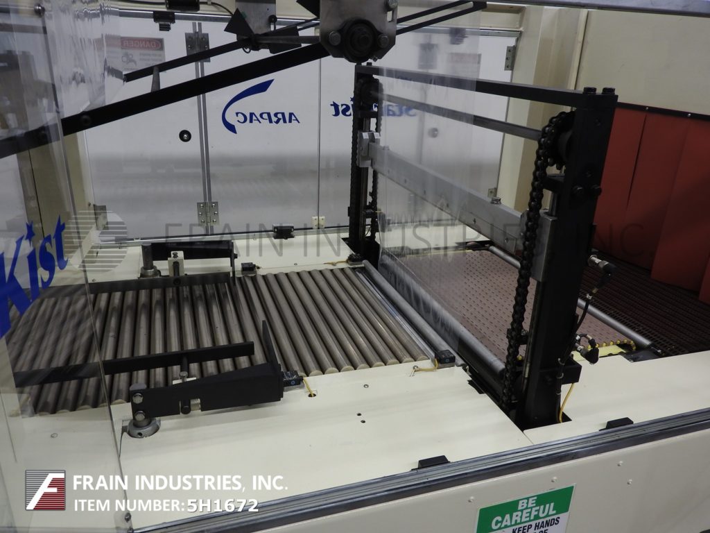 返回所有设备Arpac,型号105TW28,内联,收缩捆扎机额定从5至25束每分钟-取决于材料,应用和机器配置。产品尺寸范围:长度7"至20";宽度6"至26";2英寸到10英寸的高度。单卷胶片:28英寸长;直径14英寸;3”外径芯。配备70"长x 20"宽的辊在饲料输送机有20"长1-1/4"外径辊1-1/2"中心和1/8"间隙。30"宽密封颚与11"垂直旅行和26"长× 12"宽转移输送机到单一区域收缩隧道30"宽× 14"高总孔径和70"长隧道120"长× 28-1/2"宽柔性链输送机顶部安装鼓风机和排气端冷却风扇。控制面板有A/B CPU控制器,带有触摸板控制和读出,启动/停止/ e-停止/手动密封按钮控制和数字温度控制器密封条和隧道冷却风扇开关和统计灯条。 Mounted on heavy duty base frame.