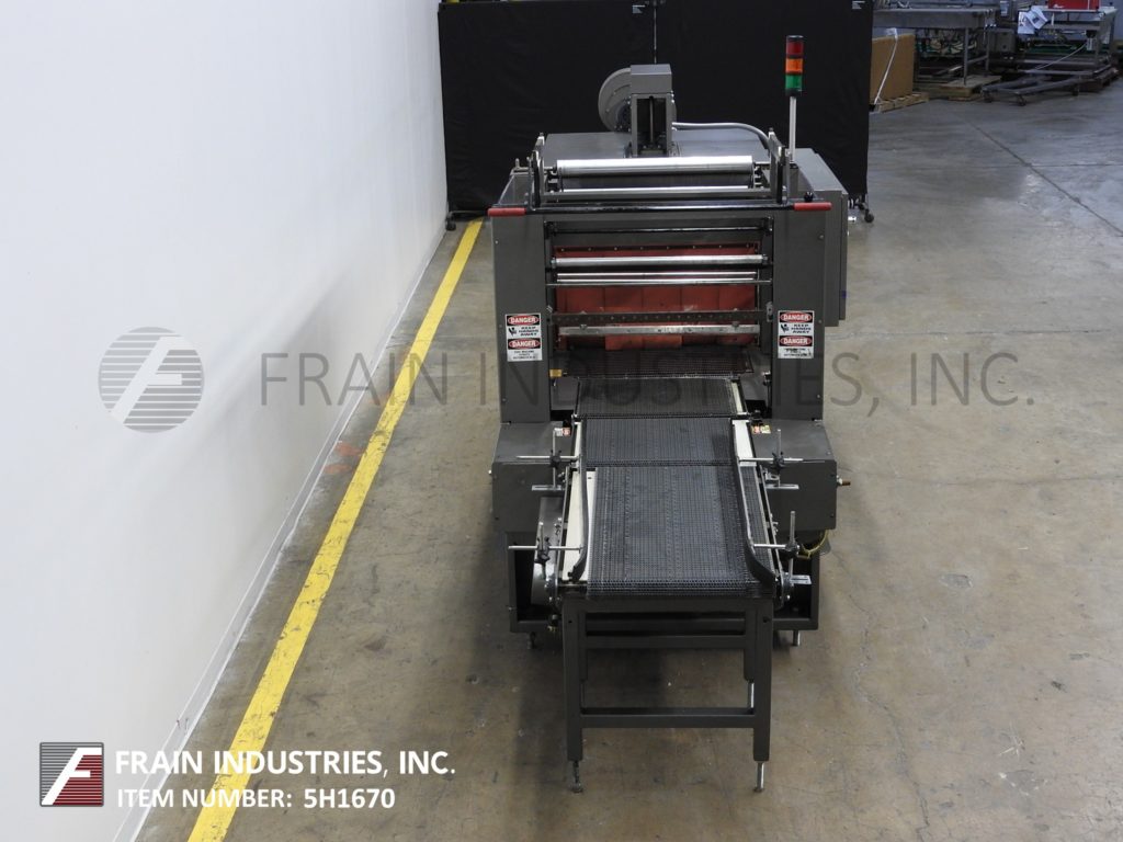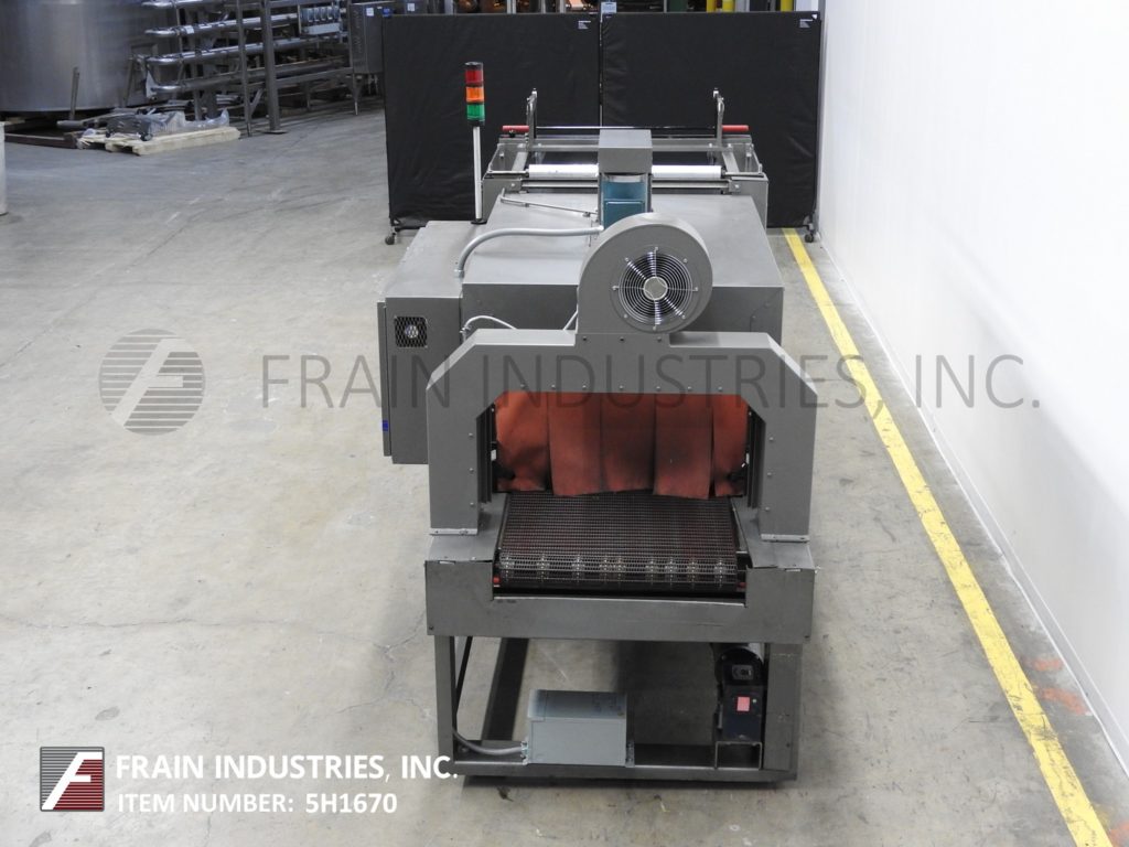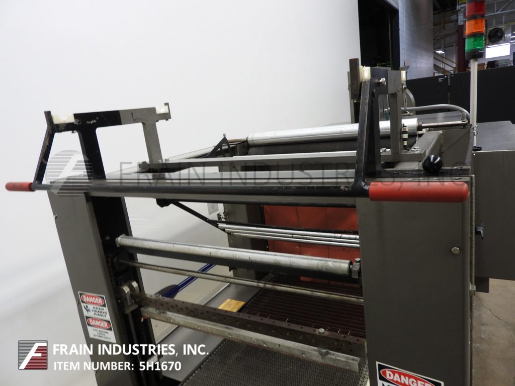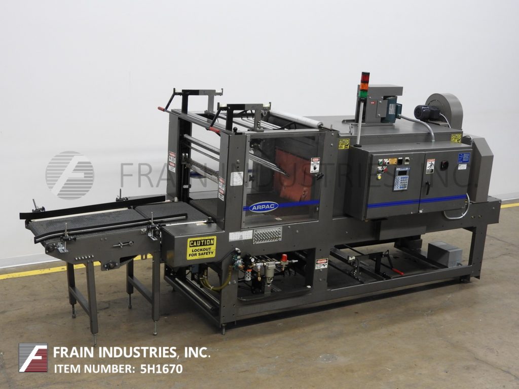 返回所有设备Arpac,型号25TW-28,内联,紧凑的单帧收缩捆扎机额定从5到25束每分钟-取决于材料,应用和机器配置。产品尺寸范围:长度7"至20";宽度6"至18";4英寸到10英寸的高度。单卷胶片:宽度27”;14“最大OD;在3”外径核心上。配有36",20"长x 22"宽的饲料带输送机,最大28“宽脉冲热密封的下颚和11”垂直行程与18“长x 24”广泛转移输送机单层收缩隧道与26“宽x 16“高总孔径和60“长隧道有120”长x 29”宽flex链接产品输送机顶部安装鼓风机和出料端冷却风扇。控制面板采用A/B PLC控制器,带有触摸板控制和读数,启停/ e停/手动密封按钮控制和统计灯条。 Mounted on heavy duty base frame with slide door safety guarding.