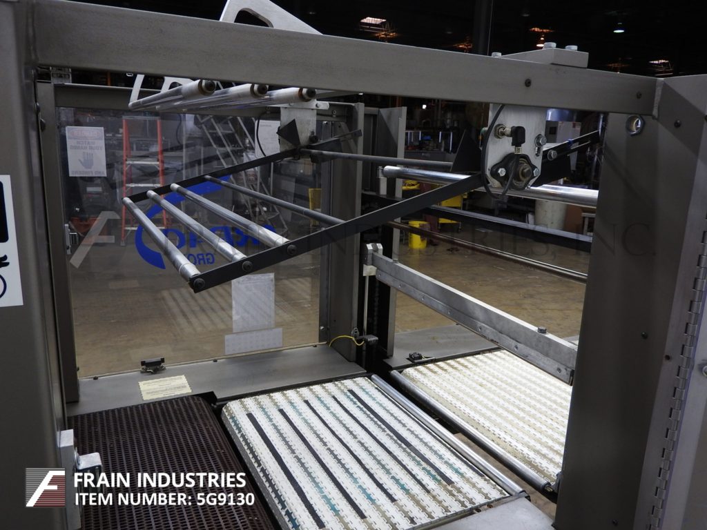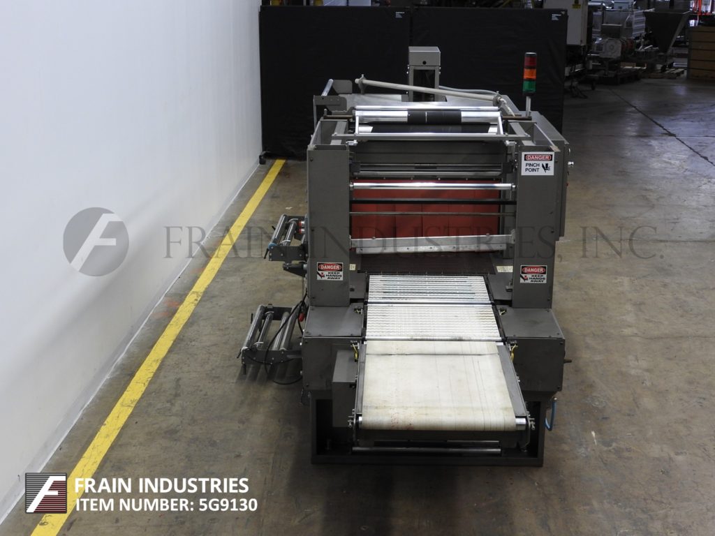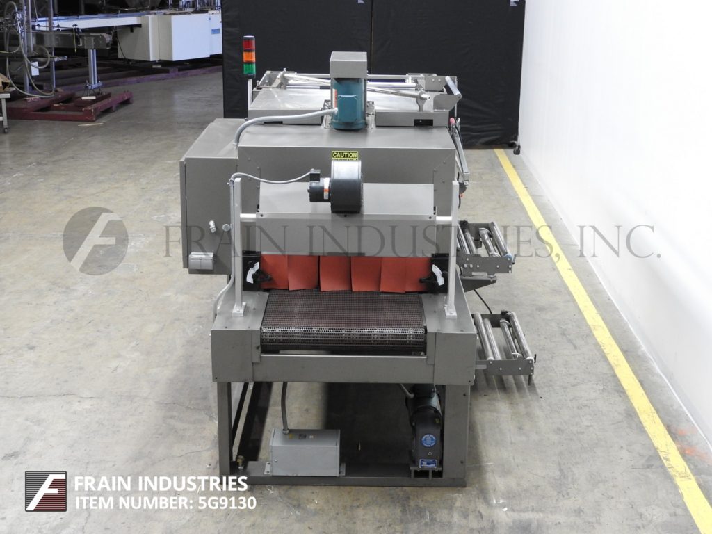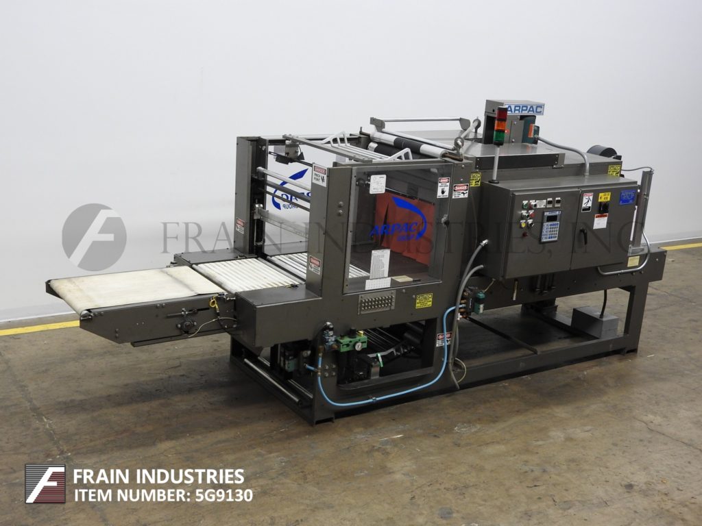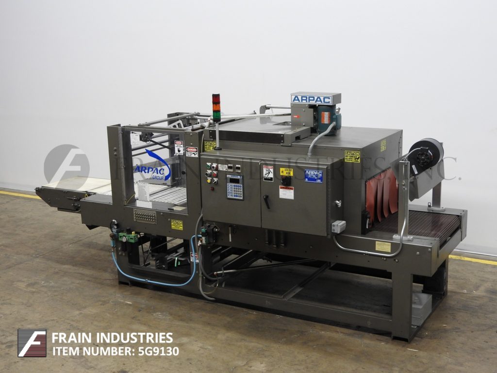 返回所有设备Arpac,型号25TW-28,内联,收缩捆扎机。额定每分钟5到25捆-取决于材料,应用和机器配置。产品尺寸范围:6½"至20"长度;宽度6"至18";2“到10”的高度。胶片卷:宽度可达27英寸;直径可达14英寸;3“核心。配备22¾“宽x 34”长的胶带在饲料输送机,24“宽x 17”长的Intralox间隔输送机,两个28“宽的薄膜卷持有人与薄膜拼接站,28“宽封下巴有11个“垂直旅行和24“宽x 16“长Intralox输送机转移到单层收缩隧道有28个“宽x 16“高总孔径和60“长隧道102”长x 29”宽Intralox产品输送机顶部安装鼓风机和出料端冷却风扇。 Control panel has A/B CPU controller, with touch pad controls and readout, start / stop / e-stop / manual seal push button controls and digital temperature controller for seal bar and tunnel cooling fan on / off switch and statis light bar. Mounted on heavy duty base frame.
