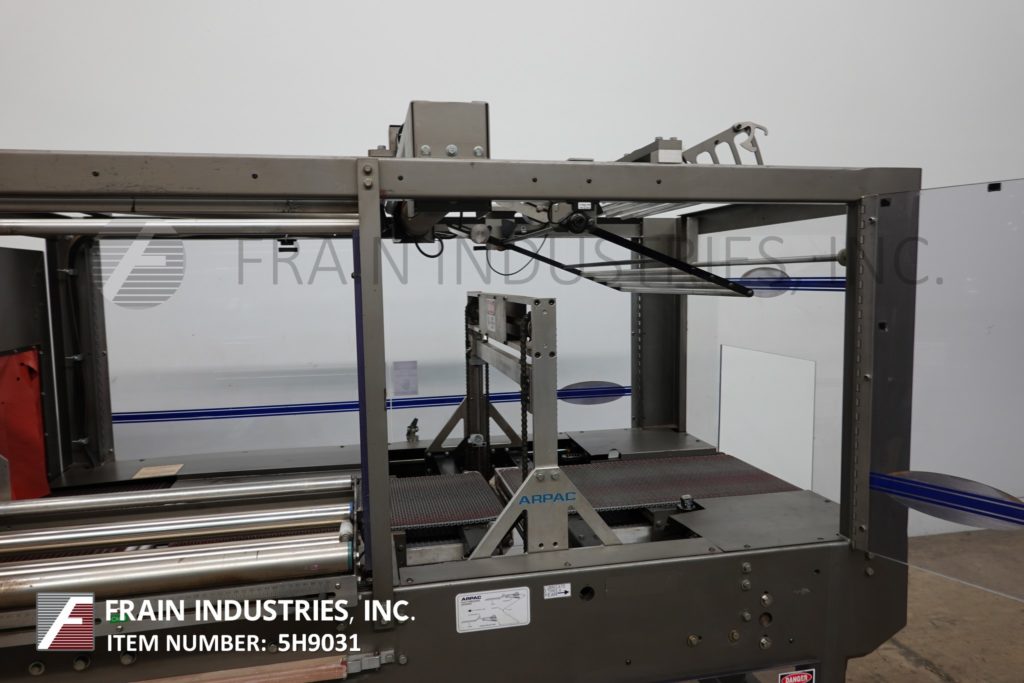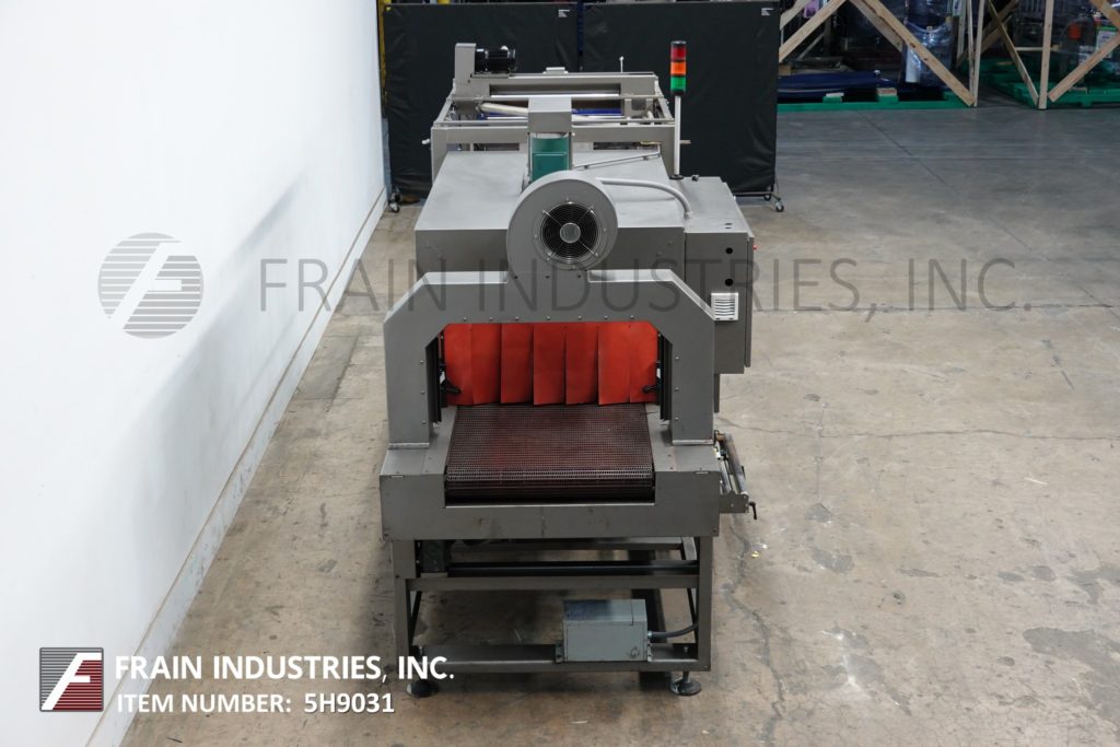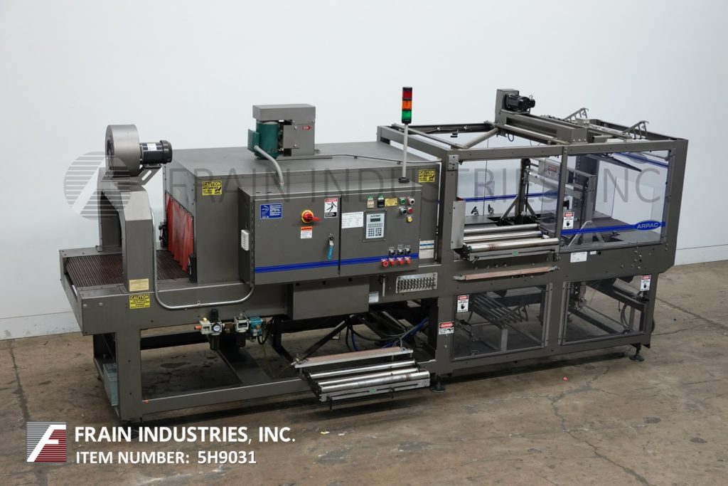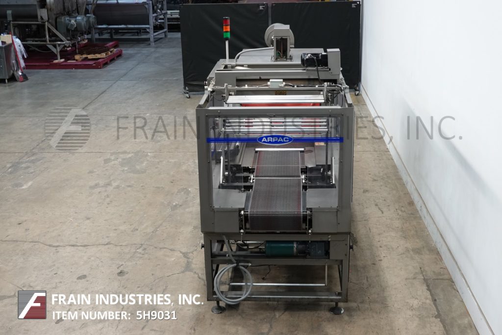 返回所有设备Arpac,型号45TW-28,直线收缩捆扎机和隧道,额定每分钟1至45束-取决于材料,应用和机器配置。产品尺寸范围:长度6"至15";宽度6"至18";身高2英寸到12英寸。胶片卷:宽度可达27英寸;直径可达14英寸;3“核心。配备17“宽x 32”长的饲料输送机,(2)28“宽薄膜卷持有人与薄膜拼接站,29“宽热刀封下巴12“垂直行程和17“宽x 30”长输送机转移到单层收缩隧道29“宽x 16“高总孔径和70年“112长隧道”长x 29”宽Intralox产品输送机顶部安装鼓风机和出料端冷却风扇。控制面板有A/B CPU控制器,带有触摸板控制和读出,启动/停止/ e-停止/手动密封按钮控制和数字温度控制器密封条和隧道冷却风扇开关和统计灯条。 Mounted on heavy duty base frame.