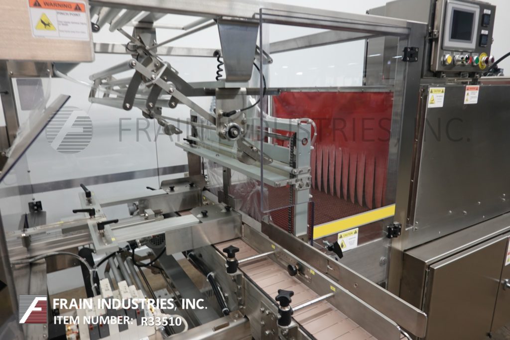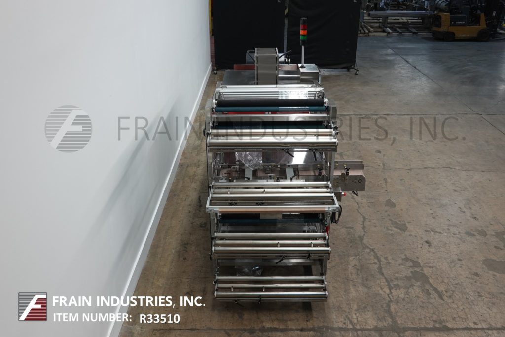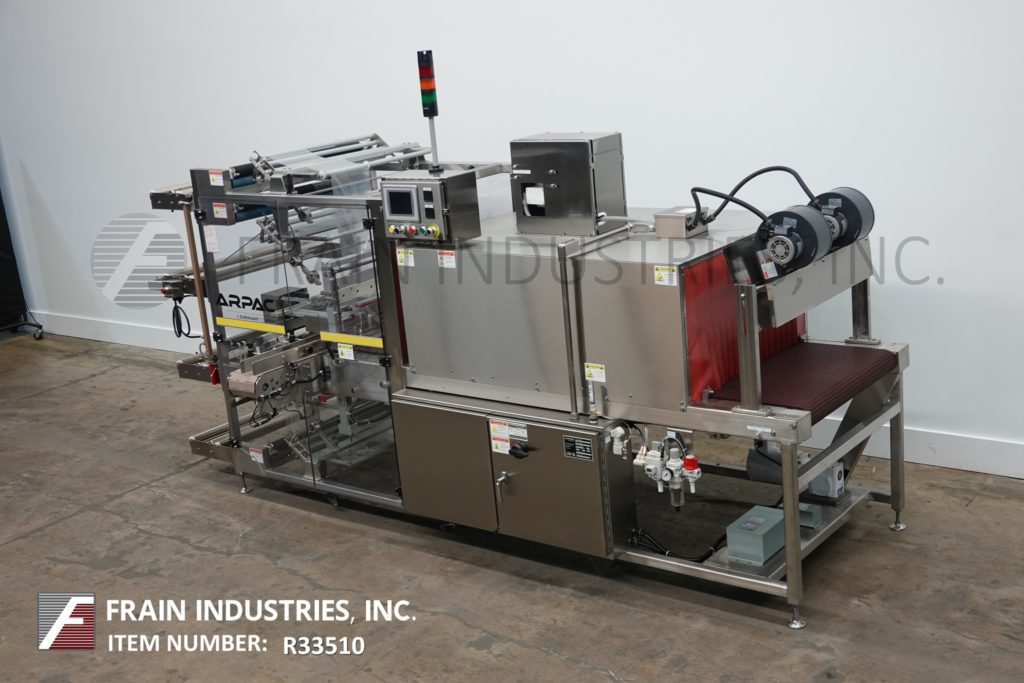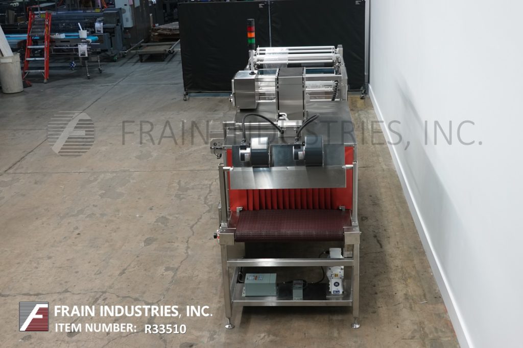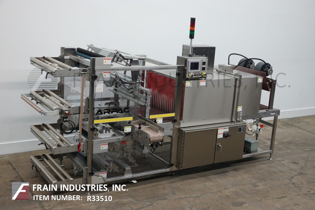 返回所有设备ARPAC,型号708HBD32,自动,不锈钢,间歇运动,收缩捆绑和隧道。评分为5至30个循环每分钟,产品数量 - 取决于材料,应用,包装图案和机器配置。产品尺寸范围:1“至11”的长度;宽度为1“至32”;高达8½“。配备7½”宽x 57“在进料输送机中的长直角,双气动装载臂,顶部和底部薄膜卷,可达36英寸宽的网和33英寸宽顶部和底部热封钳口用产品保持下来。综合收缩隧道,20½“高X 33”宽X 60“长热室,102”长X 34“宽型内部输送机和端部安装冷却风扇。控制面板具有带有触摸屏HMI的AB PLC。安装在带水平腿的重型框架上。