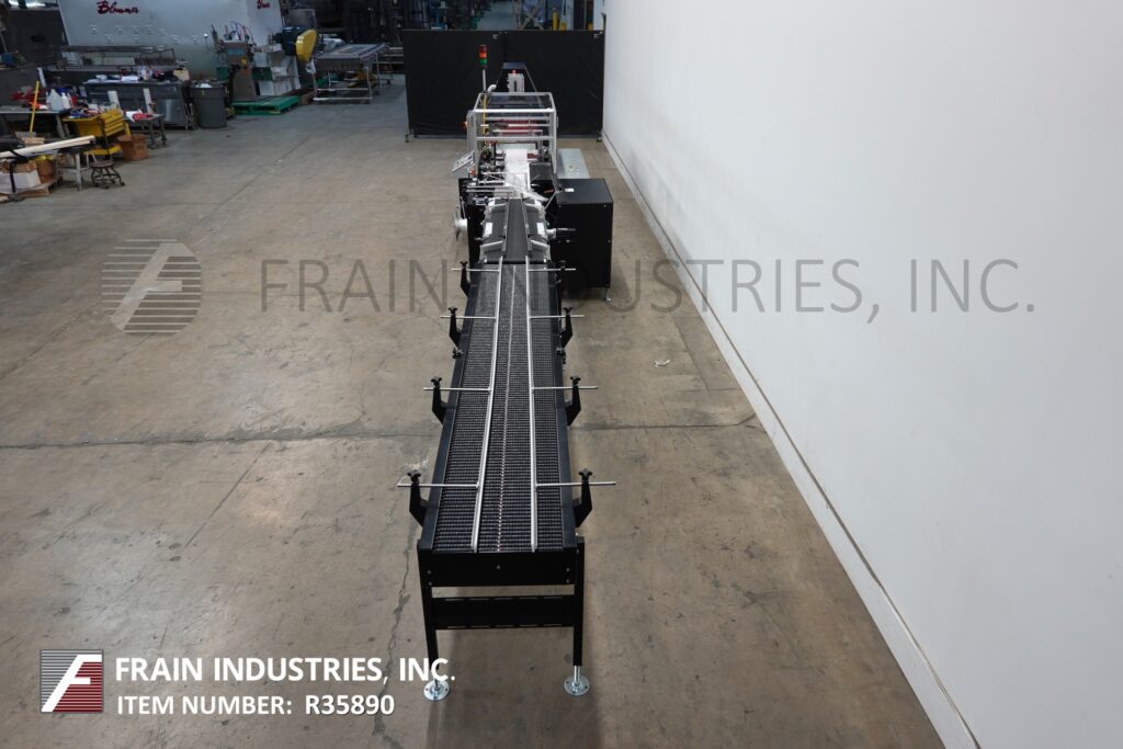 Back to All EquipmentArpac, Model TS37 and XT18, horizontal continuous motion, side seal shrink wrapper and tunnel. Rated from 0 to 80 linear feet and 0 to 80 packages per minute – depending on materials, application and product stability. Product size range: 3½" to 72" in Length; 2" to 16" in Width; ¼" to 7½" in Height. Equipped with 118" long slip torque product in feed conveyor and 72" long belt transfer conveyor, LDPE seal jaws and next generation side seal with product discharge conveyor. Control panel with A/B controller and touch screen HMI. Film specs: Film specifications: up to 39" wide single wound film on 3" OD core; to 14" in diameter, with pull out film carriage. Mounted on (4) leg base frame with interlock safety guarding.