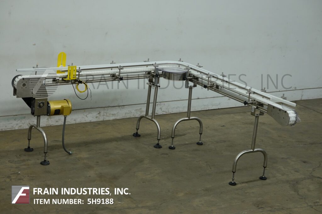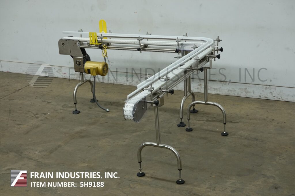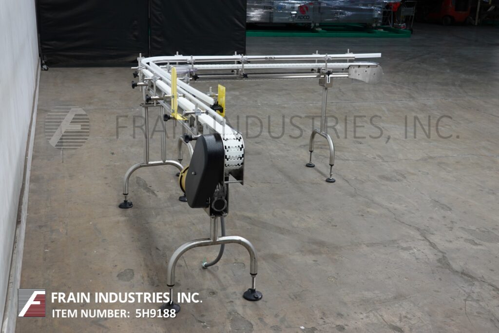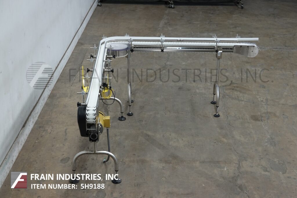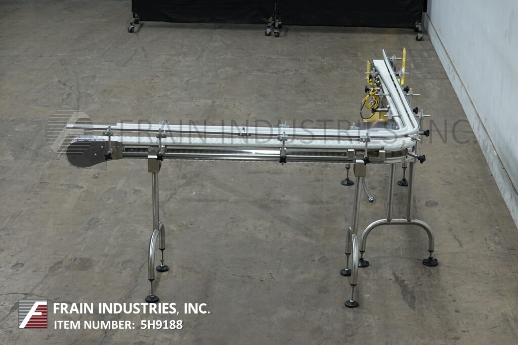 Back to All EquipmentAutopak, 90° 3¼" wide x 156" long, stainless steel conveyor. Equipped with a 78" long infeed to 90° turn to a 78" long discharge with a 33" to 38" infeed / discharge height. Powered by a ½ hp drive.
