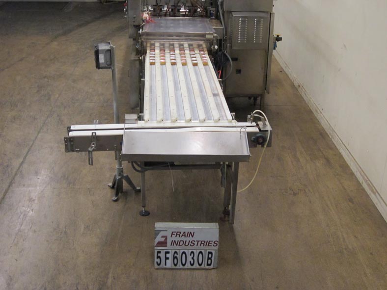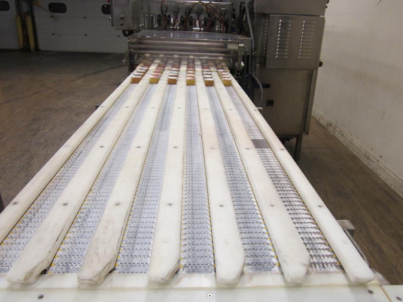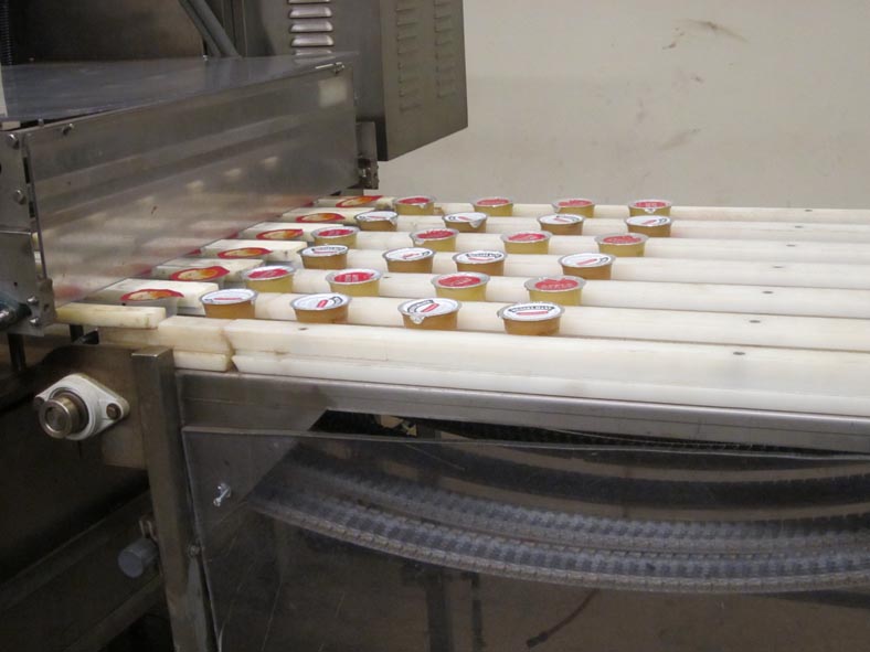 5F6030A单车道输送机将杯子从六个车道拿到90度的单一文件放电,以便包装过程的下一部分。