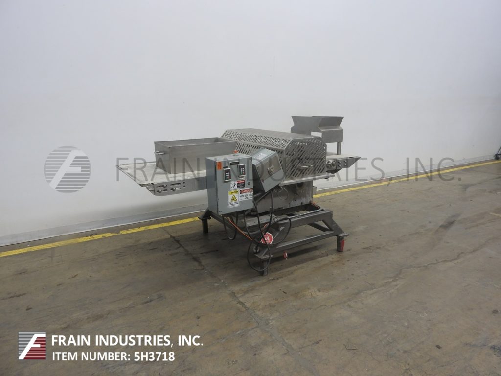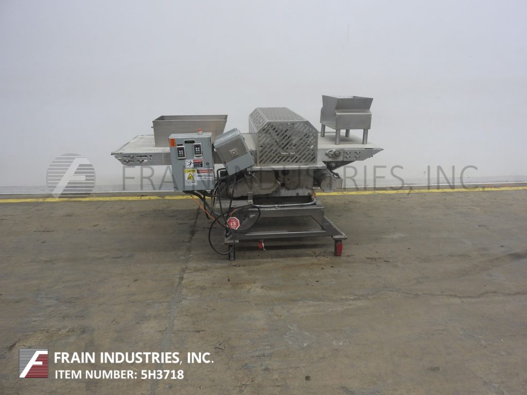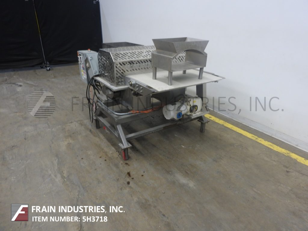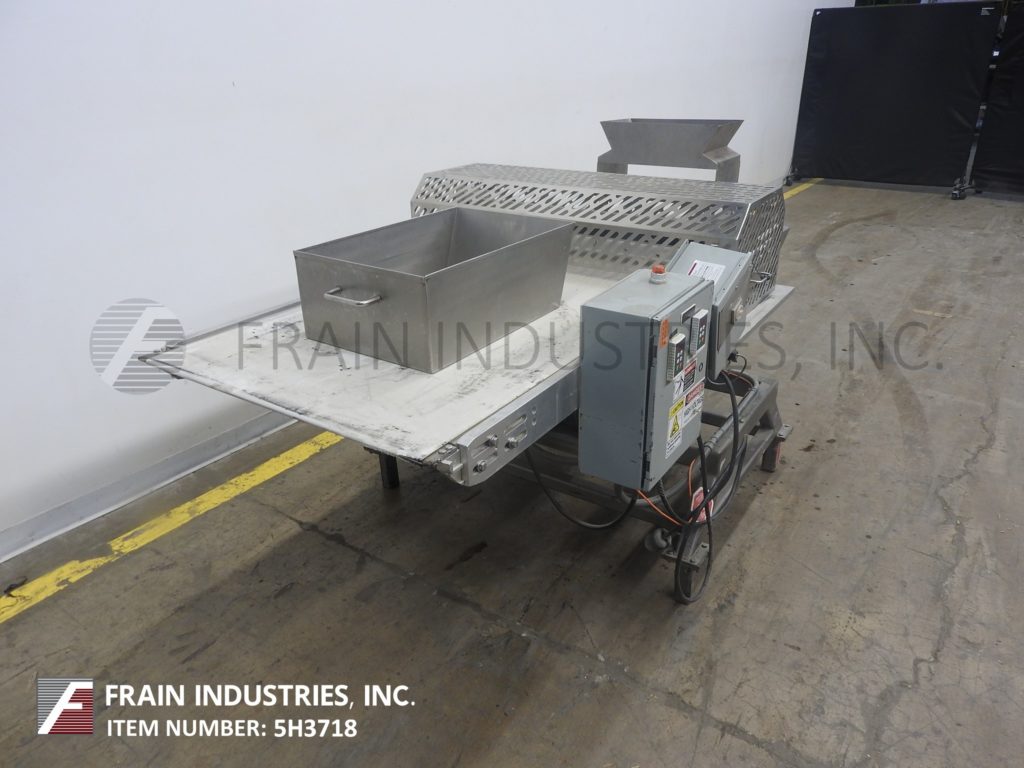 不锈钢输送机安装闸板。配备了32英寸宽x 85英寸长的帆布输送机,由1马力驱动,35英寸到40英寸的进料和出料范围,32英寸宽的机械切割刀片,由3 / 4马力驱动,带笼式安全防护装置。控制面板与变速控制输送机和刀。用调平垫安装在涂漆的框架上。
