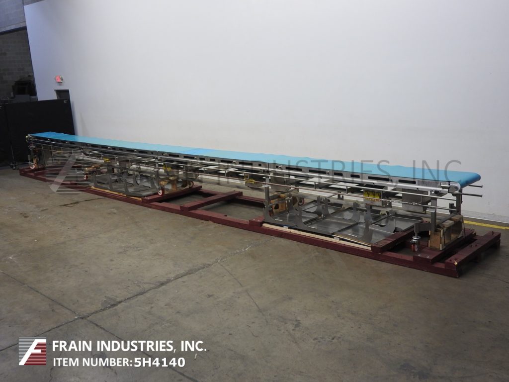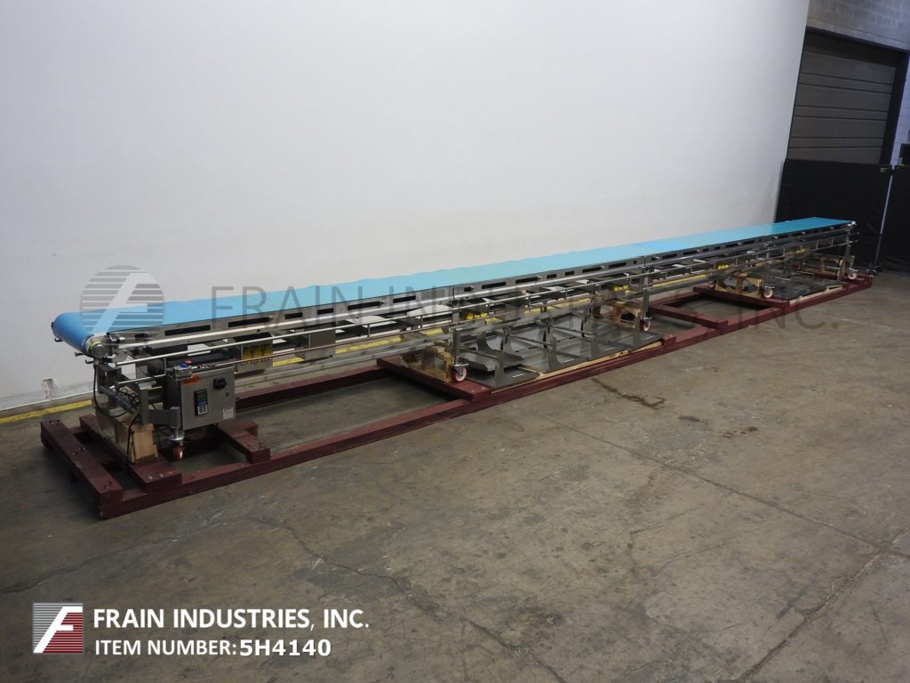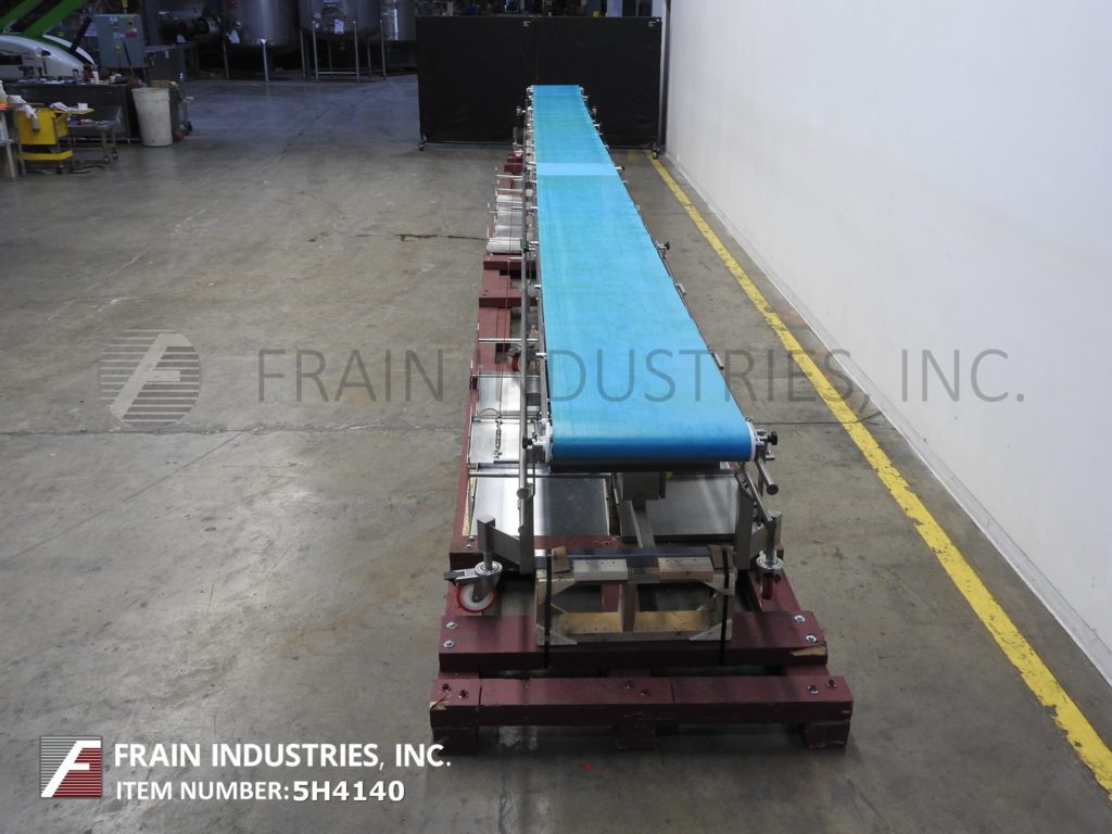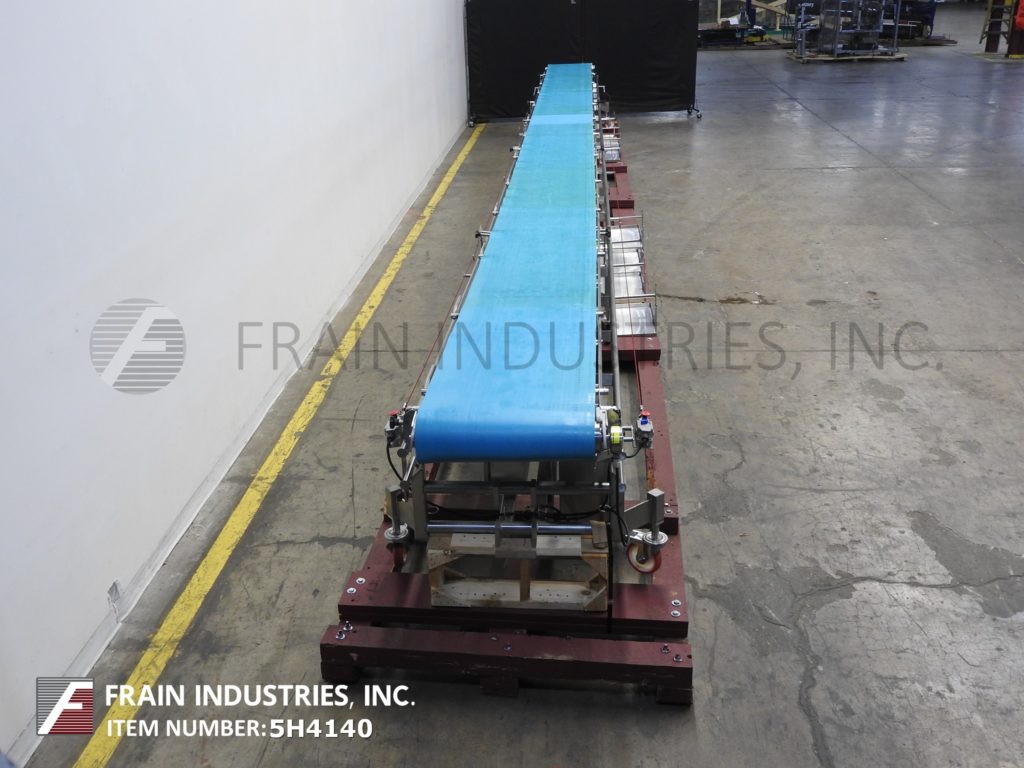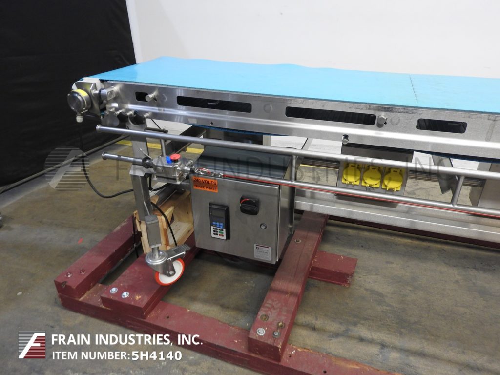 返回所有设备Dorner, 24“宽x 475”长不锈钢带式输送机。24“宽和475”长的食品级皮带有饲料和放电高度34½“。配备了Interroll驱动器,变速控制,可移动的侧安装包表和E-stop和弦。安装在锁定脚轮上的单元