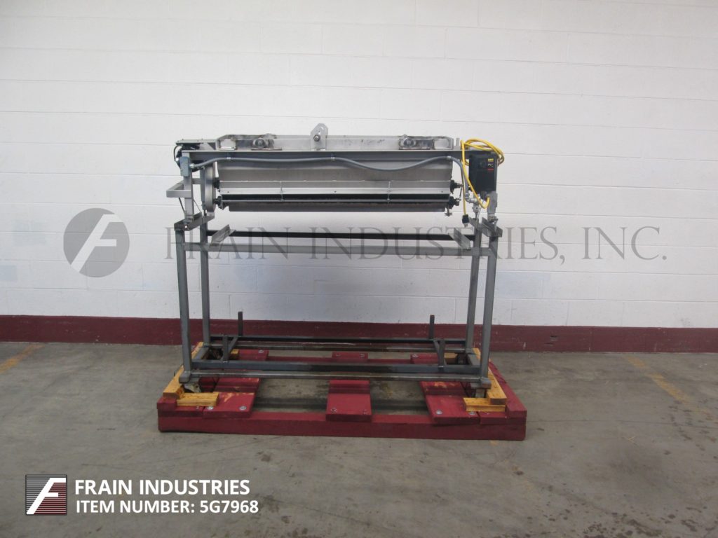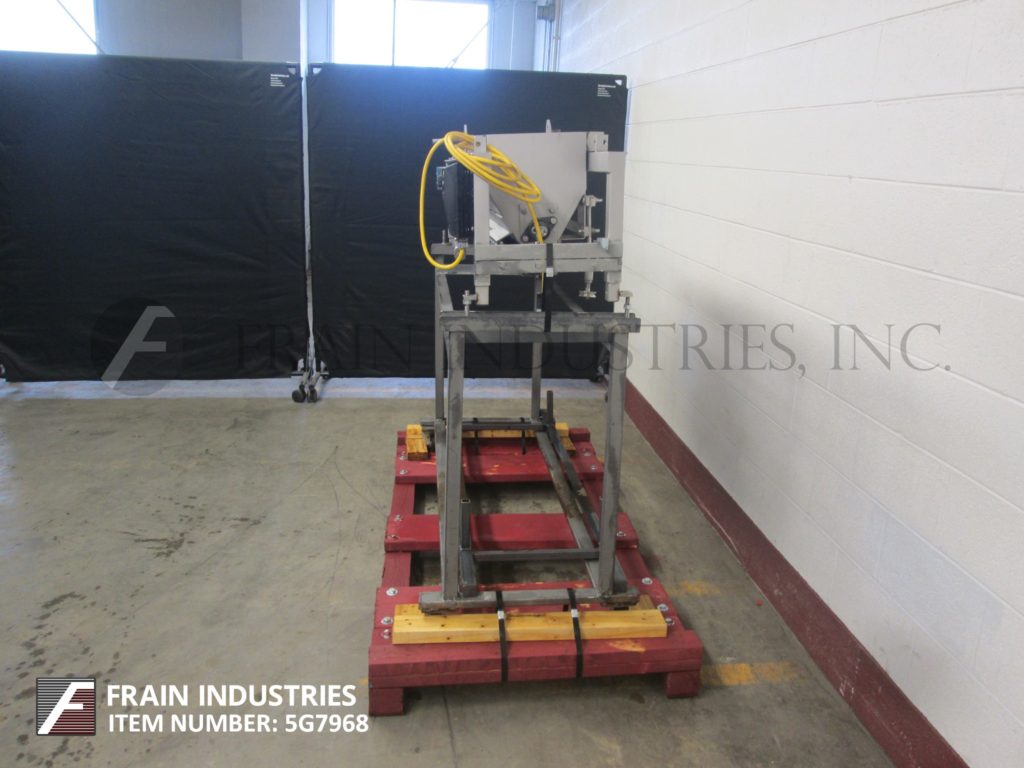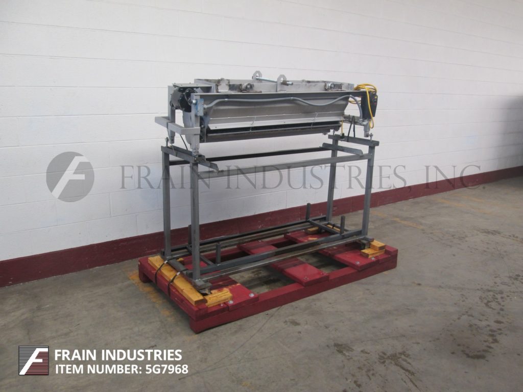 糖圆顶。配备47英寸宽x10½“长x 12”深浅槽,带销杆搅拌和旋转沉积底部,由一个带有变速控制器的1/8 HP驱动器供电。安装在公共底座上,带有脚轮,设计用于滚过现有输送机的脚轮。