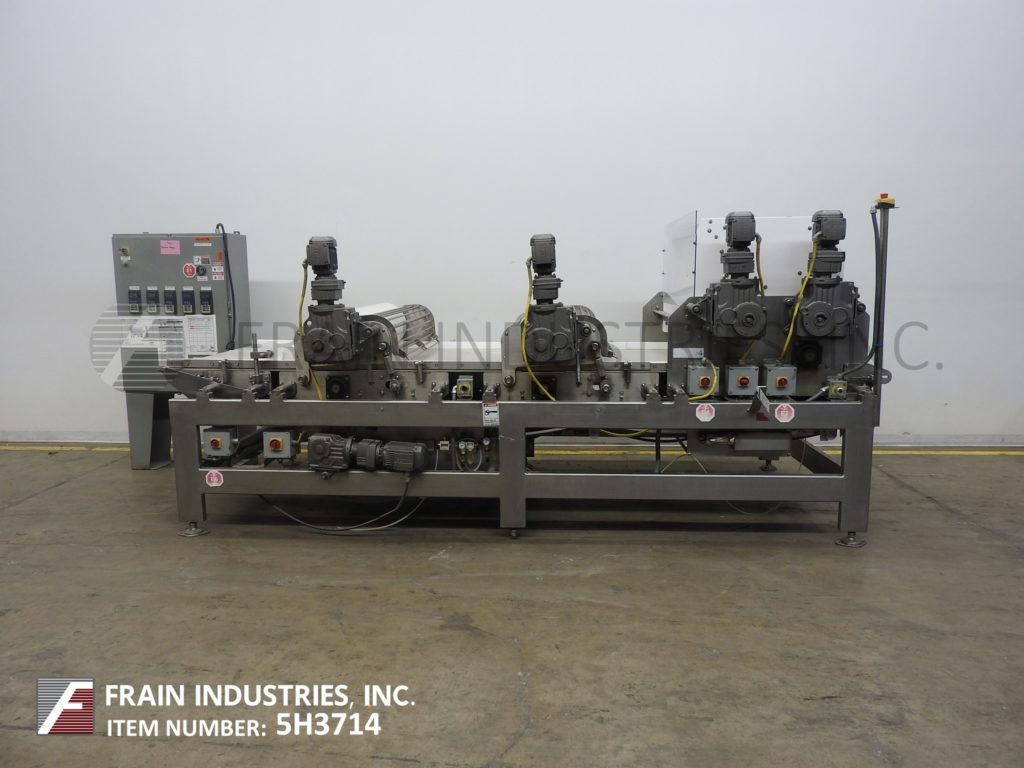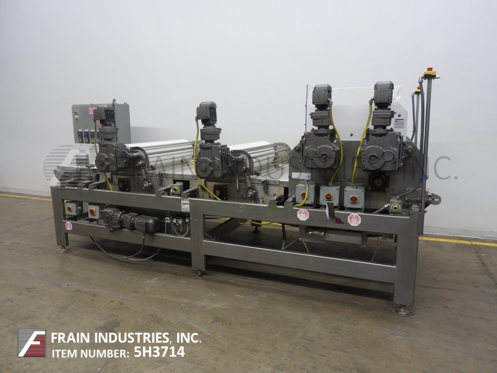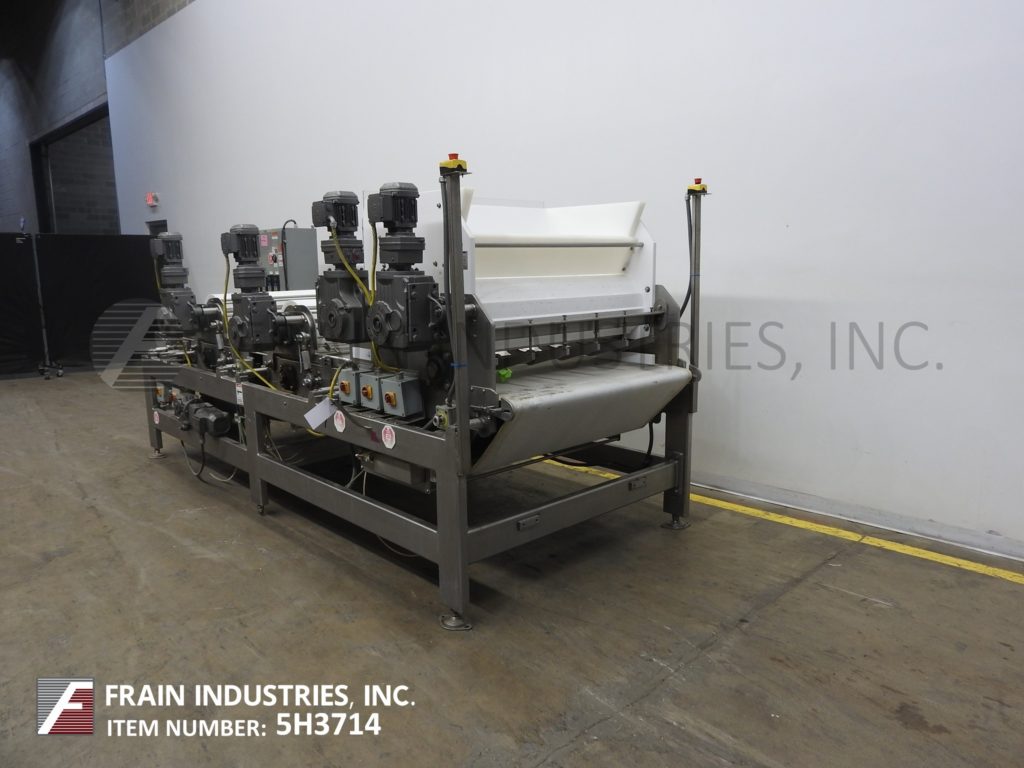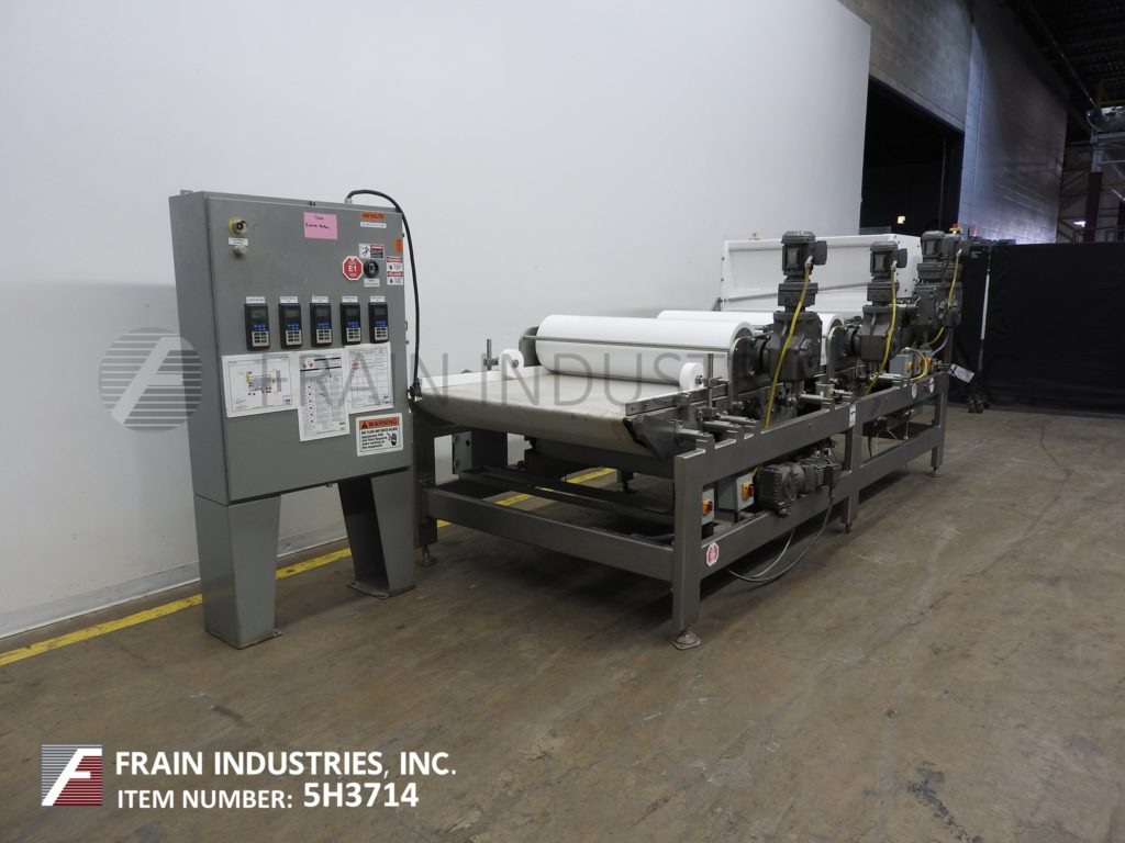 返回所有设备生产线和压力机组成,前者有一个配有(3)48“宽的Teflon产品成型辊的Teflon产品进给料斗,可创造一个可行的板坯,设计用于减少损耗和改善最终产品,并消除其他设备,例如水在处理粘性或粘性产品和压缩部分时的冷却器有(2)48“宽的Teflon产品滚筒,该尺寸的产品尺寸,旨在提高连续板坯生产的线速度以及产品效率,并具有48英寸宽肾斑带输送机。安装在一个基础框架中。