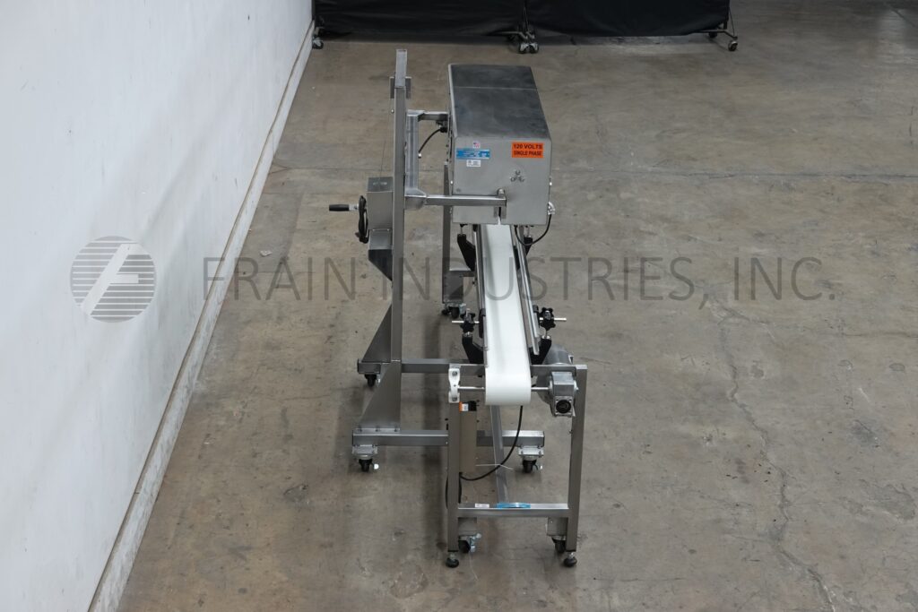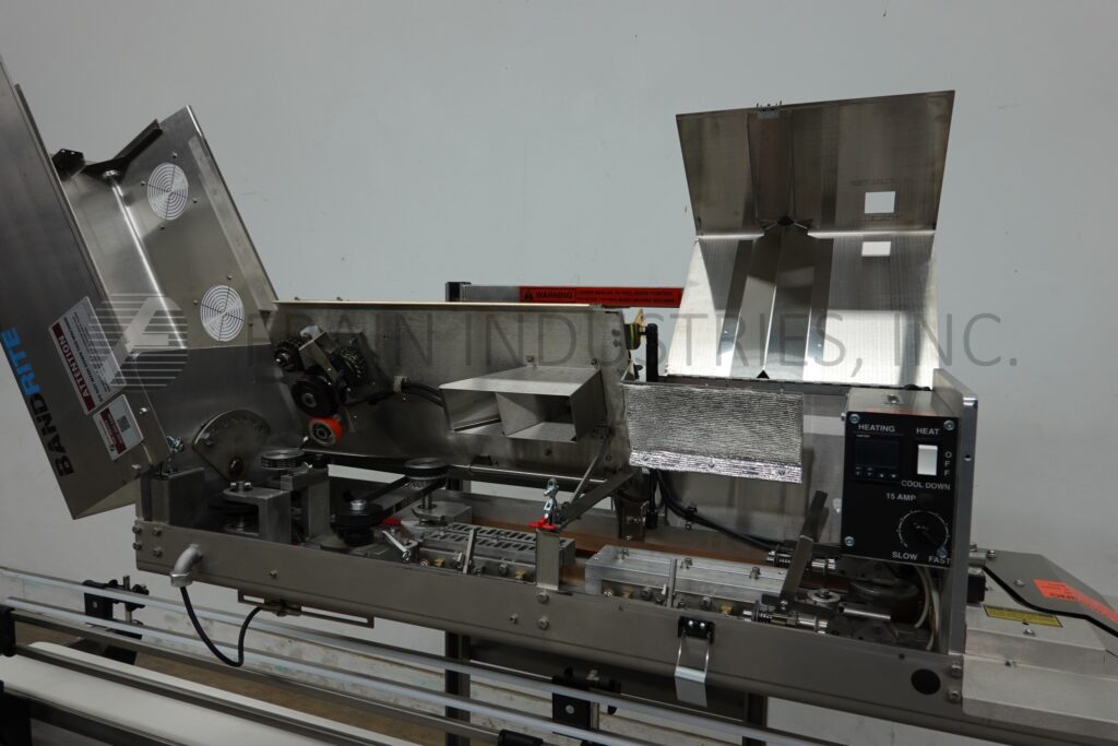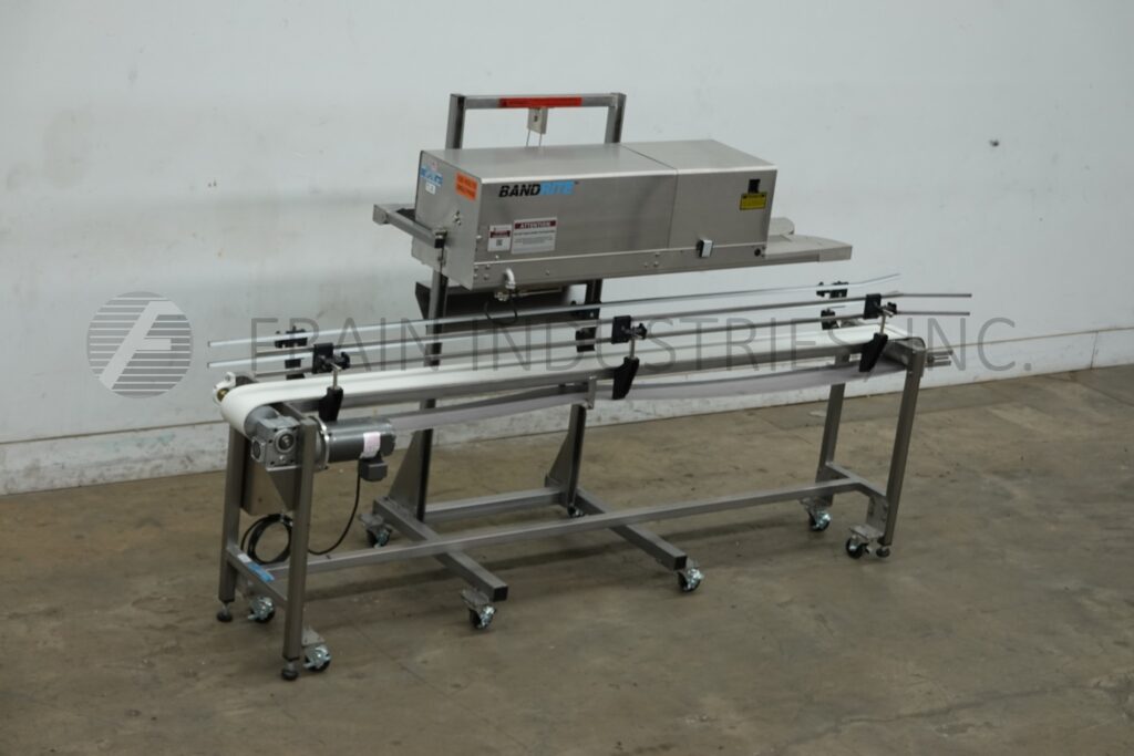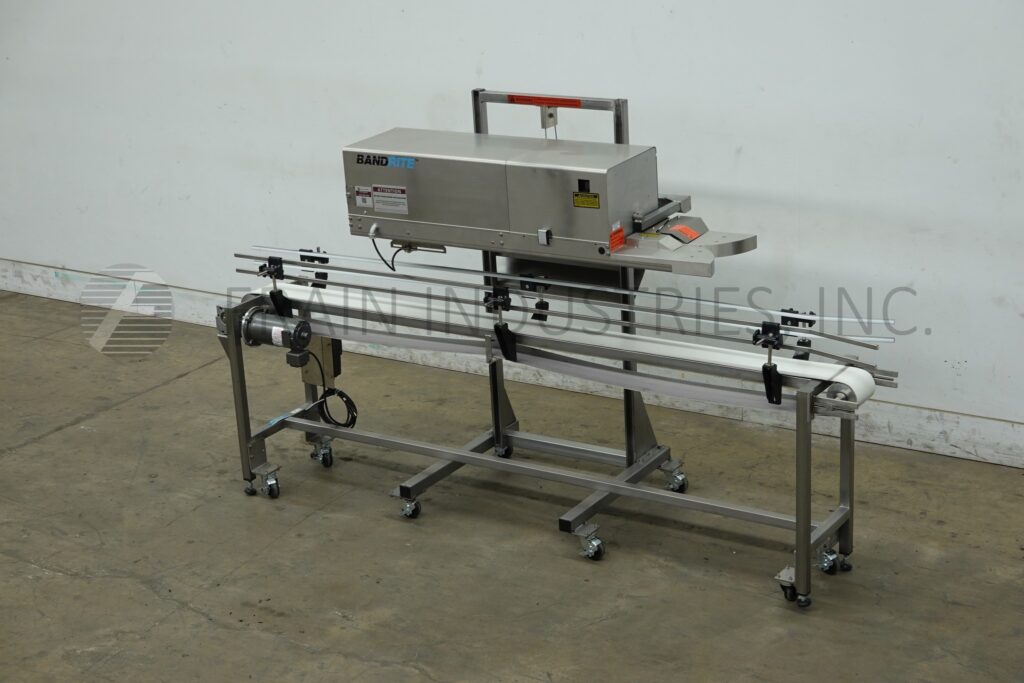 Back to All EquipmentBandrite Model 6000, Automatic, in line, band style bag sealer rated from 0 to 750 inches per minute with number of bags – depending on materials, application and operator dexterity. Equipped with angled sealing tilt away head has ¾" wide heat sealing and cooling bars with non-marking carrier belts, adjustable running speeds and temperature controls up to 600 Deg F. bag trim station, 1 line coder and hand crank height adjustable for different size bags. Heat and cool down on / off, temperature controller and speed control dial. Mounted over 6" wide x 96" long stainless steel belt conveyor with adjustable guides and powered by ¼ Hp drive.