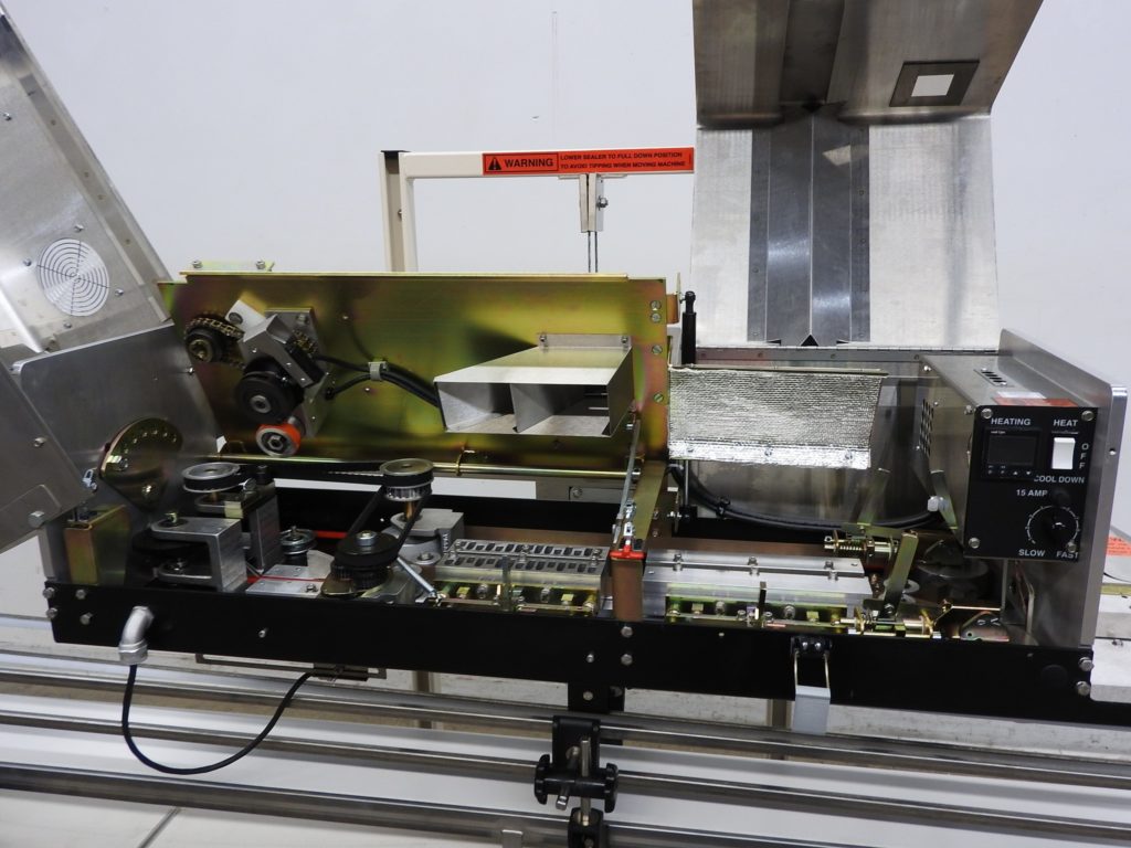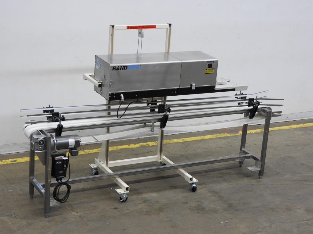 返回所有设备Bandrite 6000型,从右到左,自动,连续运动,在线,带风格,袋封口机额定从0到750英寸每分钟袋的数量-取决于材料,应用和操作者的灵活性。配备角度密封倾斜头有3 / 4“宽热密封和冷却棒无标记输送带,可调运行速度和温度控制高达600°f。袋修剪站,1线编码器和手曲柄高度可调不同大小的袋。加热和冷却开关,温度控制器和速度控制拨号。安装超过6“宽x 96”长的不锈钢带式输送机可调导轨和动力由¼马力驱动。