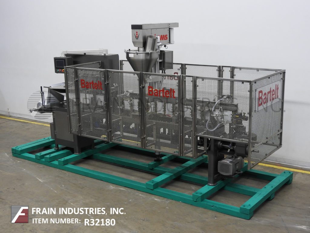 返回所有设备巴特尔IM712型,自动,水平,机械驱动,间歇运动,螺旋,成型,填充,密封机额定从12到60袋每分钟-取决于材料和应用。袋大小范围:2″至5-3/4″宽度;长度为2″到9-1/2″。7个″中心配有12个工位的链式送料袋输送机,成膜犁,张紧辊和带切断工位的袋侧密封,吸盘开袋器,(1)带控制器的螺旋填料,纺车顶部袋除尘,和带袋取下工位的热密封条。18″外径最大膜卷,带20″最大卷筒纸宽度,带1″外径芯。控制面板有PLS控制与螺旋钻,启动,运行,慢跑,注册,顶部,底部和侧热密封控制开关,启动,停止e-stop和web feed按钮控制。安装在重型基础框架。