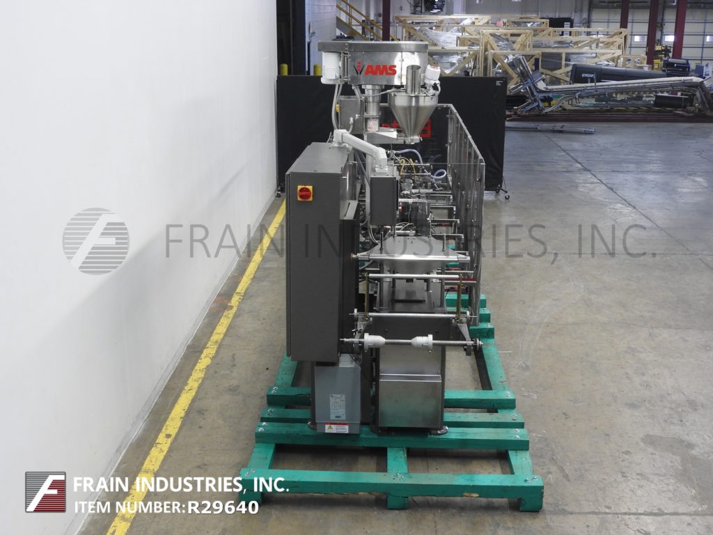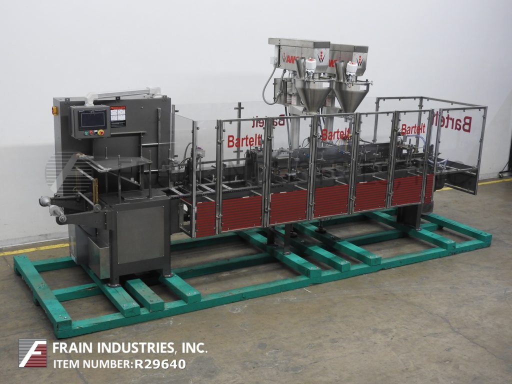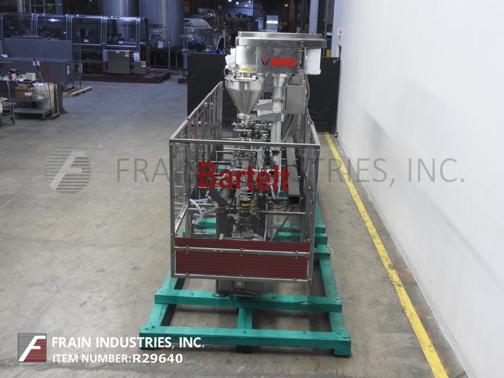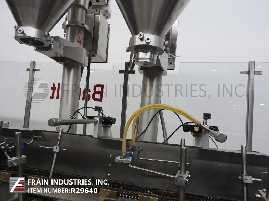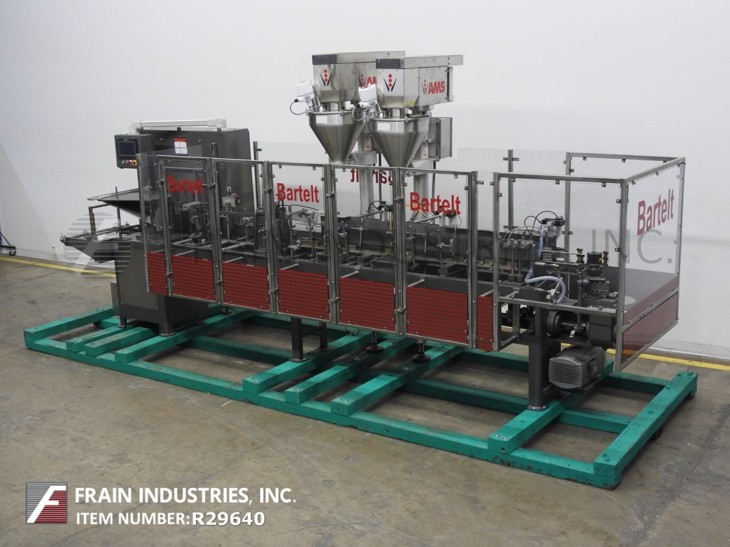 返回所有设备巴特尔IM714型,全自动间歇运动形式,填充,密封,机器额定从10到100袋每分钟-取决于材料和应用。袋大小范围:2"至9-1/2"高度2"至5-3/4"宽度和2"厚。在7"中心配备14个工位,双螺旋填料,产品沉降器和袋振动筛停止,清洗和密封工位与真空pickoff。控制器有PLS 5000电子凸轮控制。安装在重型框架与联锁安全保护。最后跑速溶麦片。