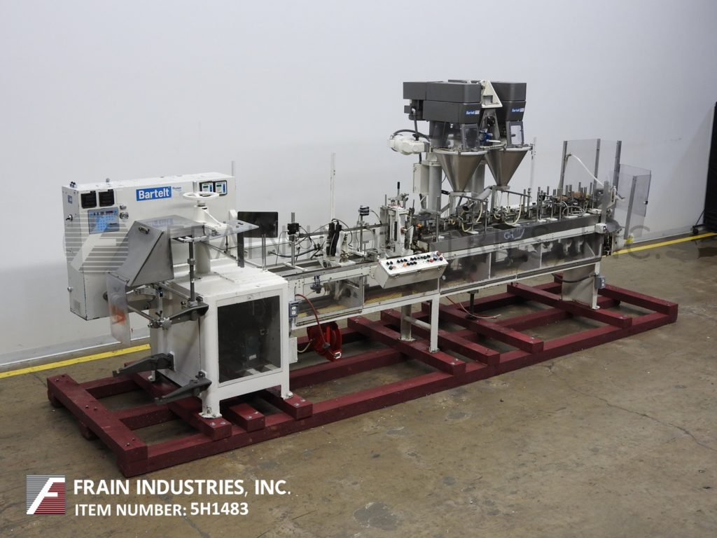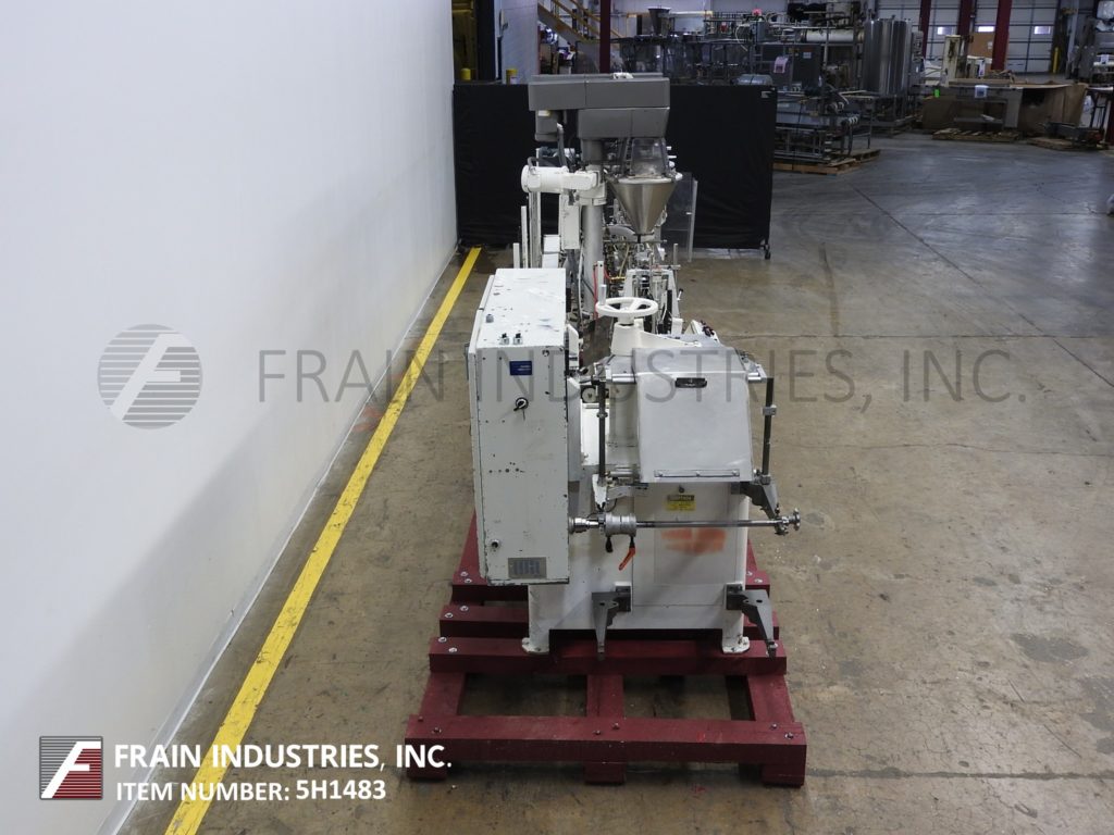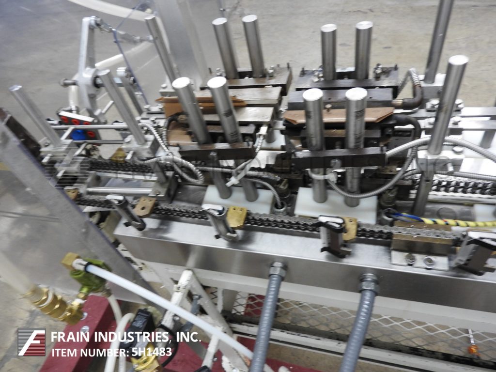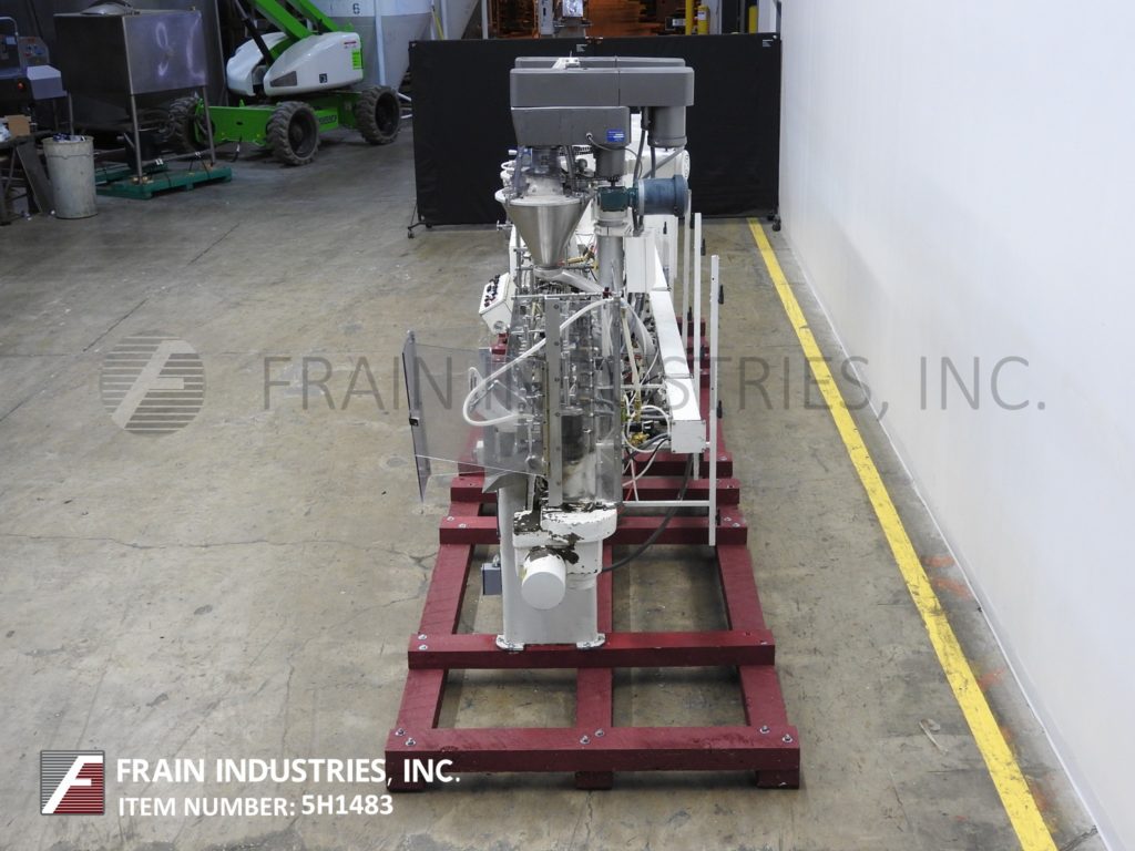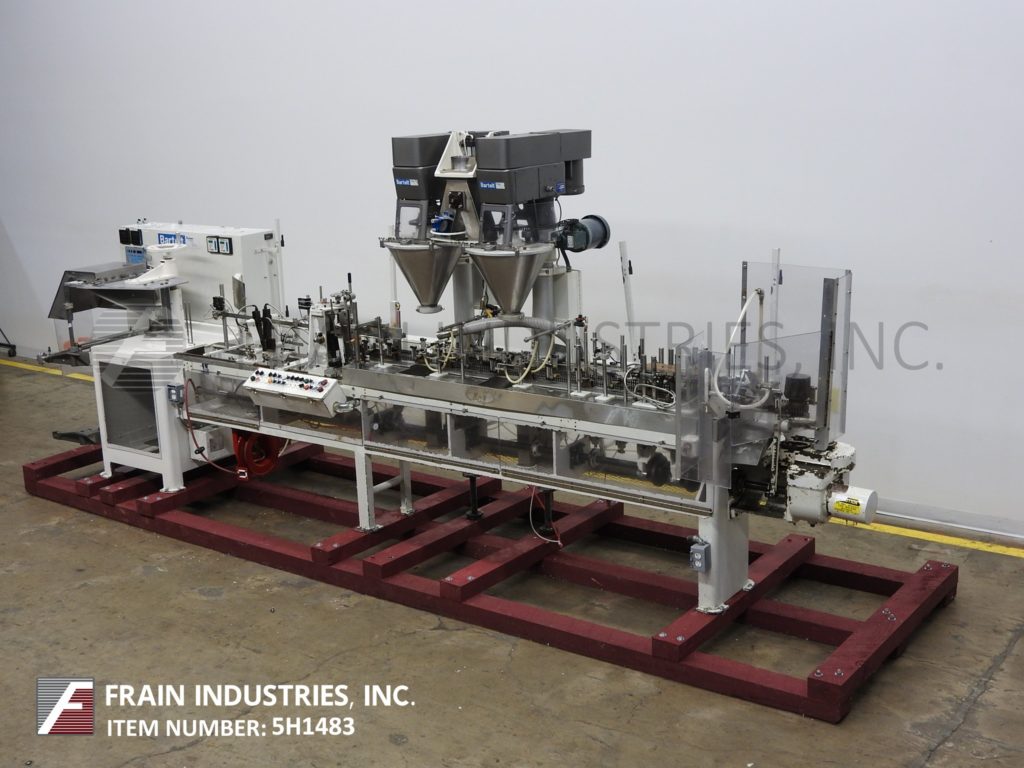 返回所有设备巴特尔IM714型,自动,水平,机械,间歇运动,螺旋,成型,填充,密封机额定从14到100袋每分钟-取决于材料和应用。袋大小范围:2"至5-3/4"宽度;长度为2"至9-1/2"。配备有链给料袋输送机与14个站设置在7"中心,薄膜成型铲,张力辊和袋边密封与切断站,吸盘袋开瓶器,(2)螺旋填料与个别控制器,纺车顶部袋除尘和(2)热密封棒与袋取下站。最大外径为18英寸的胶片卷,最大卷筒纸宽度为20英寸,最大外径为1英寸。控制面板有PLS控制与螺旋钻,真空,填充头,1和2加热器,和登记上/关闭开关,与启动,停止e-stop和web feed按钮控制。安装在重型基础框架。