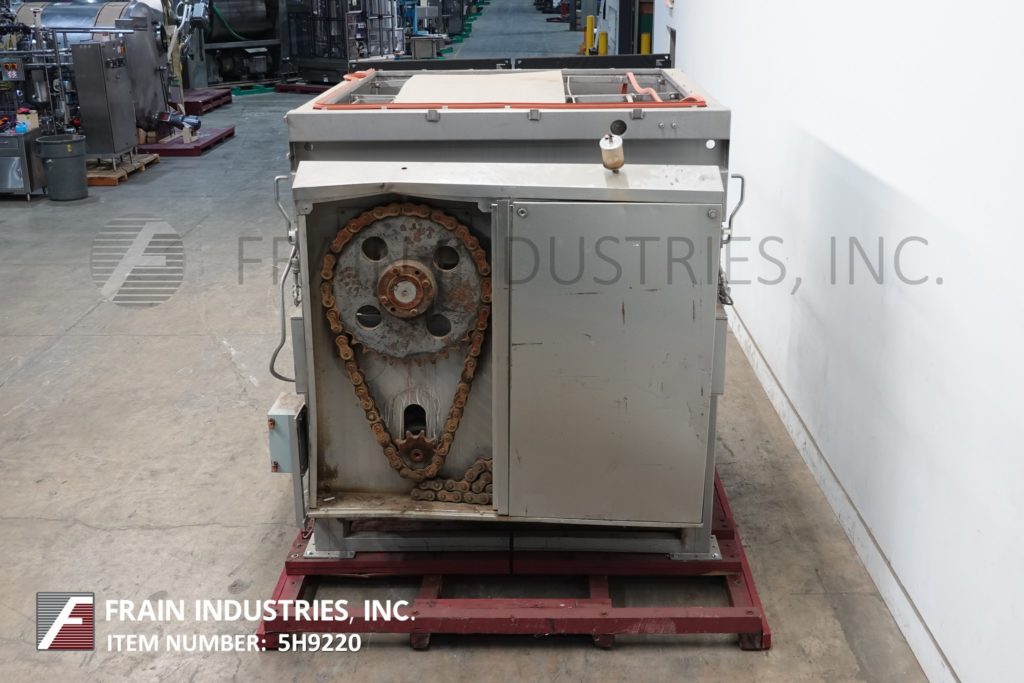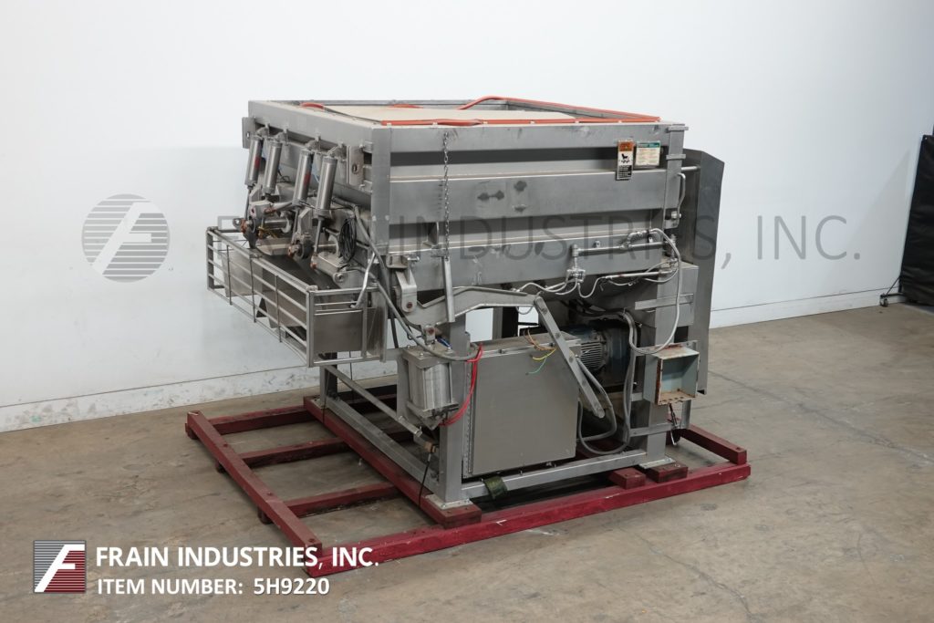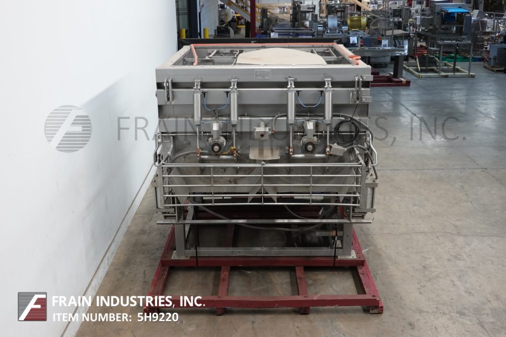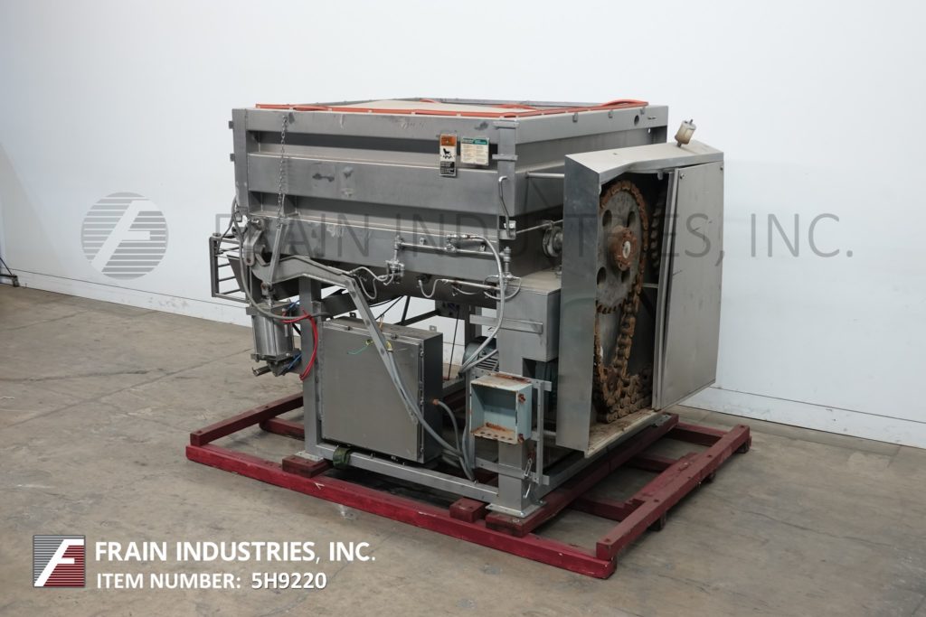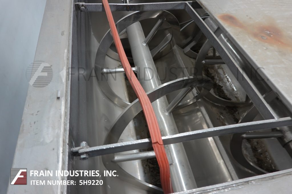 返回所有设备Blentech公司,型号DM-34072-RVS, 304不锈钢双槽带状搅拌机与产品磅每小时-取决于材料和应用。总容量:120立方英尺。工作容量:100立方英尺。双槽尺寸:72“长度;69年“宽;45”的深度。配备(12)蒸汽喷射端口,3“宽x½”厚不锈钢带和双气动排气门与40“地间隙。由(2)20马力的链条到链轮电机驱动,带有安全保护装置。安装在(4)腿基架上。