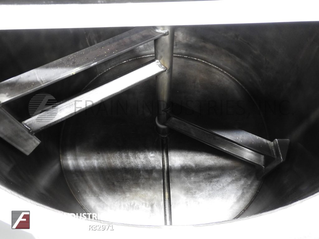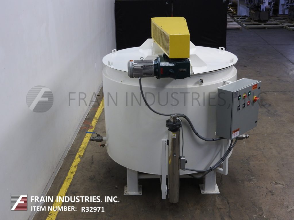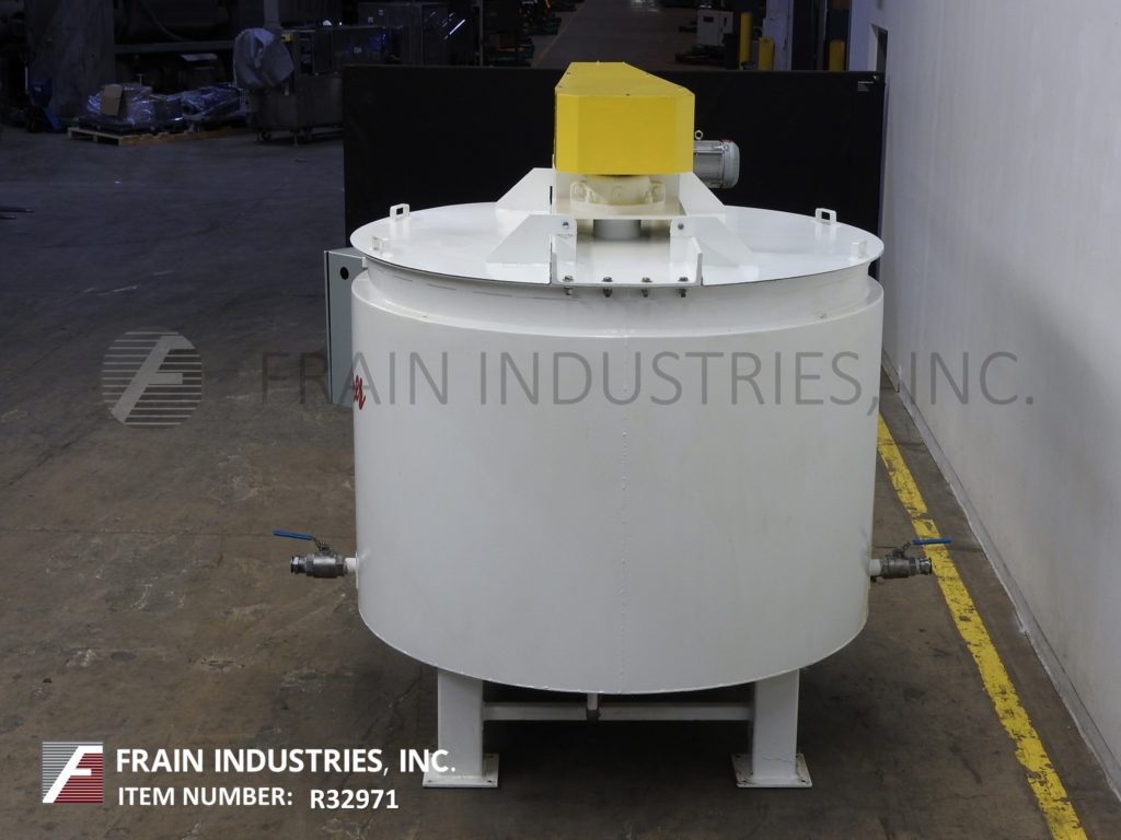 返回所有设备Blommer 7,500 LB容量,垂直,碳钢,低压水夹套,巧克力熔化和混合容器。内腔调光:72“ID x 48”直壁。配备平顶,双重翻转顶盖和桥式扫掠搅拌,5千升驱动器,带有安全保护和4“OD轴,带侧刮桨。全低压水夹克额定到5psi,内部挡板引导水流夹克,(4)2“od侧和(2)1-1 / 2”OD底部螺纹夹套IN /网点。碟形底部有5-1 / 2“OD螺纹中心底部放电,12”落地间隙并安装在(4)腿。
