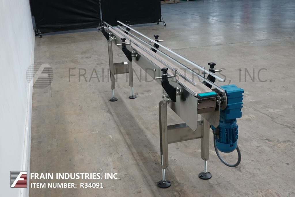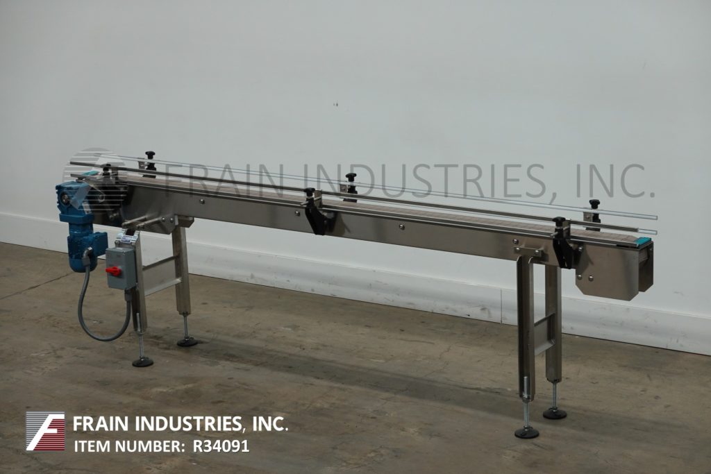 BMI不锈钢框架带式输送机。配备4½“宽x 120”长Delrin桌面产品输送带,可调节滑道,31“至37”在进料和排出高度范围。(4)支腿安装在不锈钢支腿框架上,配有调平垫。